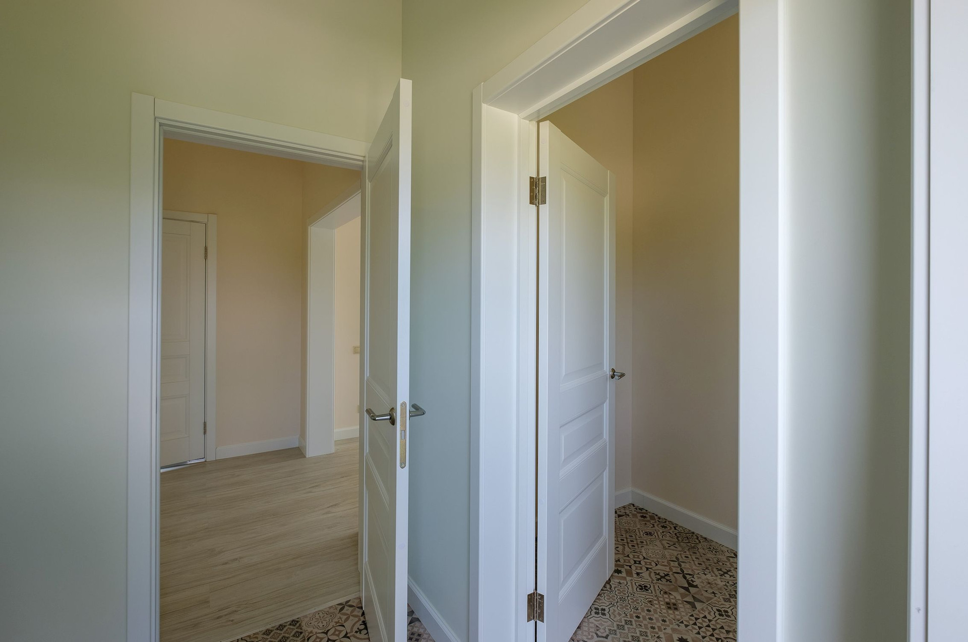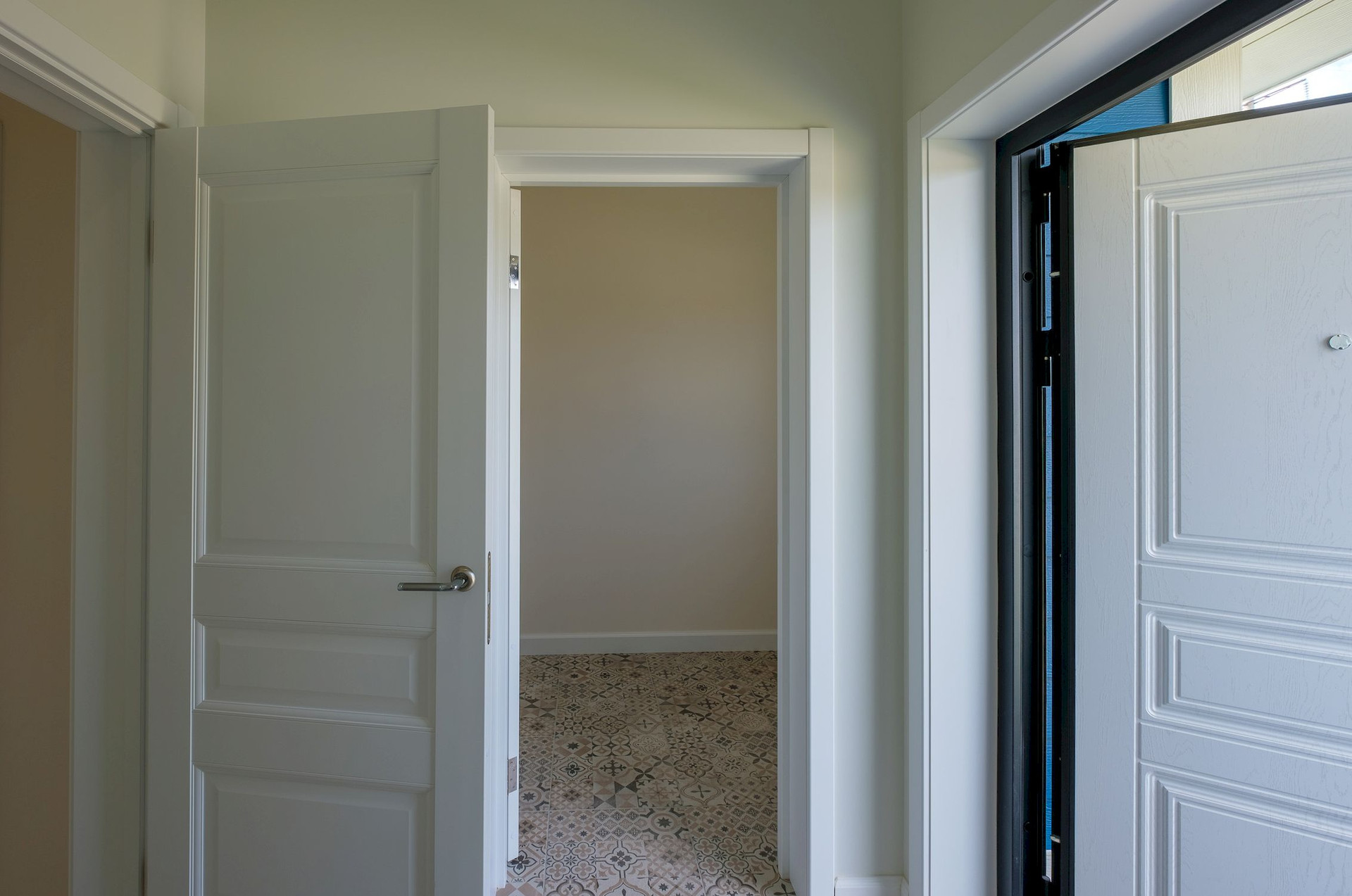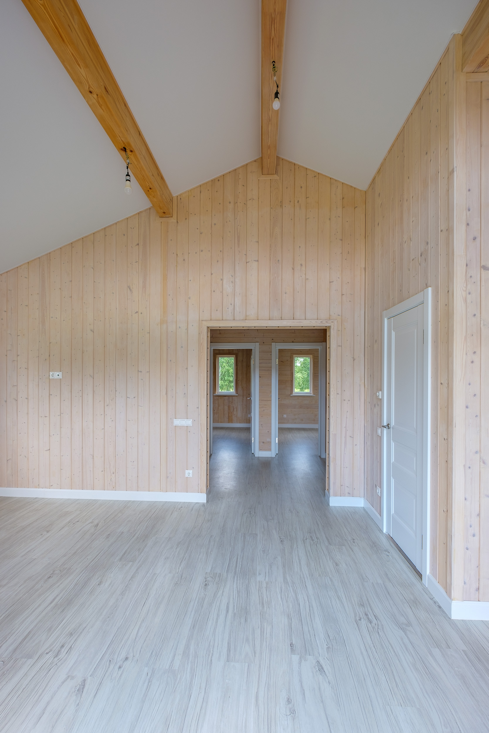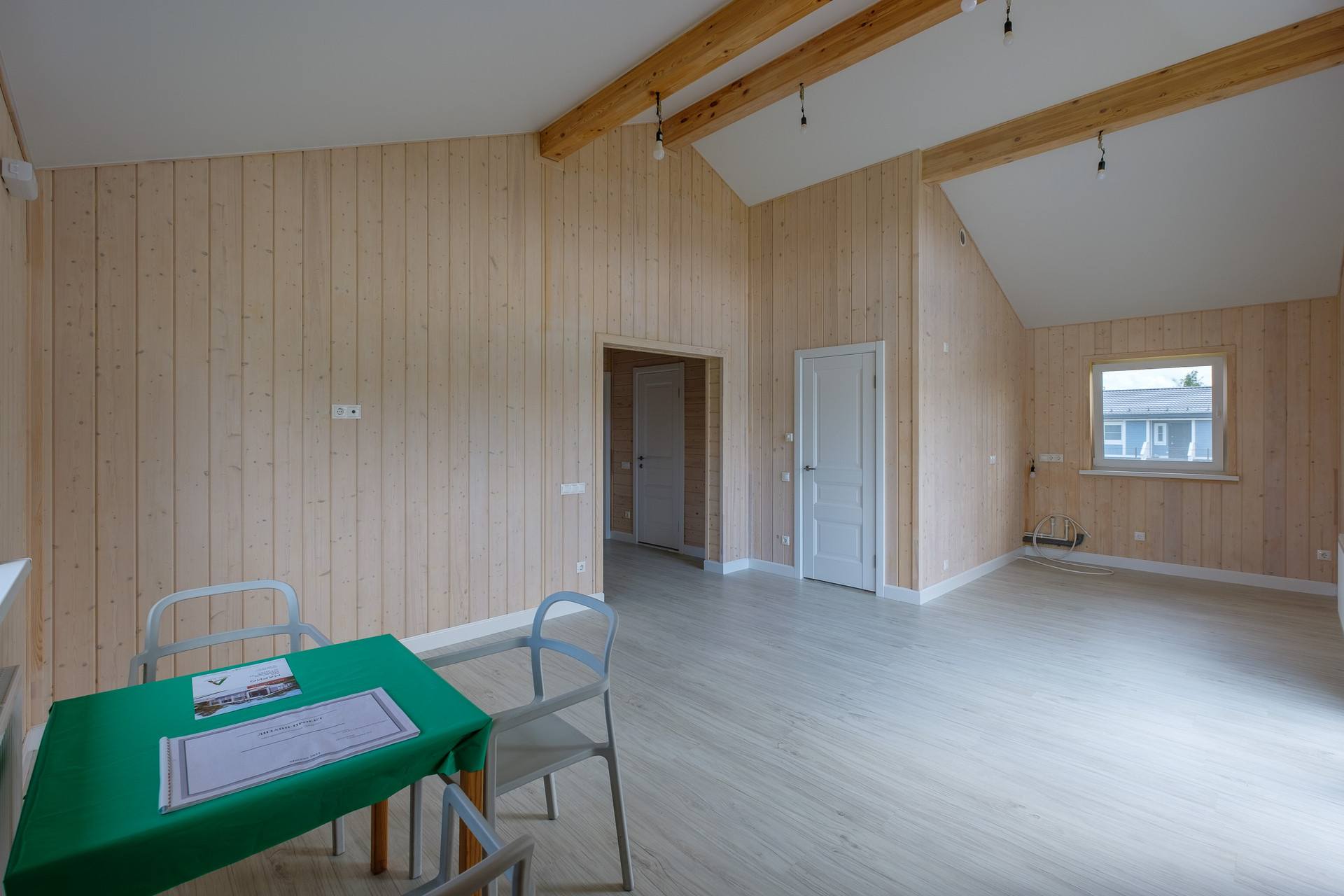 Планировка: Общая площадь дома — 102 м². В доме просторная кухня - гостиная с панорамными дверями и выходом на открытую террасу 12 м², три отдельные спальни, гардеробная, ванная комната, бойлерная), прихожая и холл.