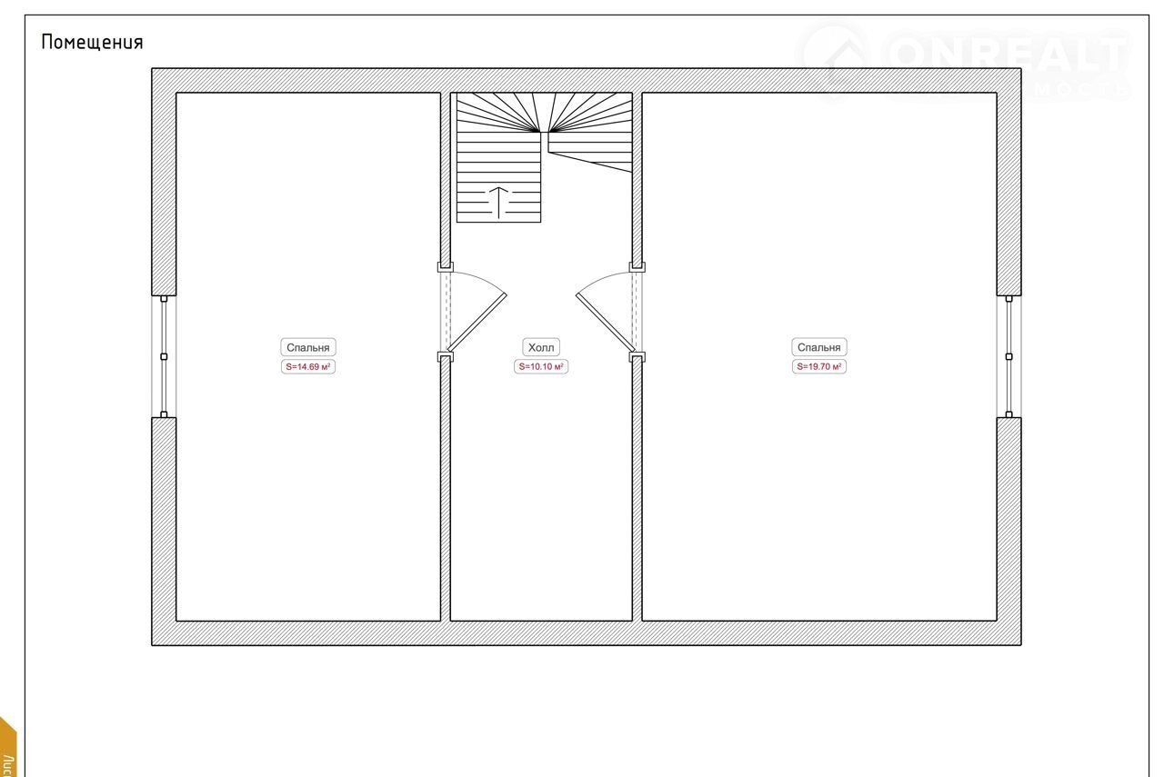 2-й этаж - холл (10,1 м2), две спальни (19,7 м2 / 14,7 м2).