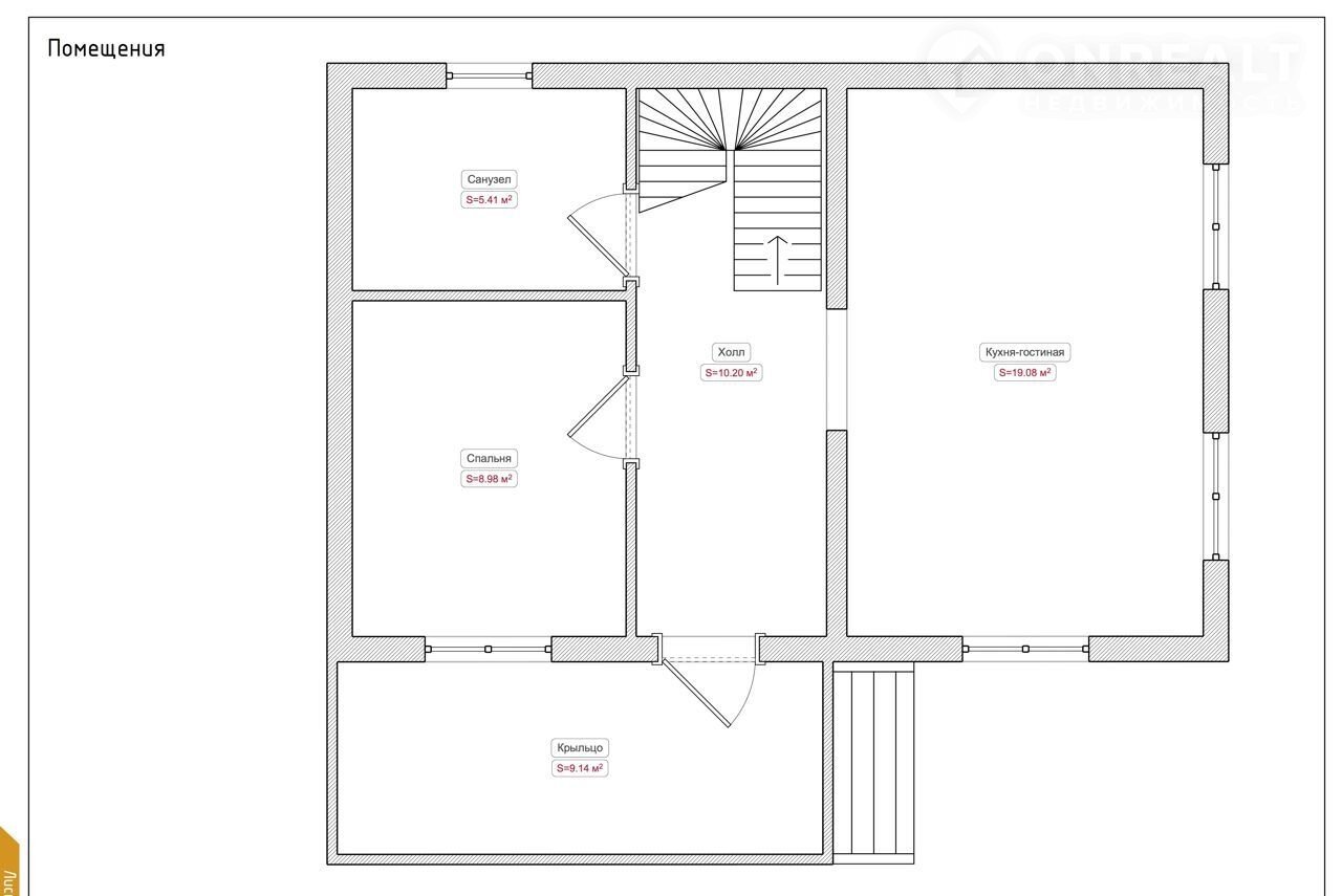 1-й этаж – холл (10,2 м2), кухонная зона – гостиная (19 м2), спальня (9 м2), санузел (5,4 м2), крыльцо (10 м2);