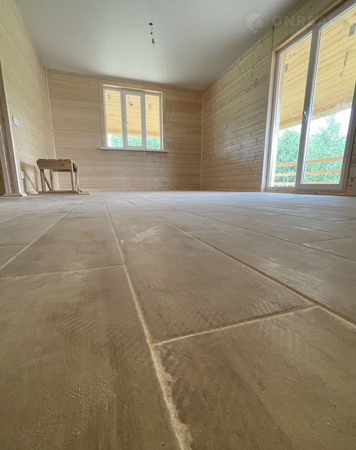 На полу первого этажа выполнена полусухая, цементная стяжка.
