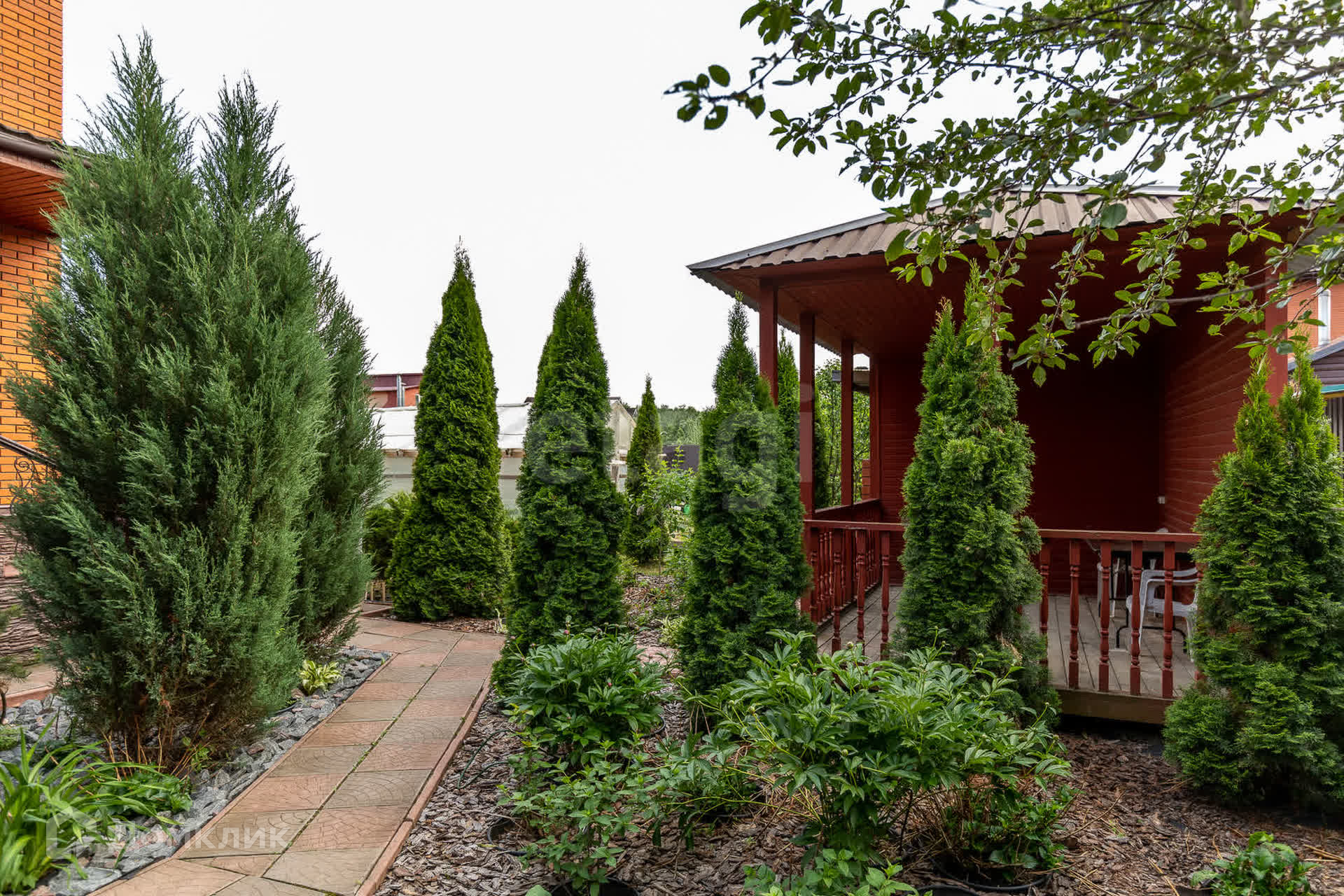 По периметру дома посажены вечнозелёные хвойные деревья туя. Помимо этого очень много плодовых деревьев, а так же кусты малины и смородины.