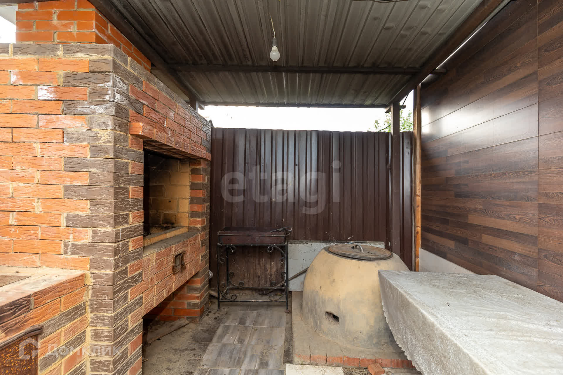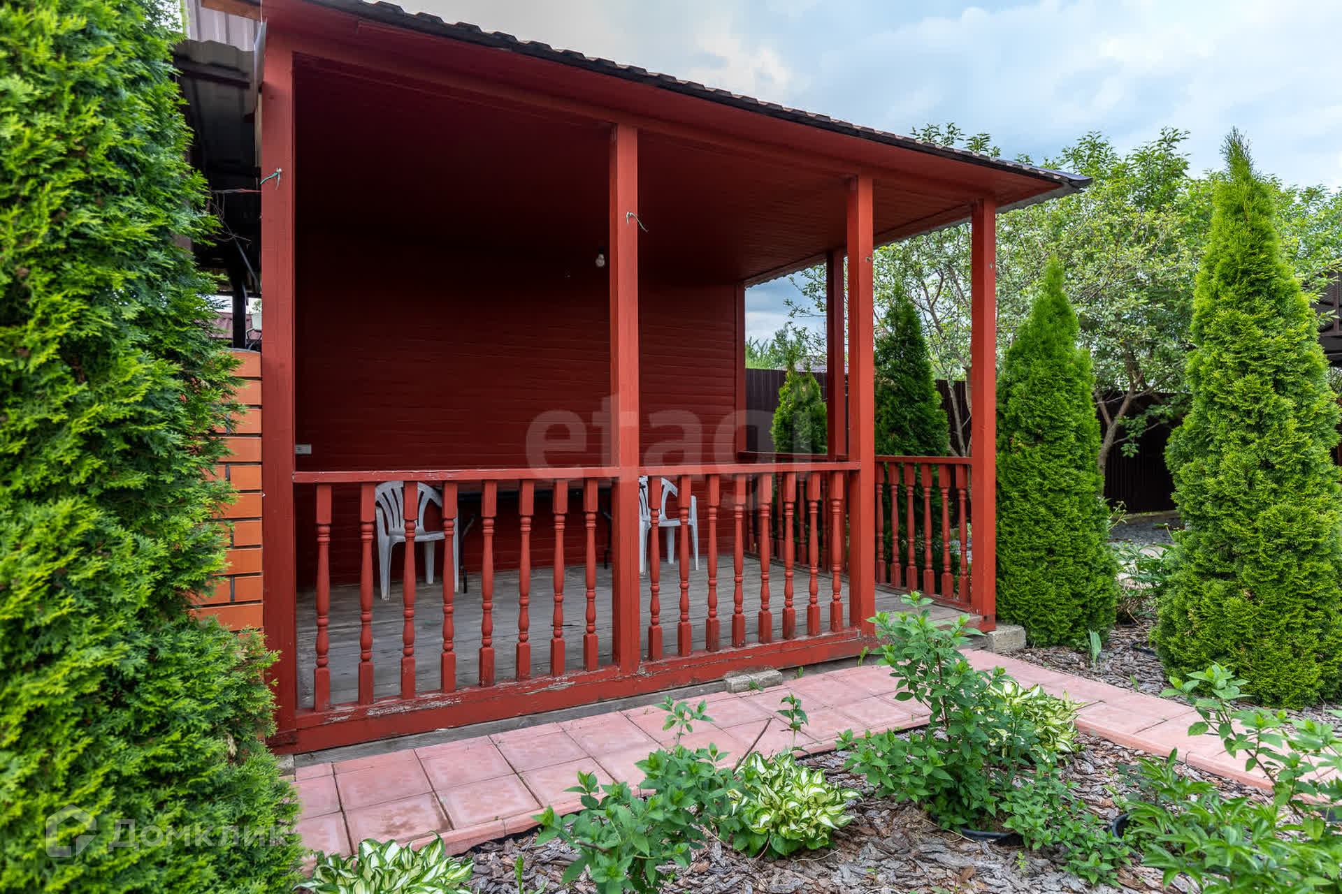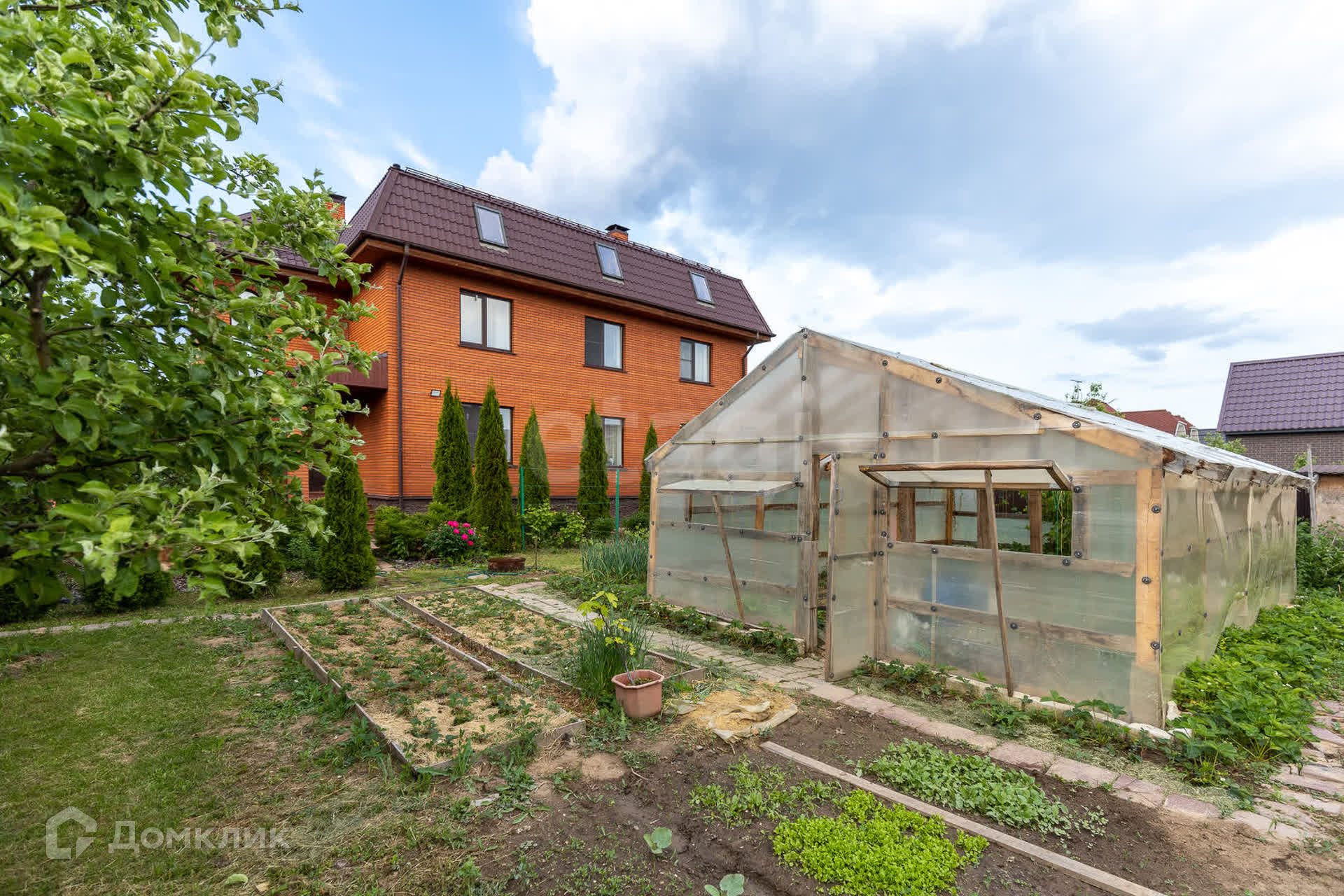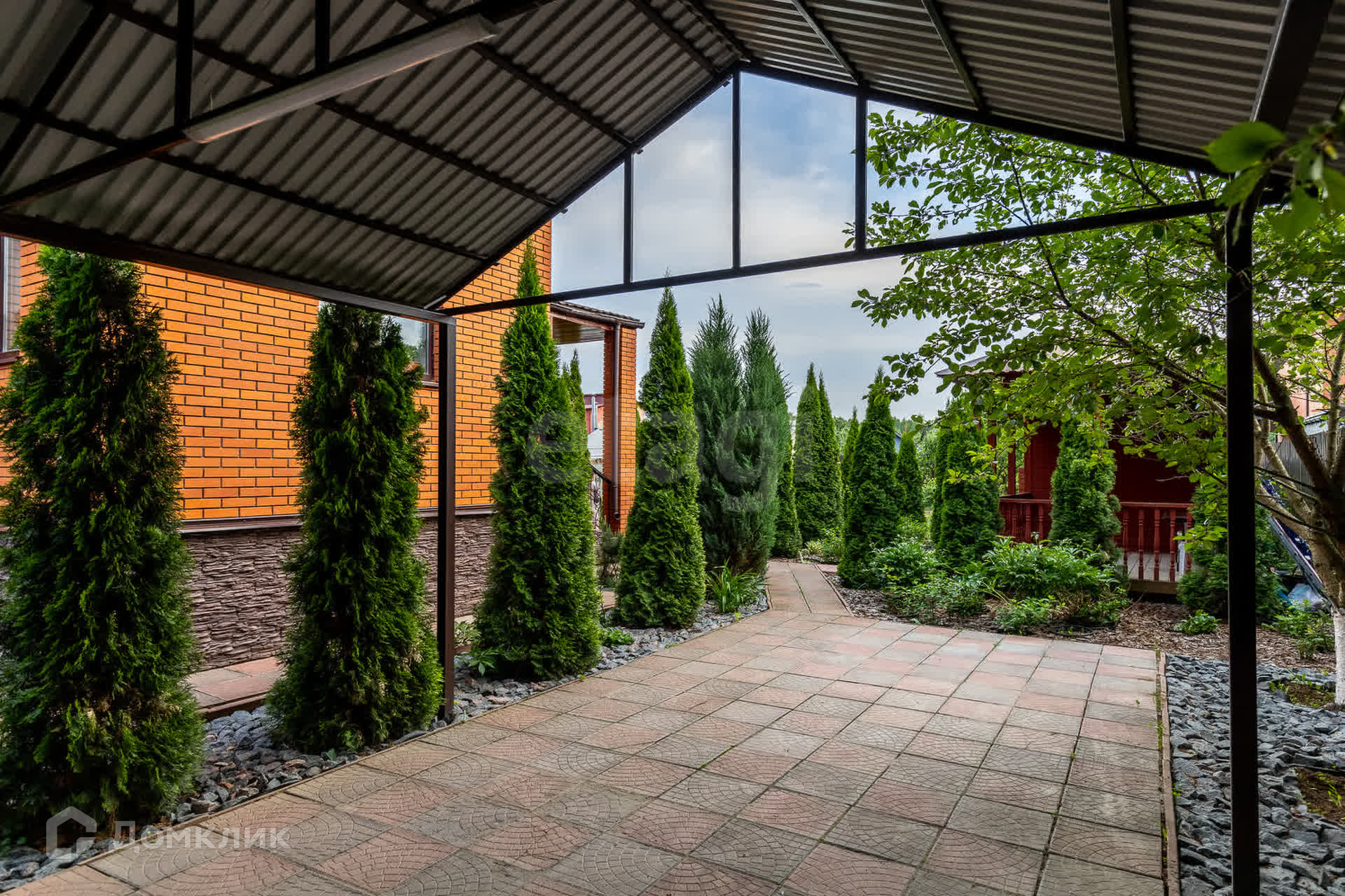 Во дворе расположена мангальная зона с тандыром, летняя беседка, парник и зона для парковки машины. Пешеходные дорожки проложены плиткой.