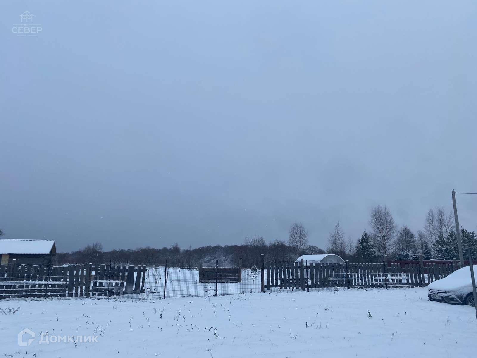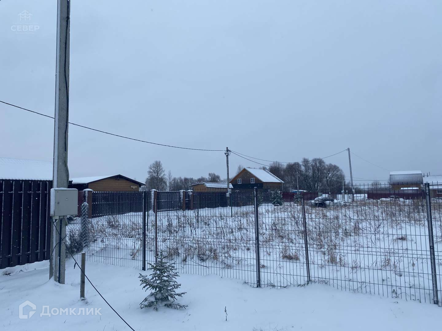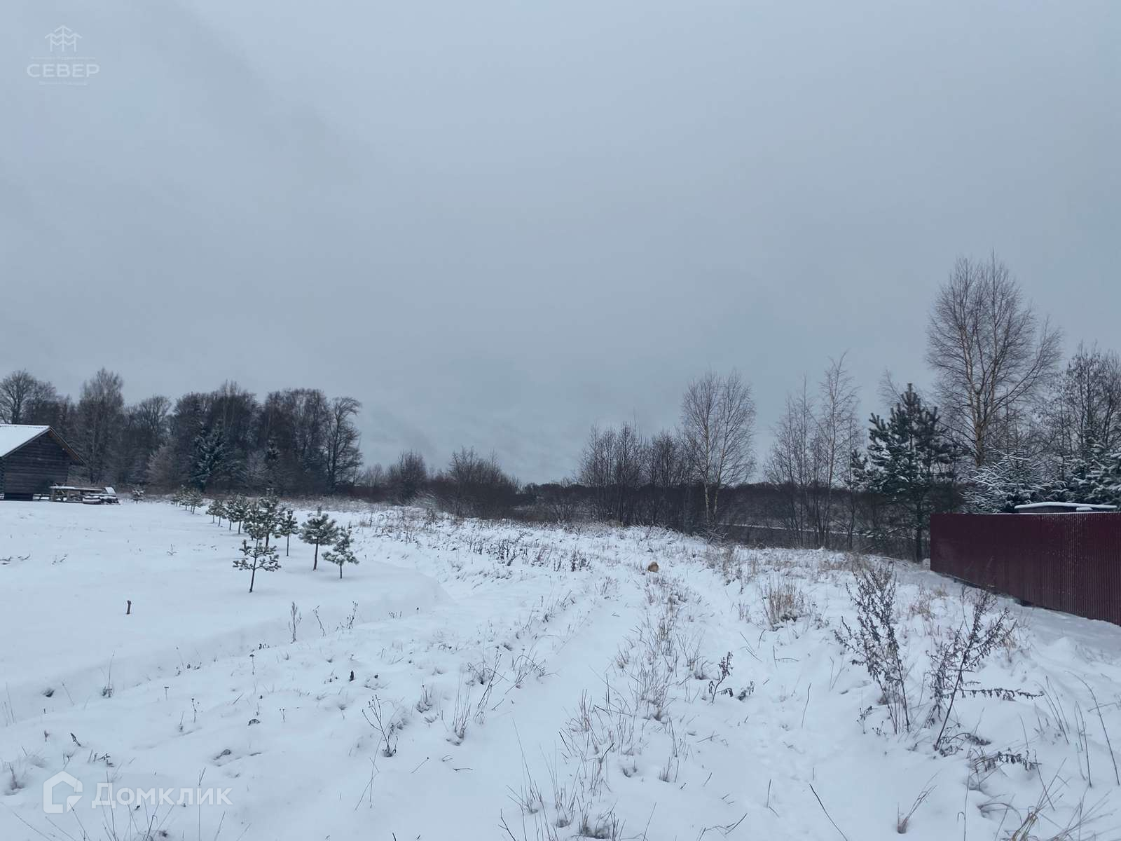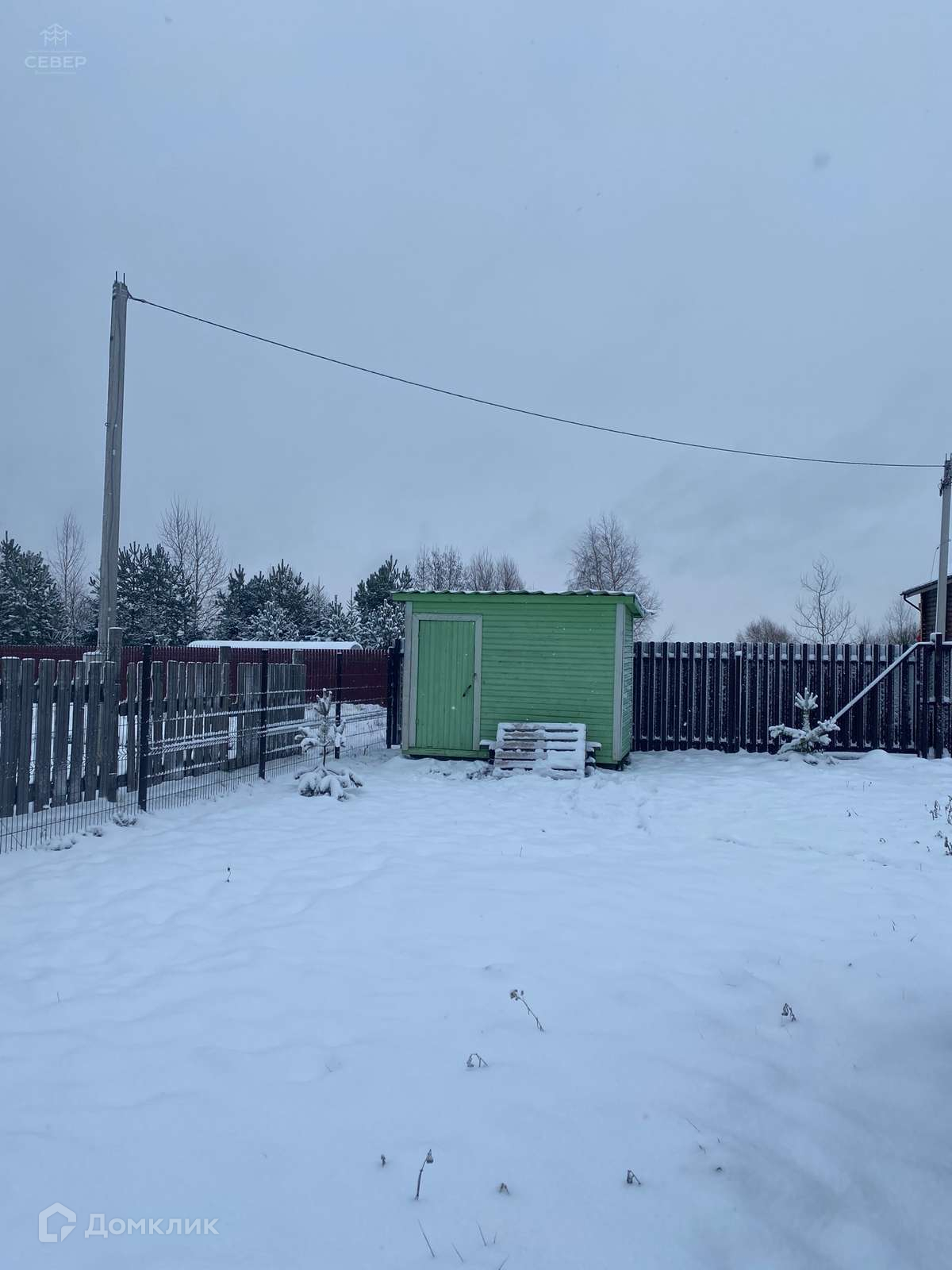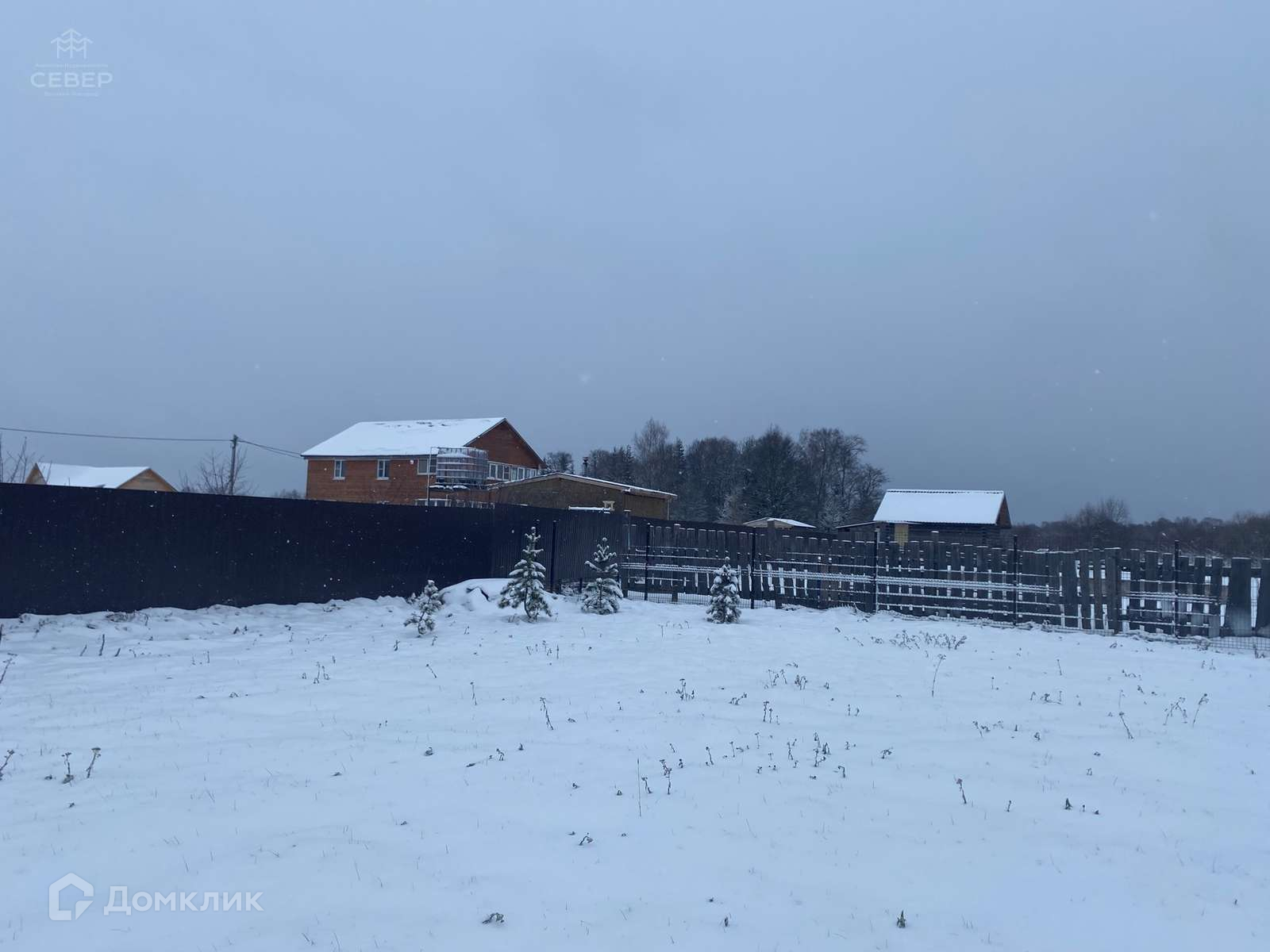 - На участке бытовка, участок ровный, посажены 2 елки, 2 сосны и 4 кедра.