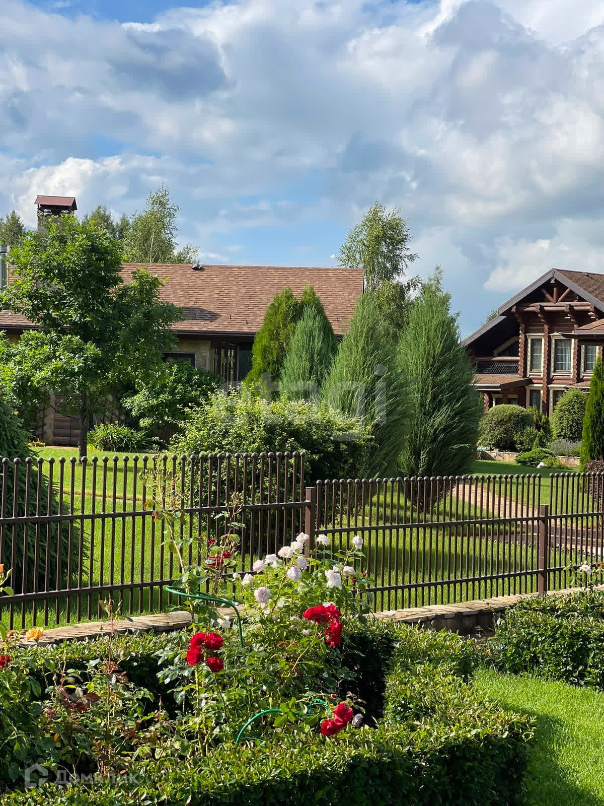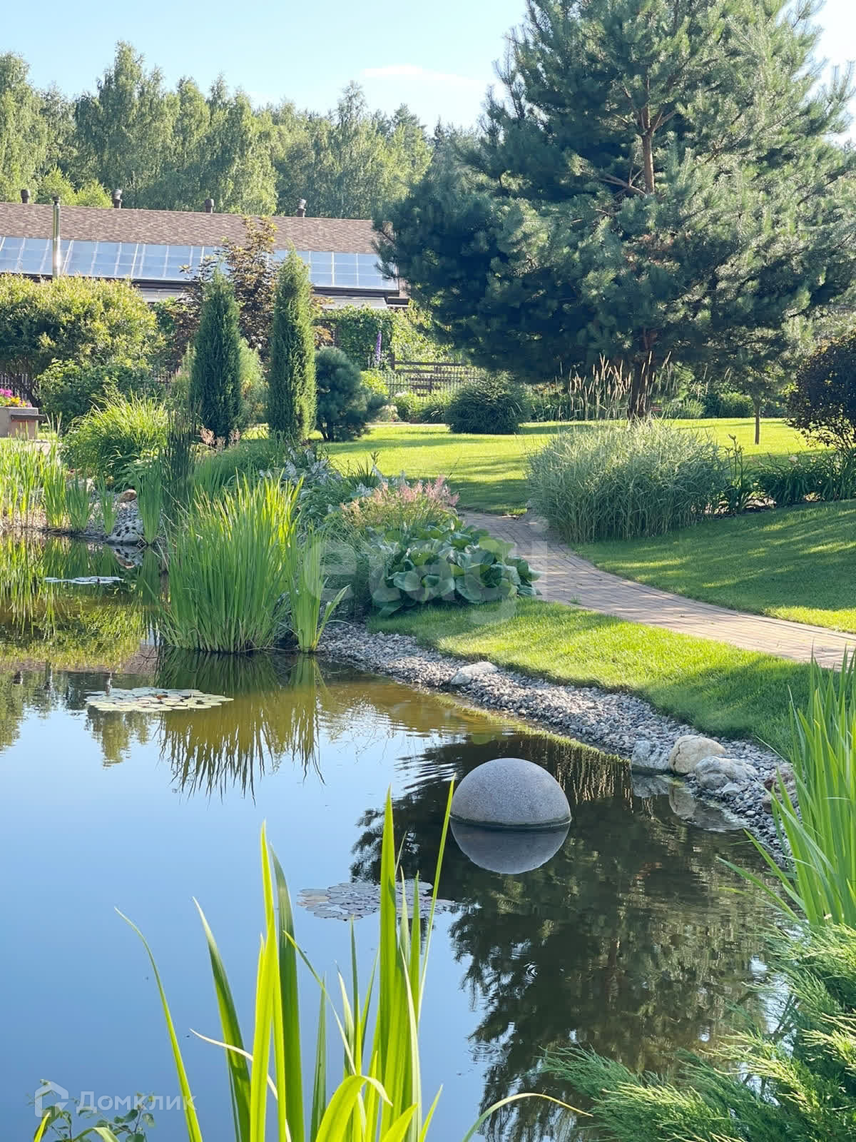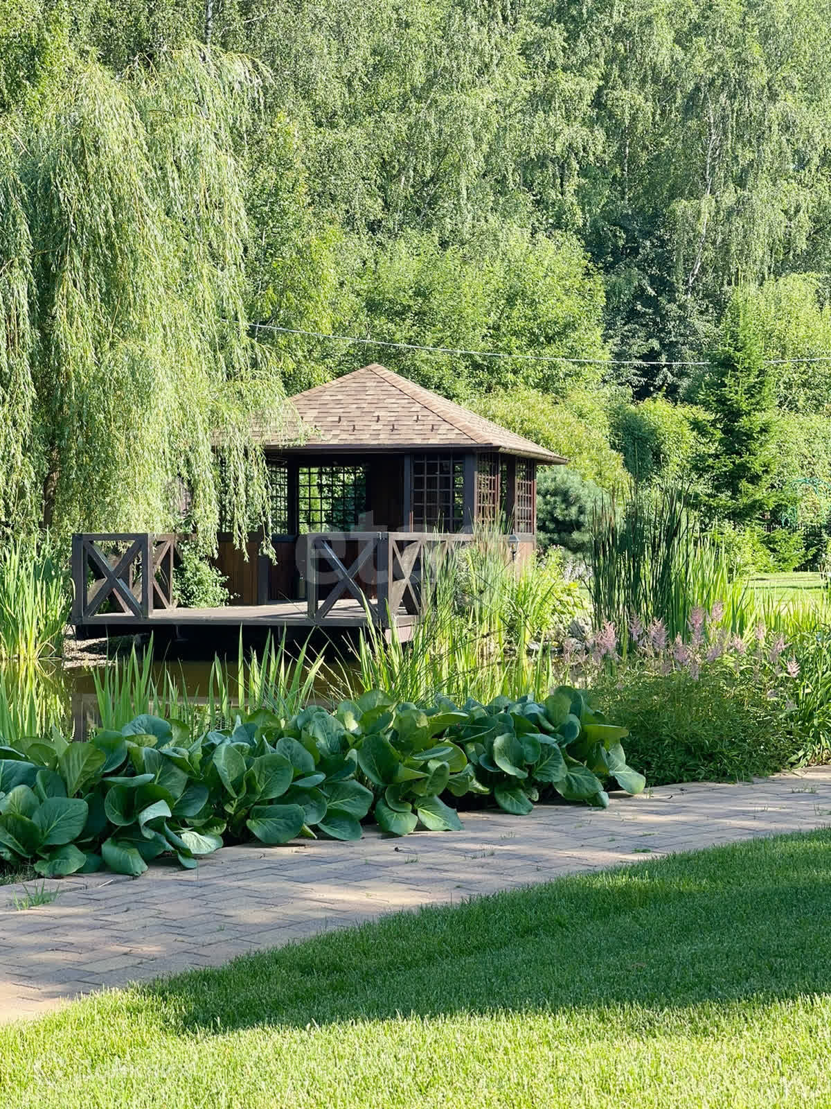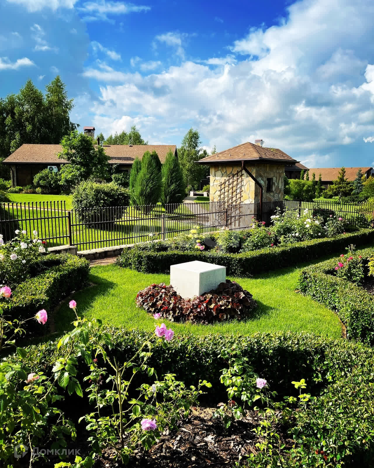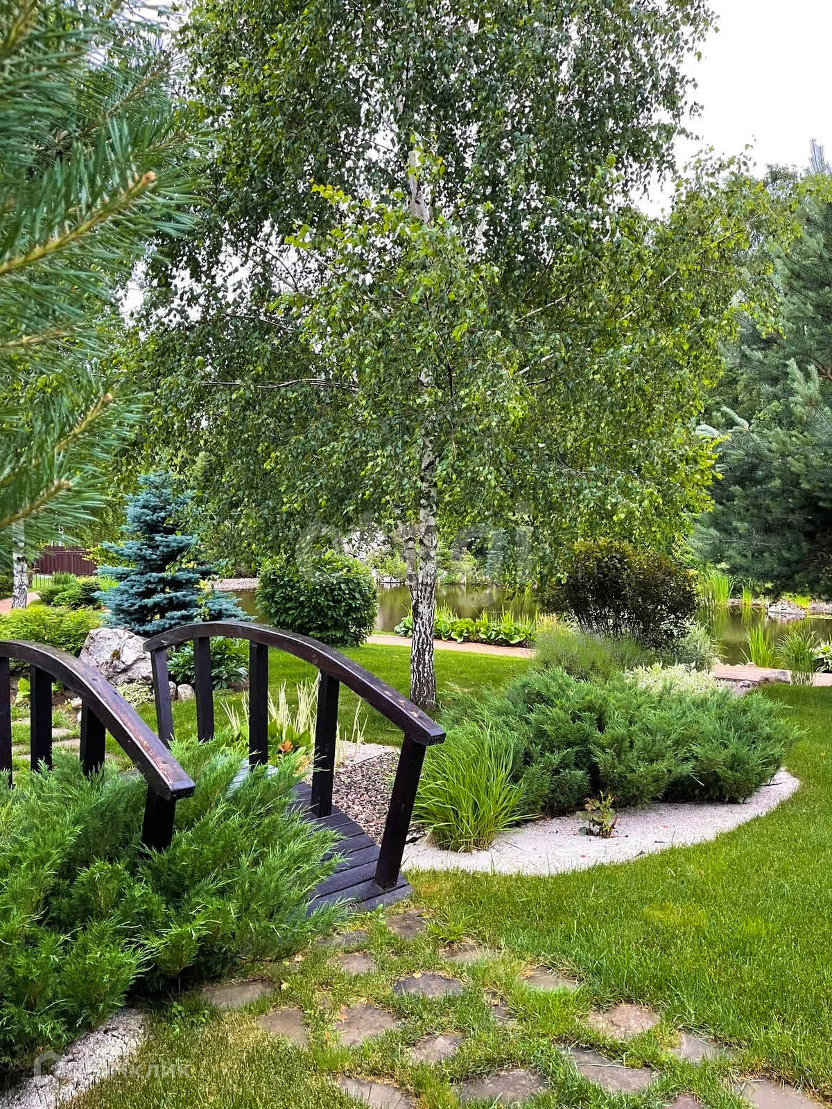 ⁃ на участке также располагаются: гостевой дом (80 м²); банкетный зал; баня; беседка; пруд; водопад; гараж; хозяйственные постройки