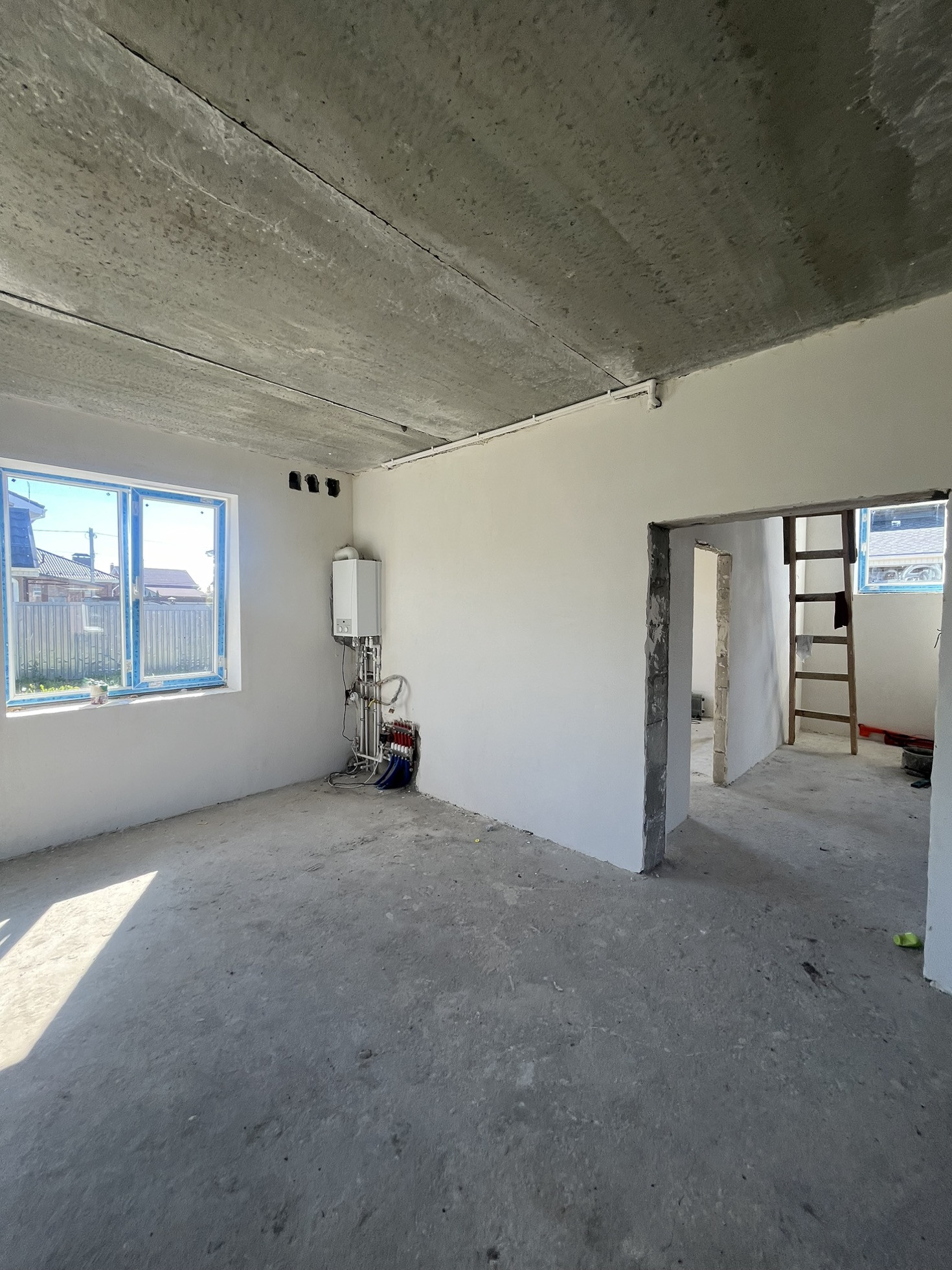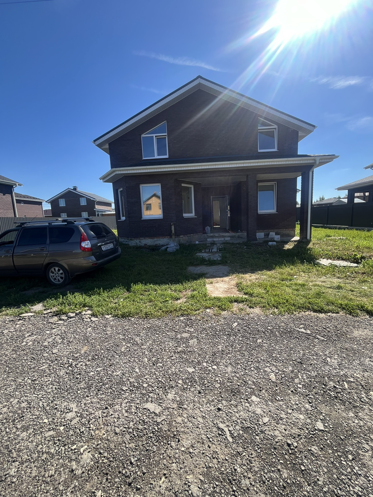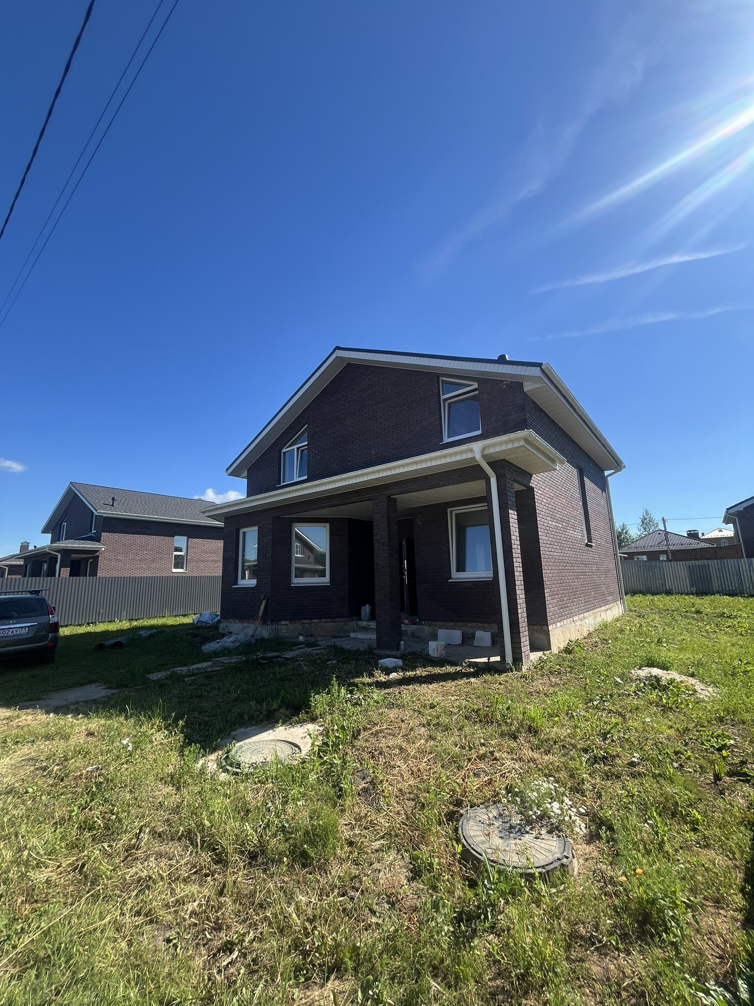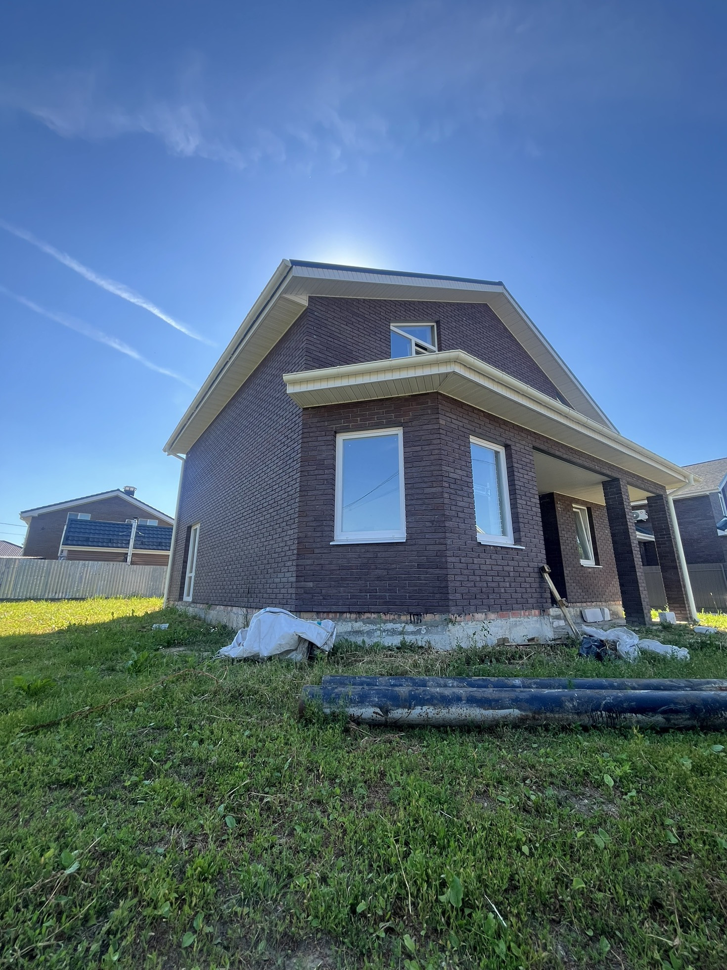 Дом новый, газ, вода, свет, из облицовочного кирпича и газоблока. Кровля из битумной черепицы, внутри отштукатуренные стены