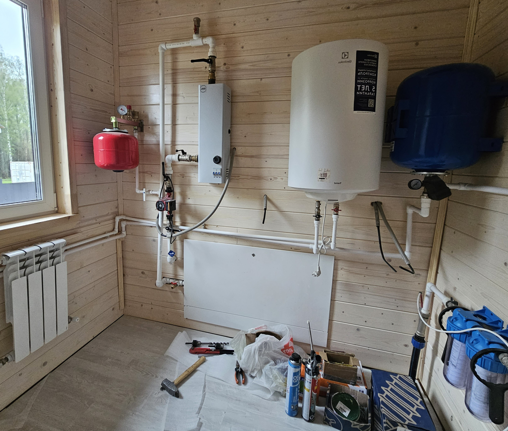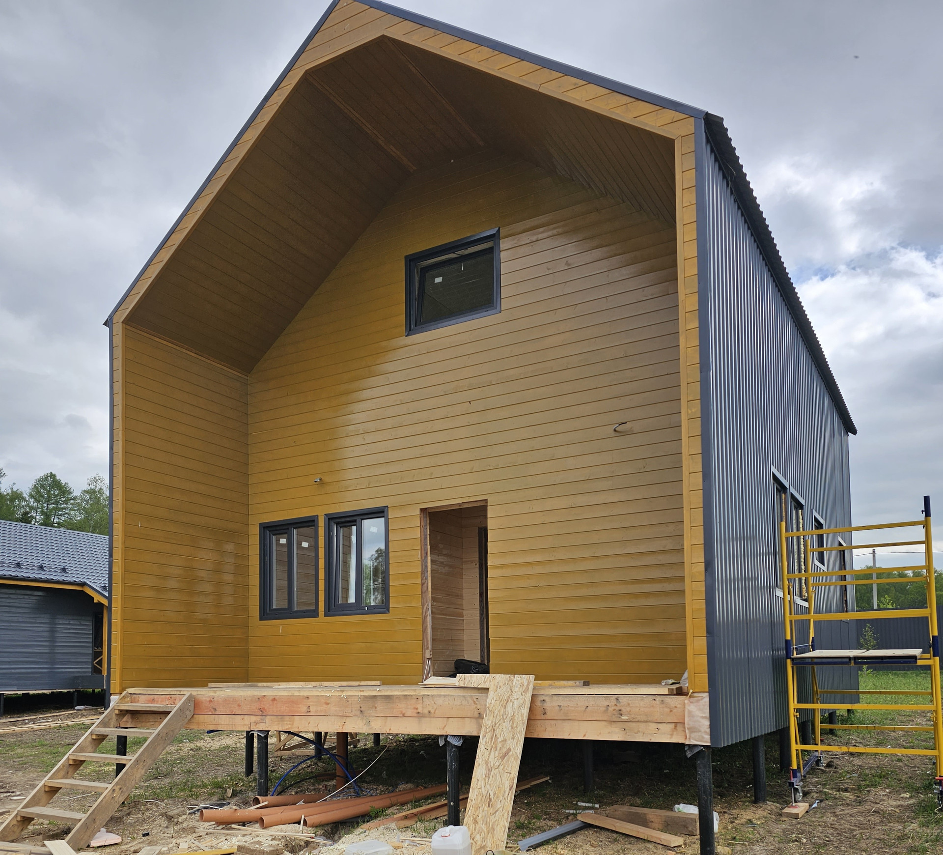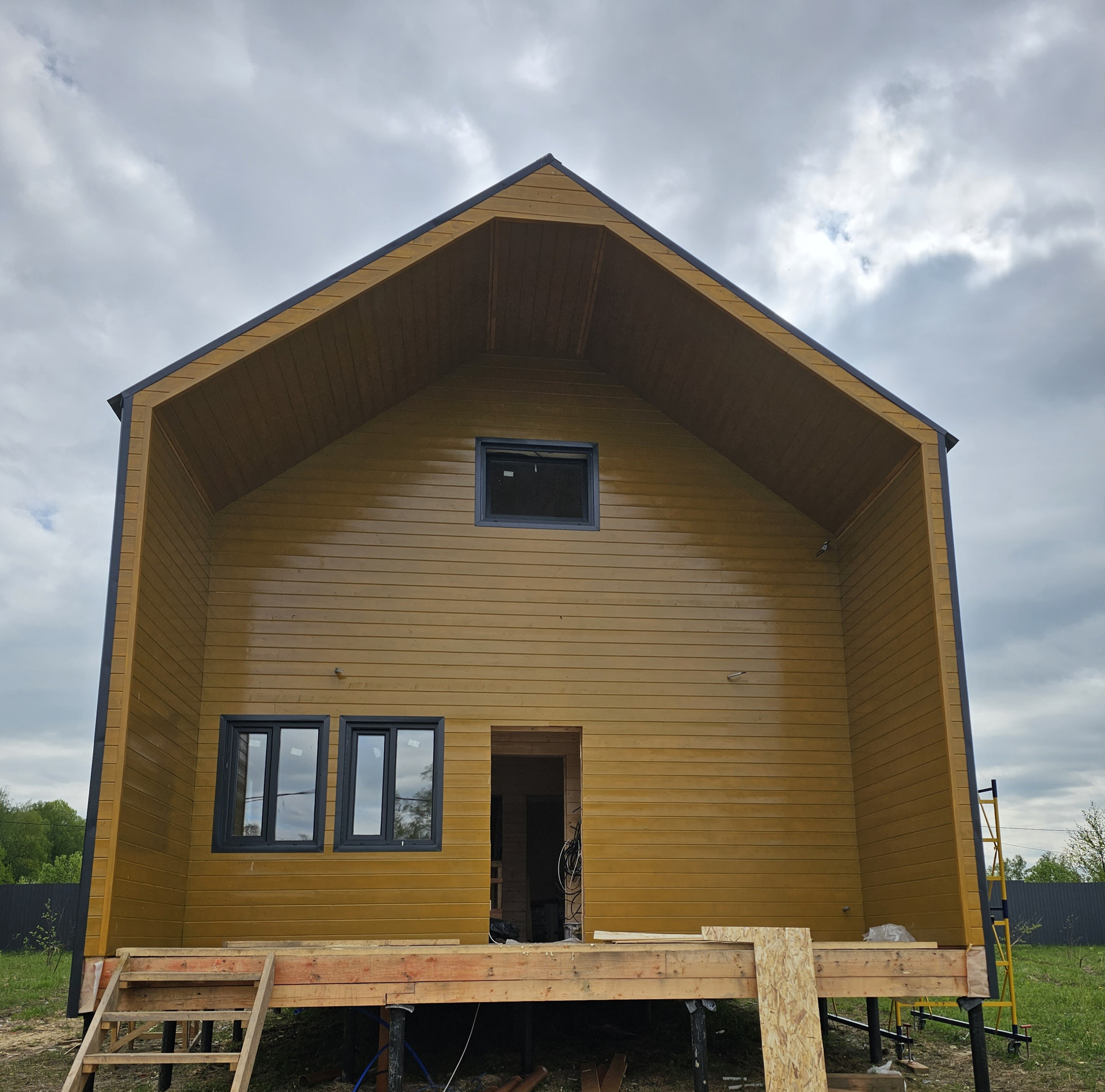 Отделка стен внутри и снаружи имитацией бруса 130мм. Покраска снаружи в три слоя краски, первый из них сделан до монтажа. Окна пластиковые, двойной стеклопакет, снаружи в цвет стен. В доме выполнены все необходимые инженерные работы. Отопление, водоснабжение, электрика. Скважина 40м, септик Топаз.