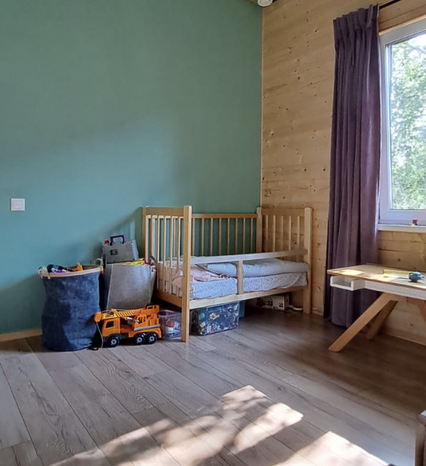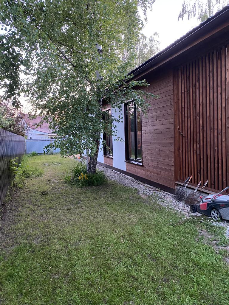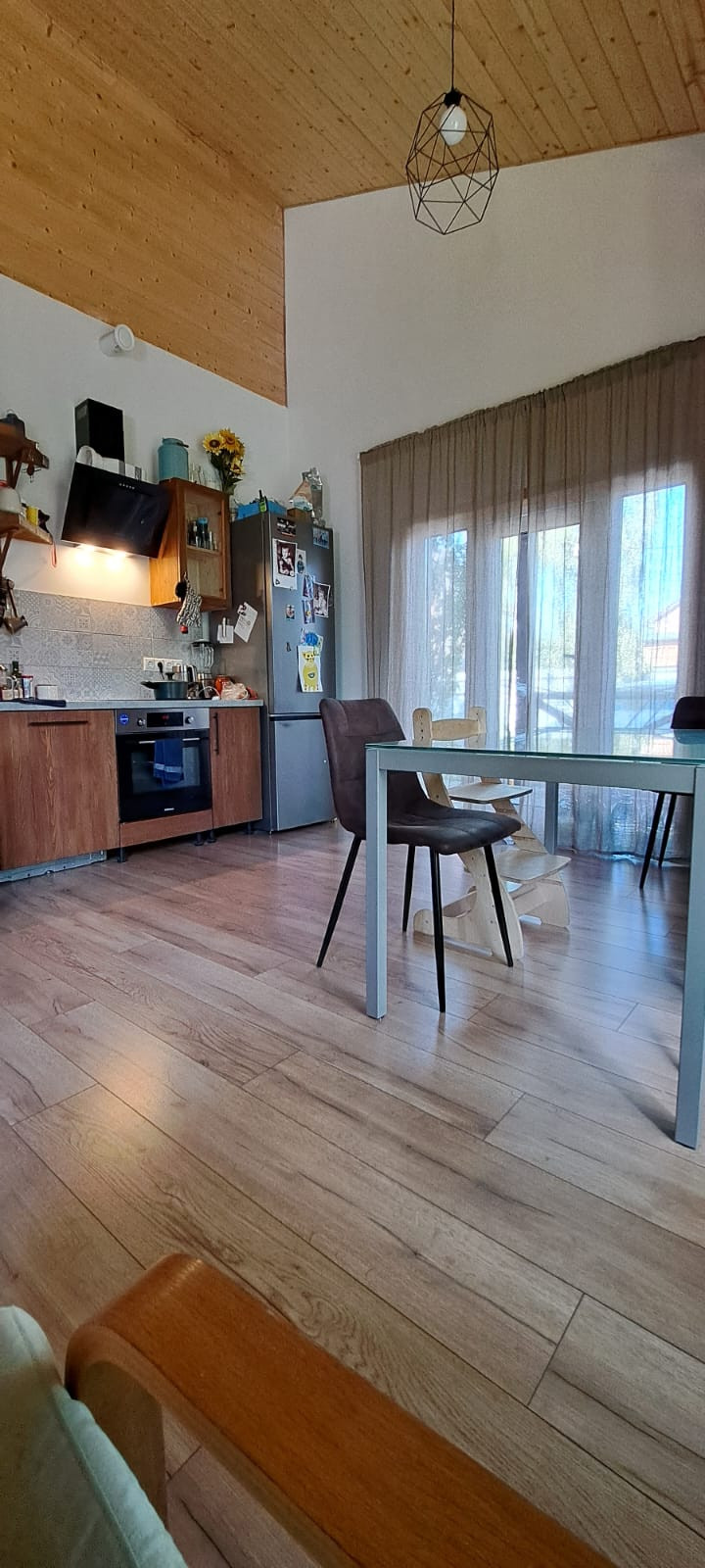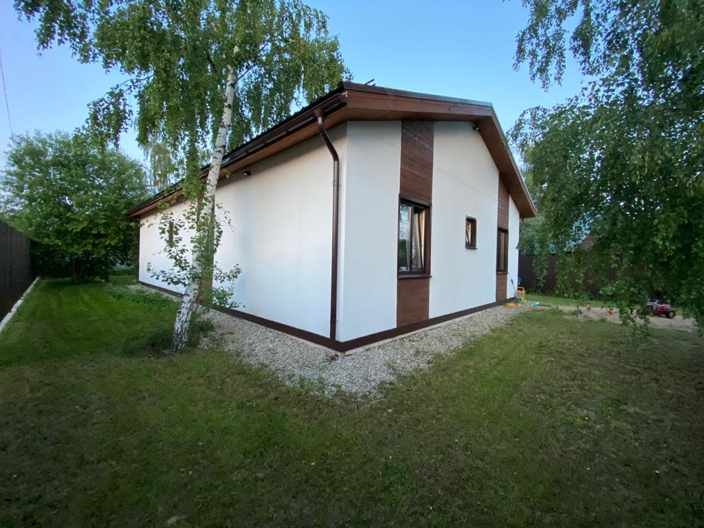 Дом меблирован и готов к проживанию, 3 спальни, 2 сан узла, гардеробная, котельная с отдельным входом, кухня-гостиная с панорамным остеклением и высокими потолками. Дом установлен на ЖБ плите, под плитой забито 40 ЖБ свай длиной 3 метра. Плита утеплена. Дом построен из сухой строганой доски пропитаной Neomid 430, внутри и снаружи дом затянут мембранами MegaFlex, снаружи обшит ЦСП вентилируемый фасад, зашпаклеван и окрашен структурной краской Tikkurila, деревянные вставки и фасад дома выполнены из планкена толщиной 28мм, окрашен террасным маслом Tikkurila. Пол террасы выполнен из палубной лиственницы. Внутренние стены комбинированные, имитация бруса толщиной 20мм. и влагостойкий ГКЛ в два слоя, зашпаклеваны и окрашены. Средняя толщина стен 32 см. Двухкамерные стеклопакеты Rehau ламинированные, цвет Вегне. Кровля металлочерепица, водосточная система, снегоудержание Gran Line шоколадного цвета. Цоколь металлический в цвет кровли. Приточно-вытяжная вентиляция во всех комнатах дома. Электрическая сеть, скрытая, негорючий кабель ВвгНГ, запакованный в гофру, электро щиток встроенный, автоматы BBk, выключатали и розетки Legrand. Скрытая водоразводка из сшитого полиэтилена Rehau. Во всем доме уложены водяные теплые полы, установлен регулируемый коллектор на 10 выходов, с насосом Grundfos, залита, бетонная стяжка 5 см. Установлен электрический котел 12 кВт Stout, с бойлером косвенного нагрева на 160 литров Stout. На полах в прихожей, сан узлах и гардеробной - керамогранит, в остальном доме ламинат 43 класса. Шумоизолированные межкомнатные перегородки 20 см. Межкомнатные двери Bravo шпонированые, белые. Гардеробная оборудована стеллажами Леруа Мерлен и Ikea. Кухонный гарнитур из натурального дерева со встроенной техникой ( плита, духовой шкаф, двух камерный холодильник). Дом продается частично с техникой и мебелью.