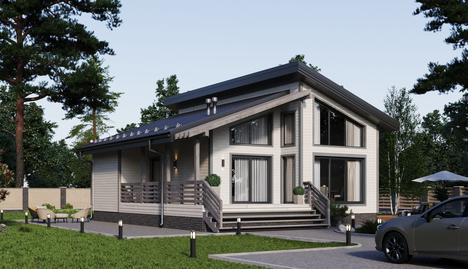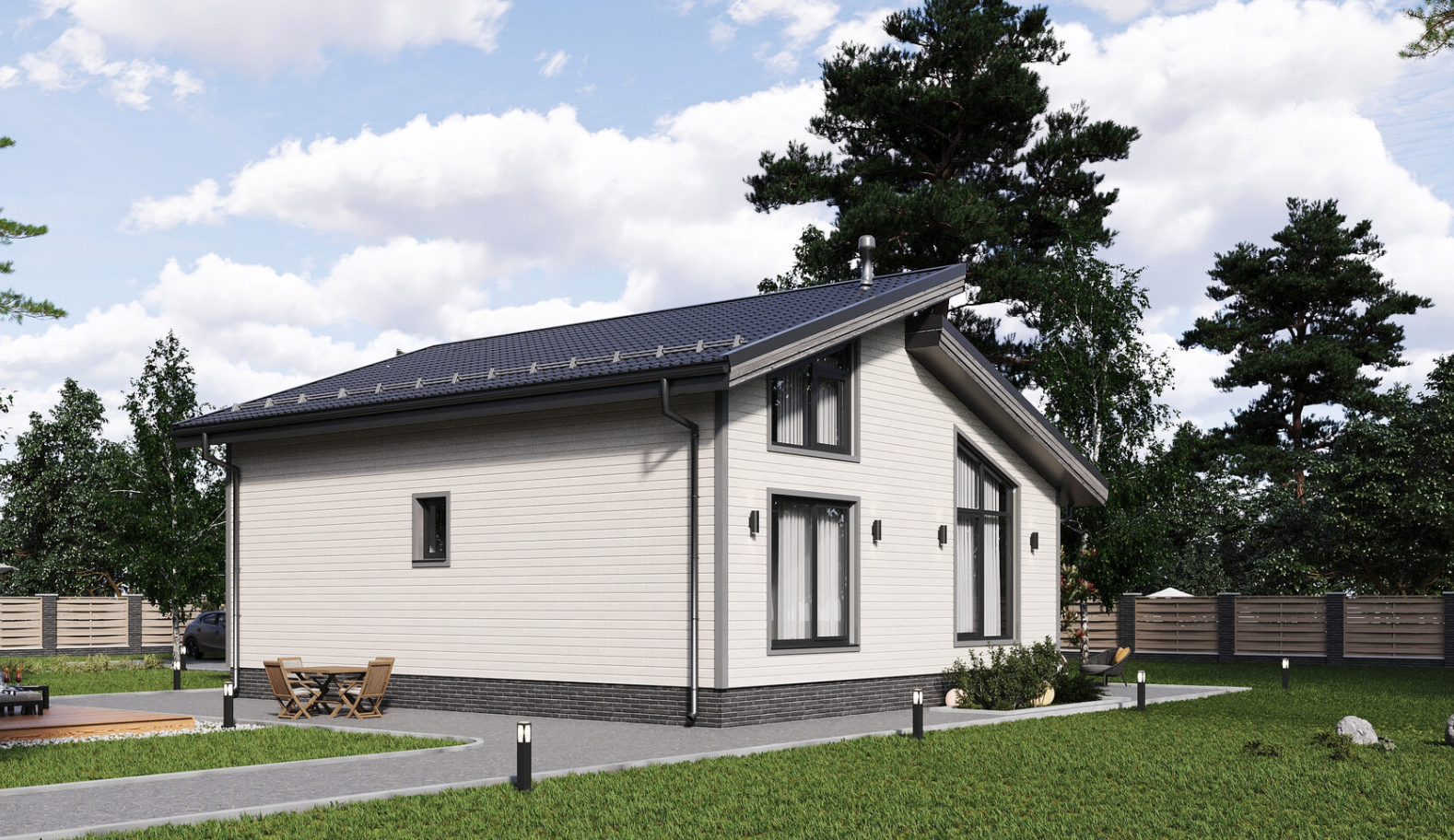Подшивка свесов кровли: Пластиковые софиты. Свесы крыши - 500 мм от края наружной стойки.