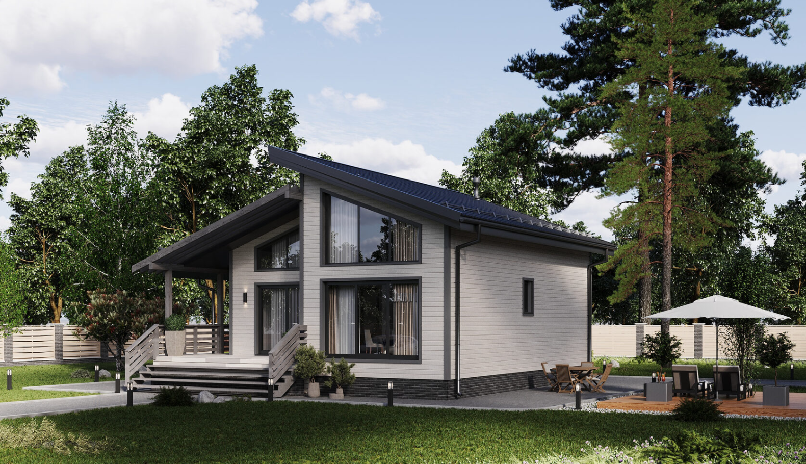 Открытые пристройки: покрытие пола сосна доска палубная 45х140; стойки из клееного бруса 140х140; ограждение из строг. доски 45х145; черновая входная лестница из доски 151