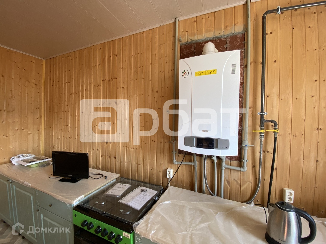 Установлен газовый двухконтурный современный котел. Есть подводки под мокрые точки на обоих этажах. На первом этаже установлены радиаторы и двери.