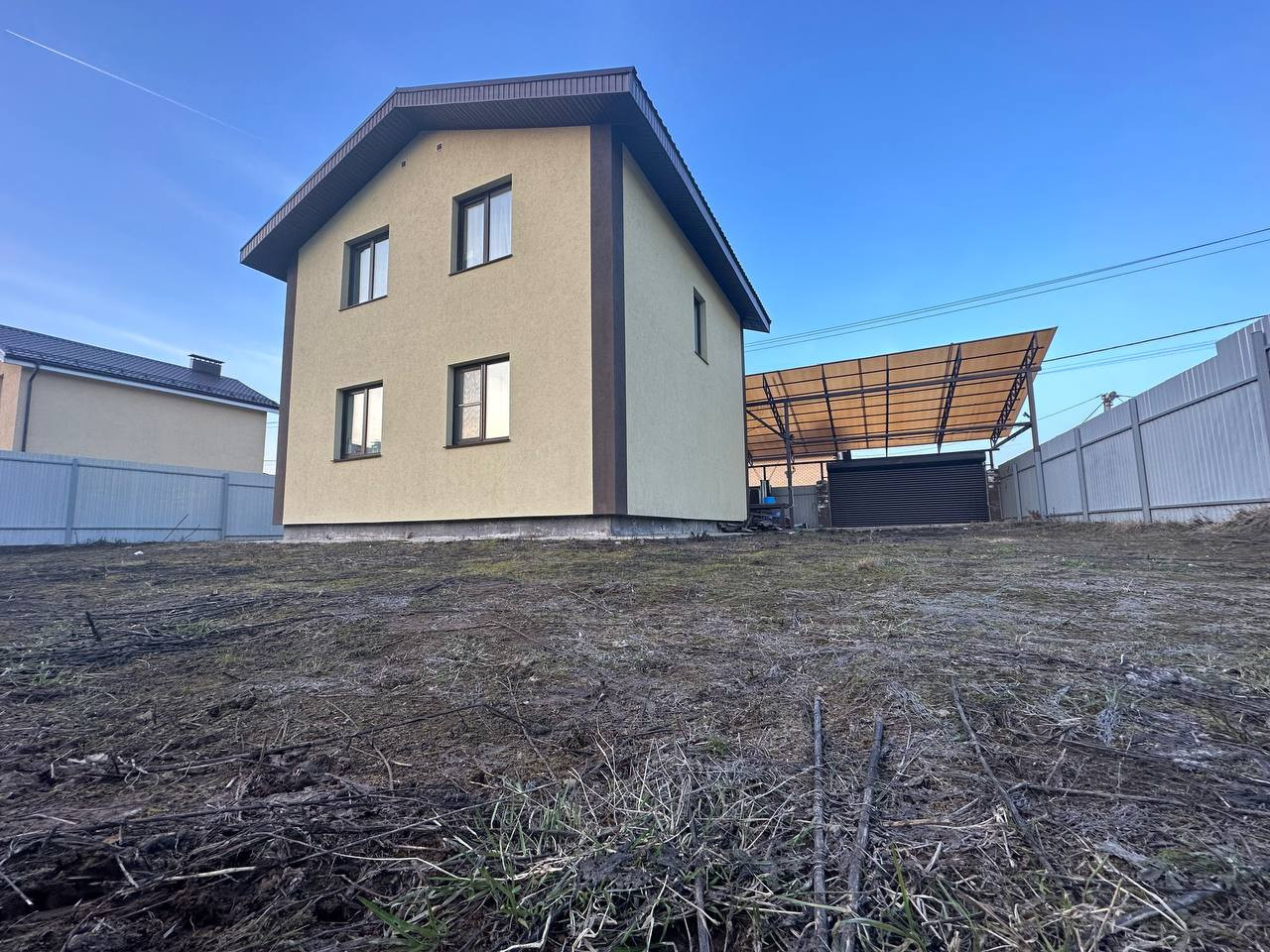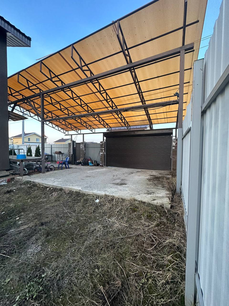 Спереди парковка залита бетоном на полноценную подушку под два автомобиля (марка бетона под нагрузку). Ворота с пульта. Есть вторые ворота (технические) для въезда на участок техники.