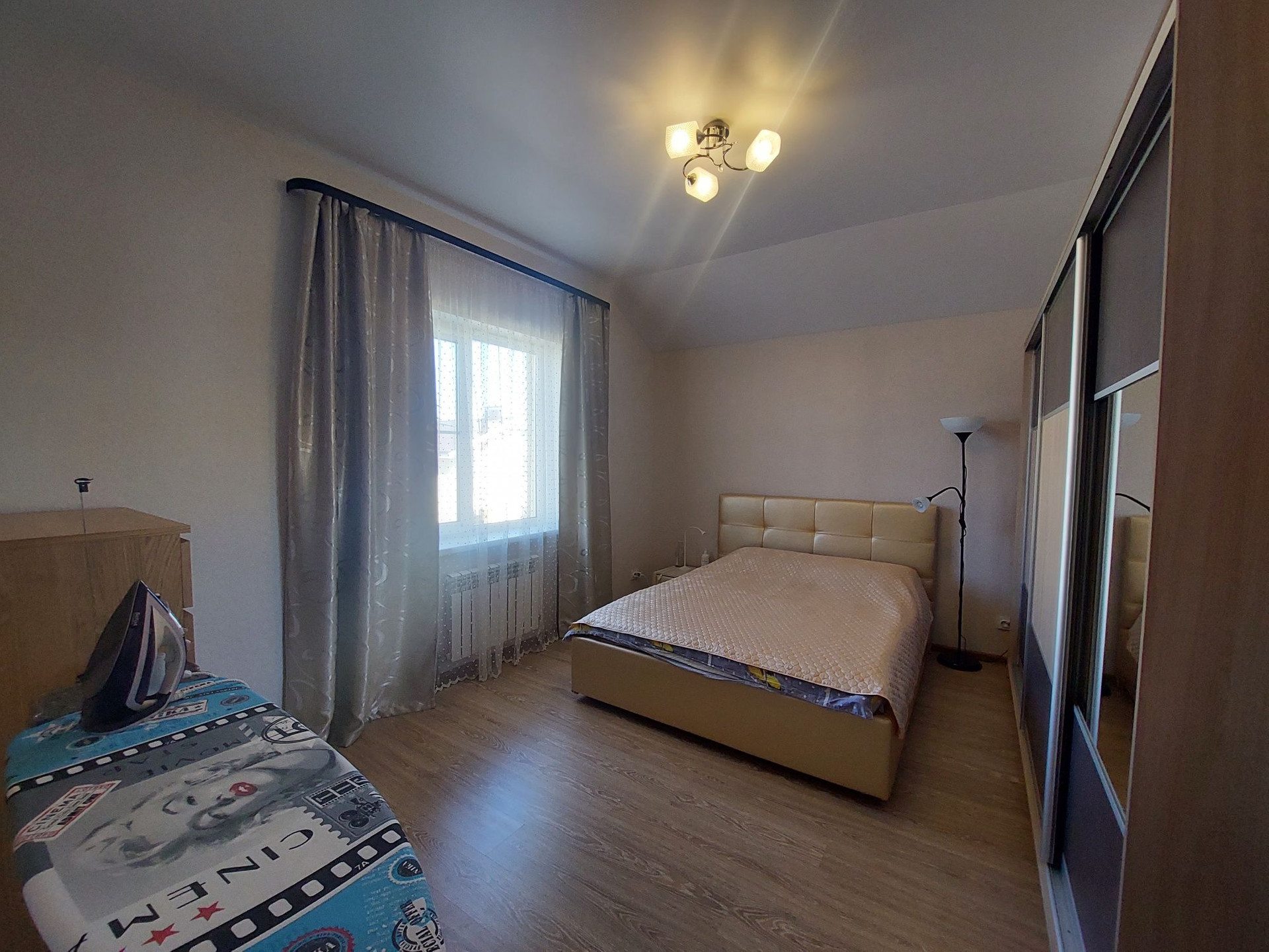 (Спальня: кровать с подьемным механизмом и ортопедическим матрасом фирмы "Мягкий сон", шкаф-купе во всю стену)