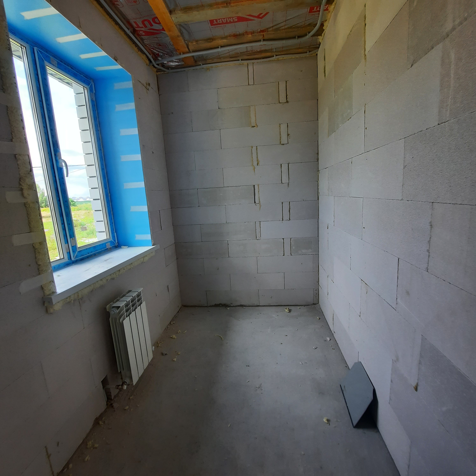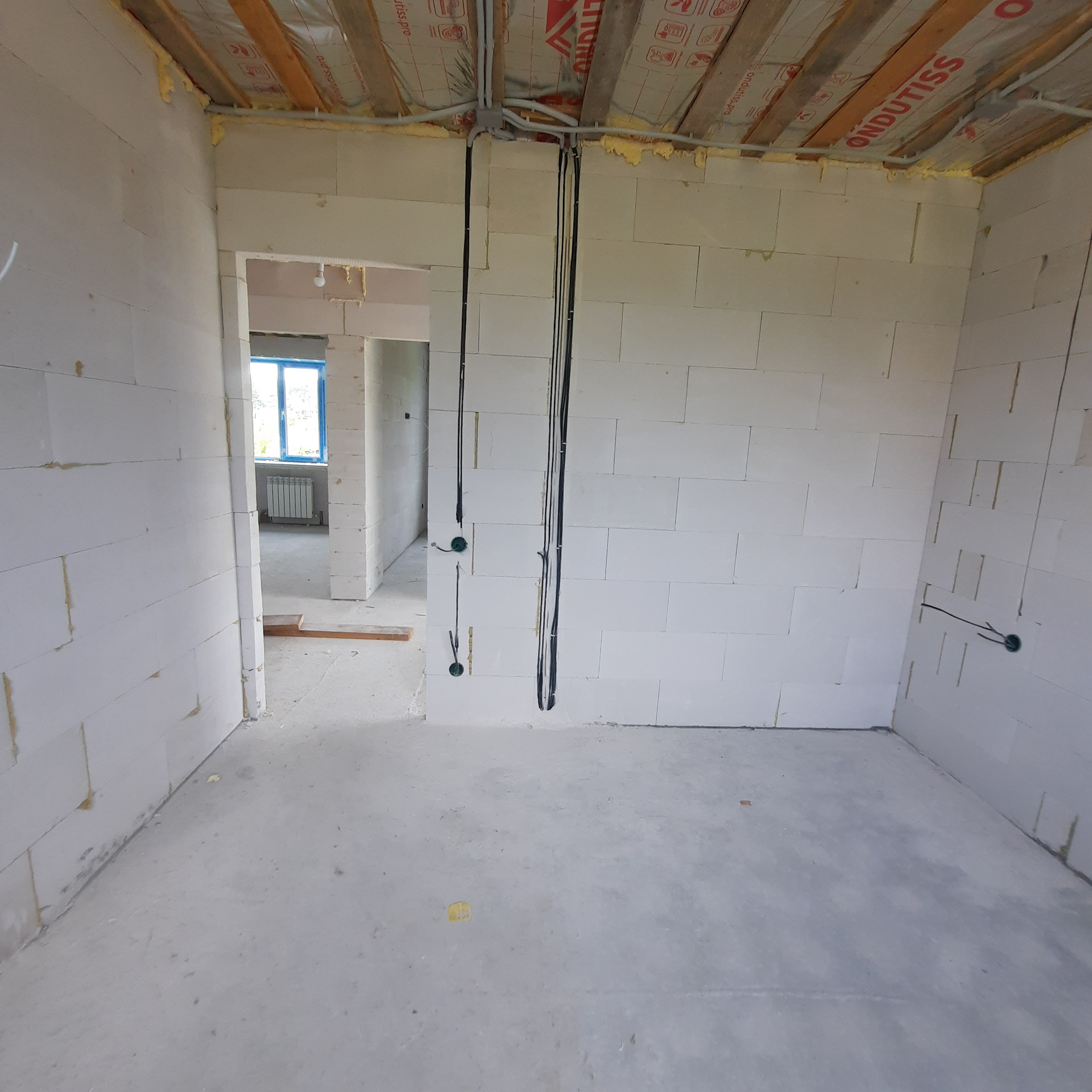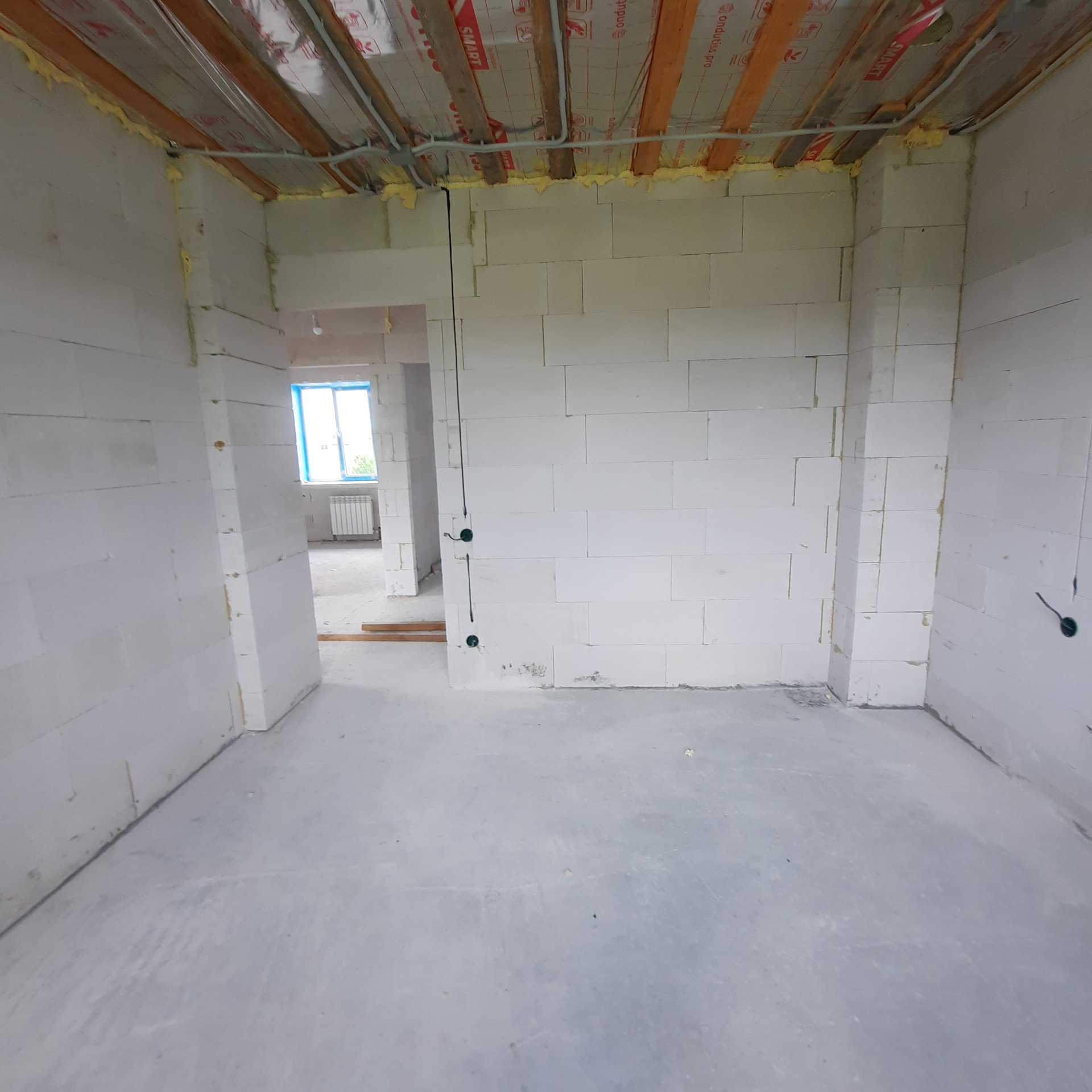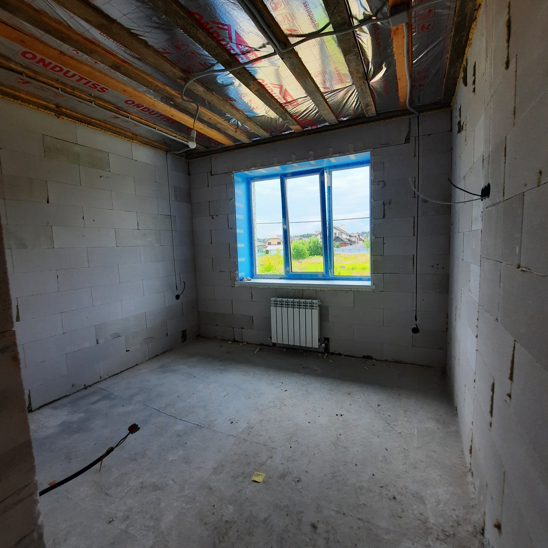 Стены 500 мм толщиной - газосиликатный блок 300 мм, утепление Минвата 50 мм, облицовочный кирпич 125 мм. Высота потолка 2,8 м., За счёт толщины стен коттедж очень теплый и большая экономия на расходе газа.