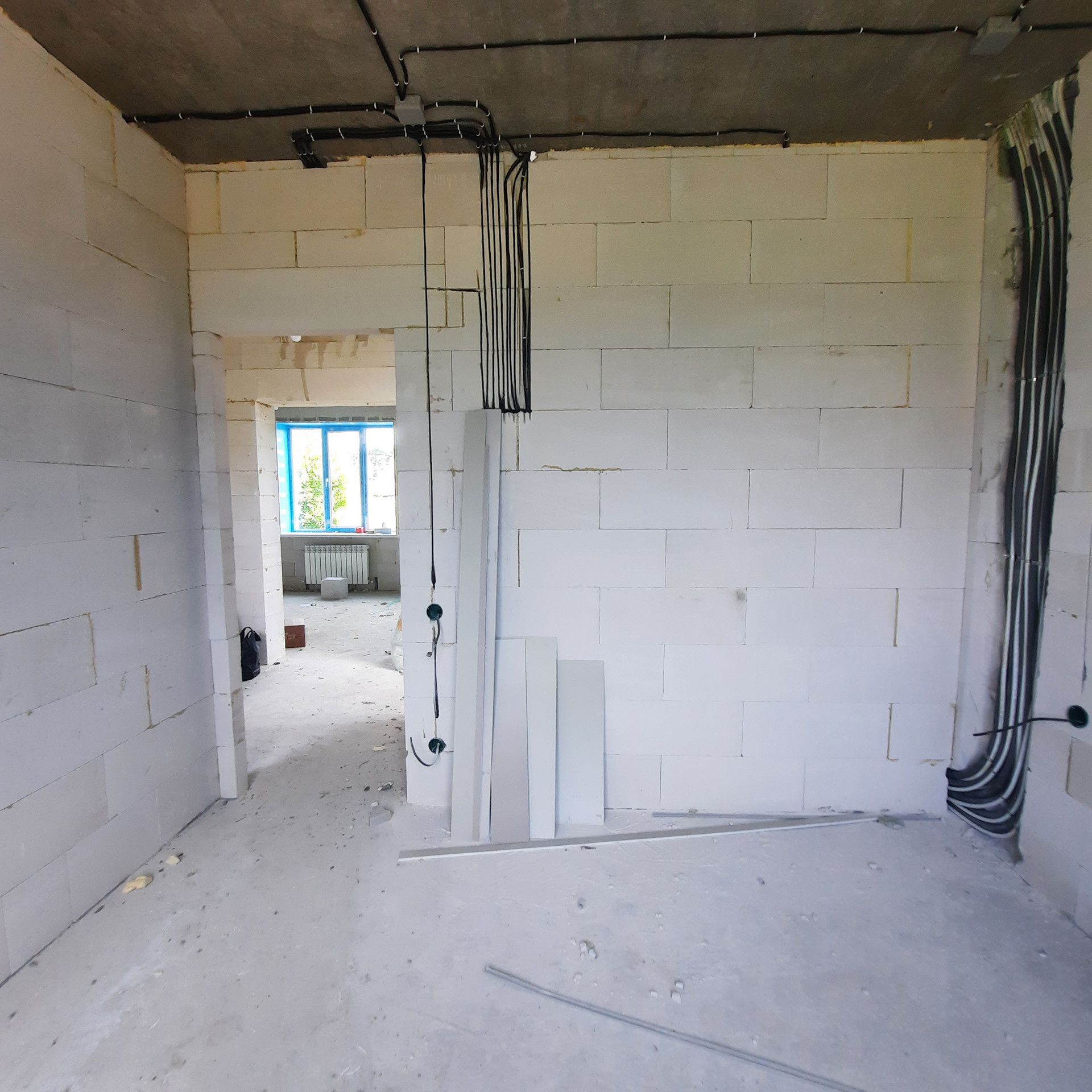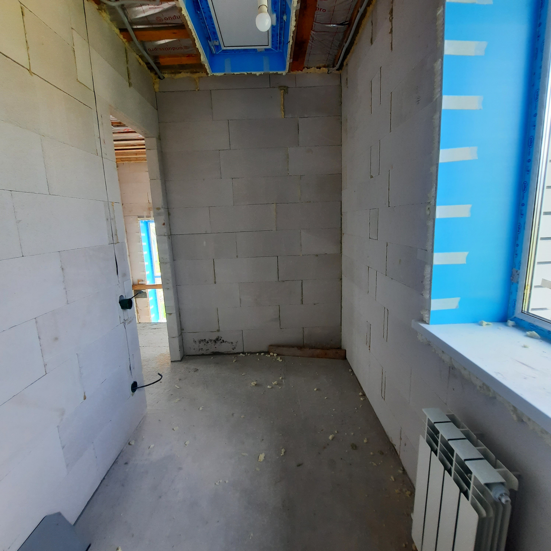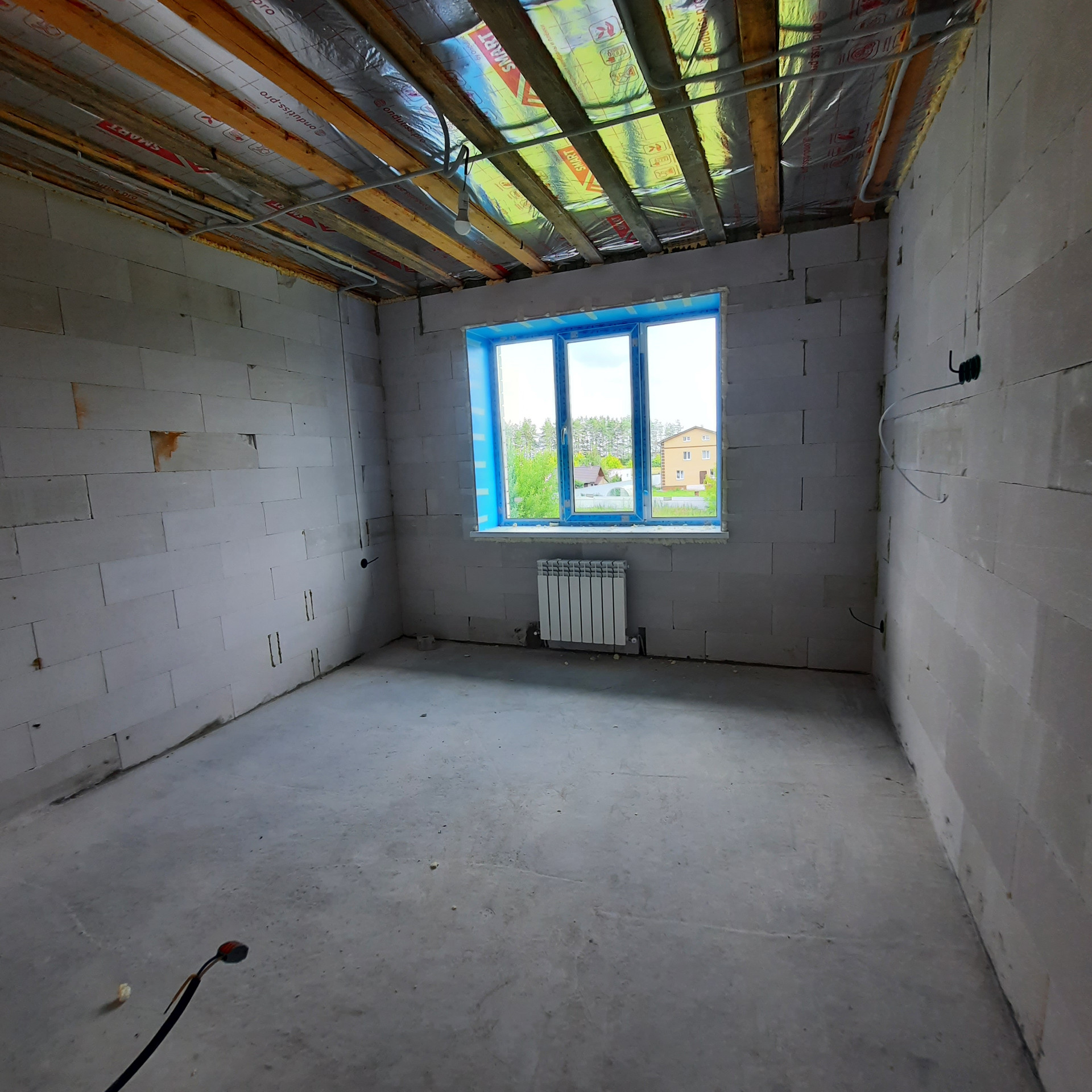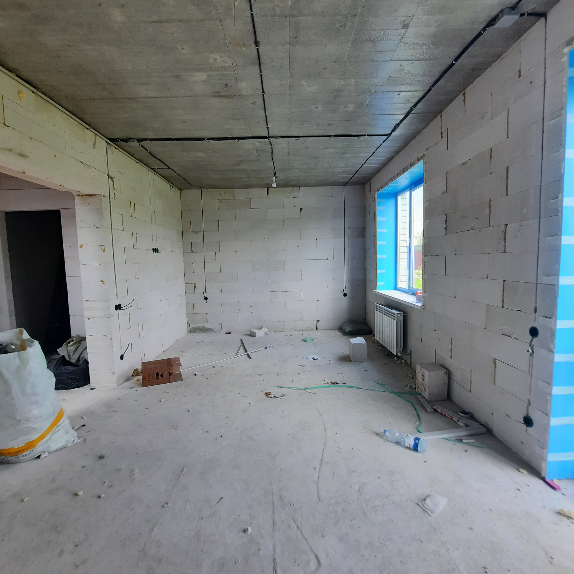 Стены 500 мм толщиной - газосиликатный блок 300 мм, утепление Минвата 50 мм, облицовочный кирпич 125 мм. Высота потолка 2,8 м., За счёт толщины стен коттедж очень теплый и большая экономия на расходе газа.