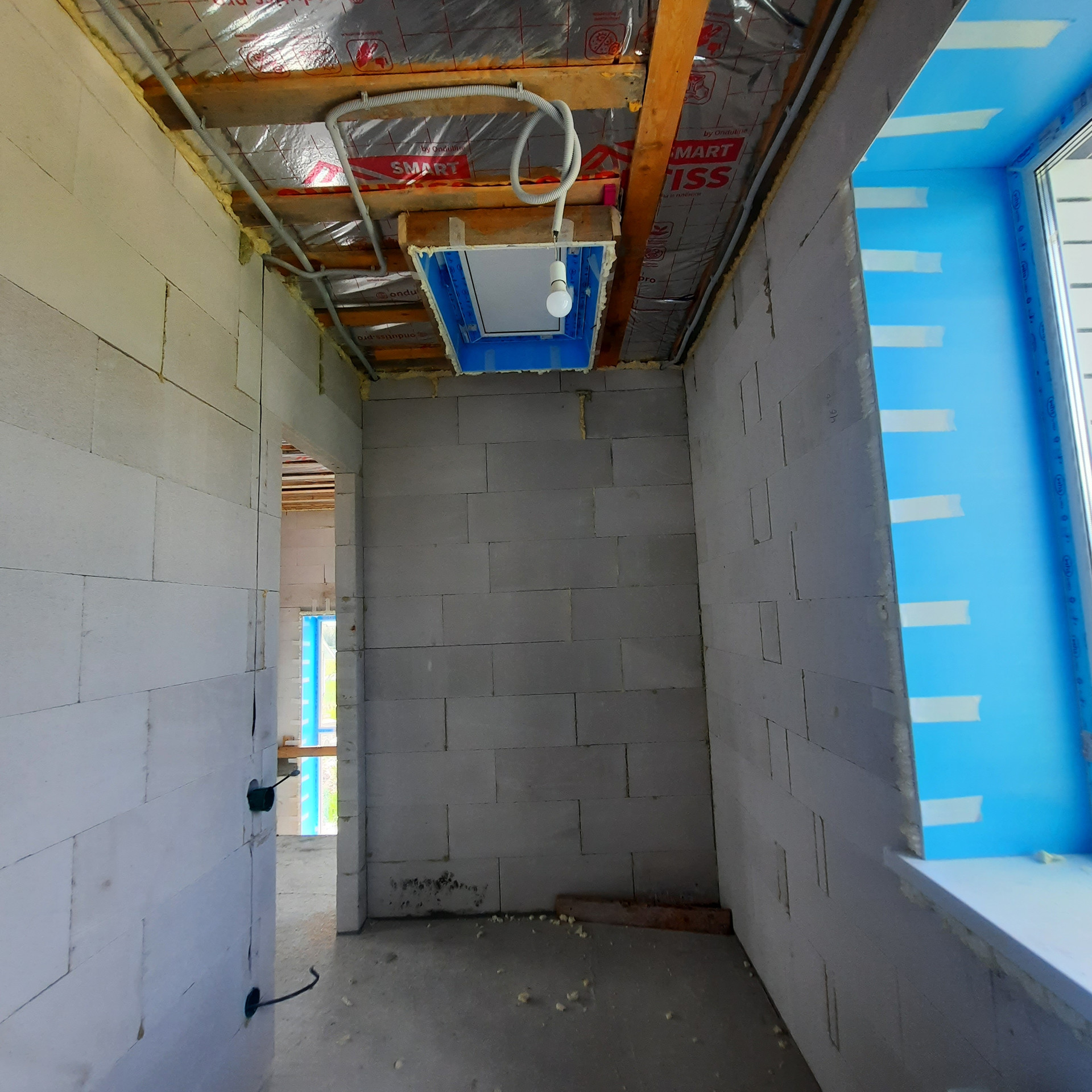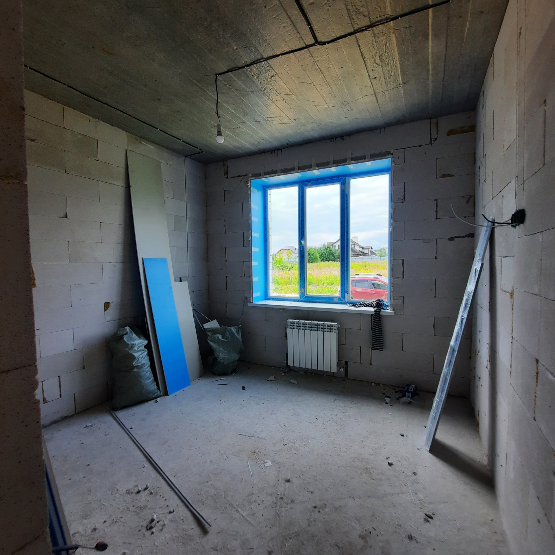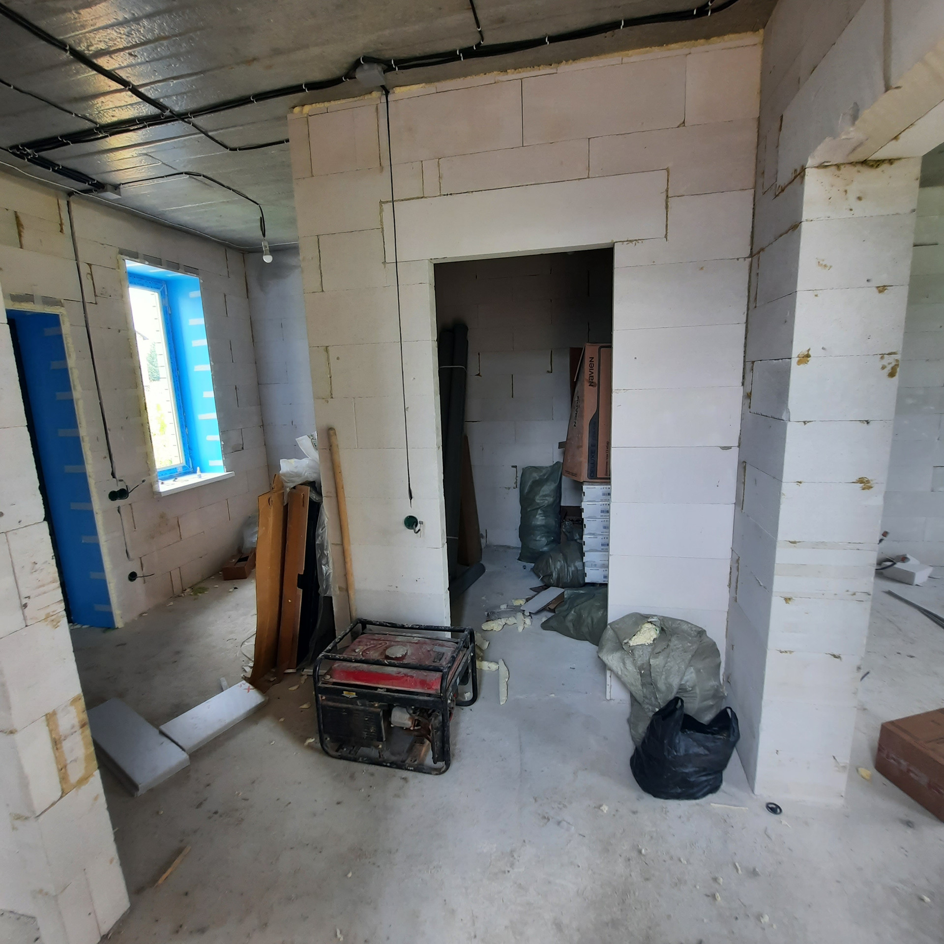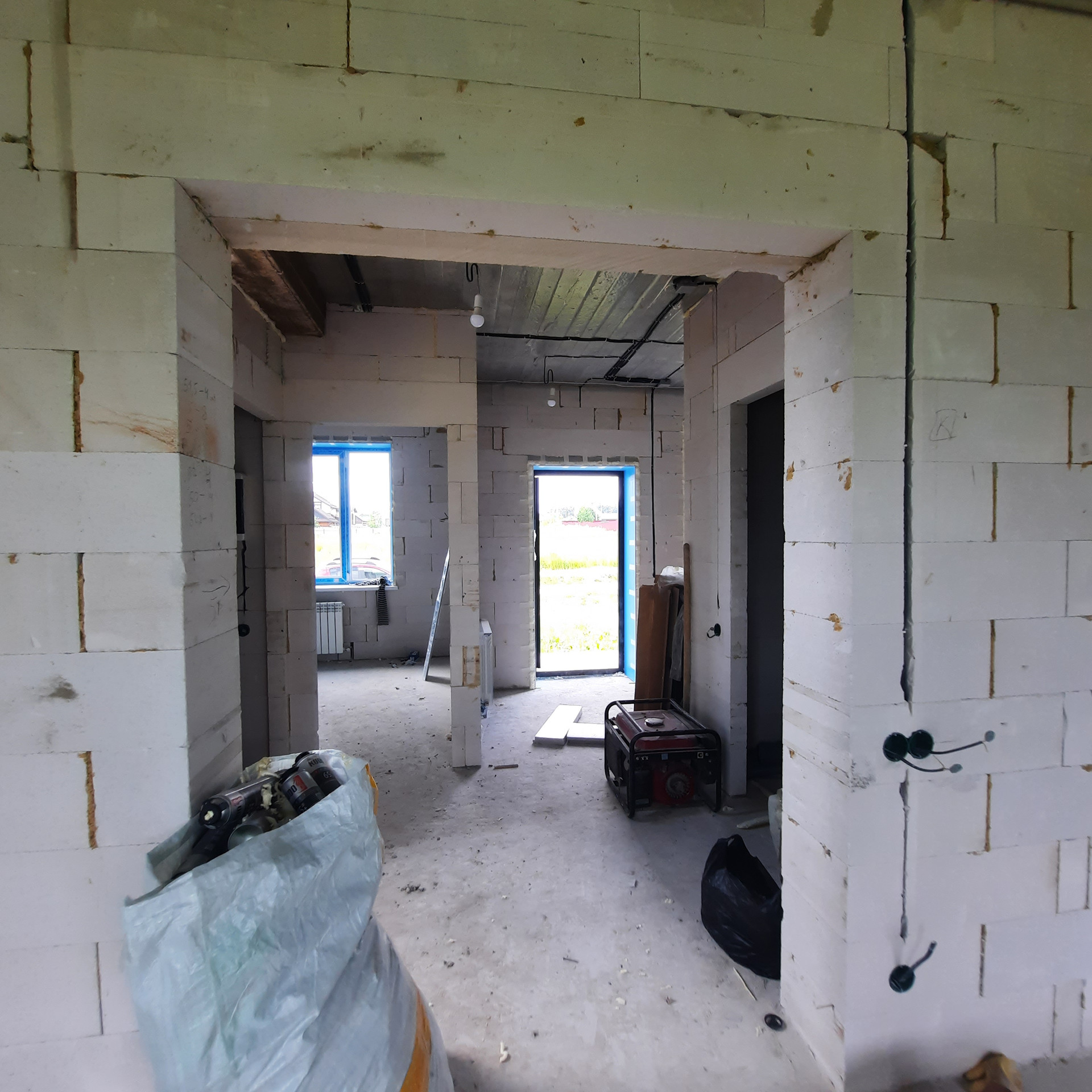 Стены 500 мм толщиной - газосиликатный блок 300 мм, утепление Минвата 50 мм, облицовочный кирпич 125 мм. Высота потолка 2,8 м., За счёт толщины стен коттедж очень теплый и большая экономия на расходе газа.