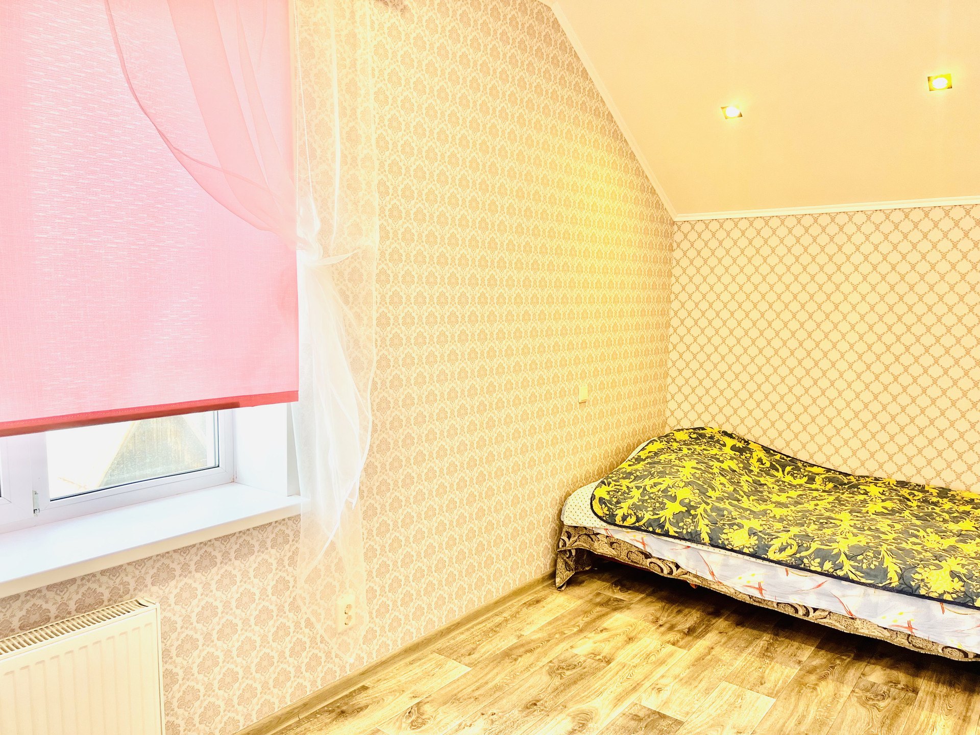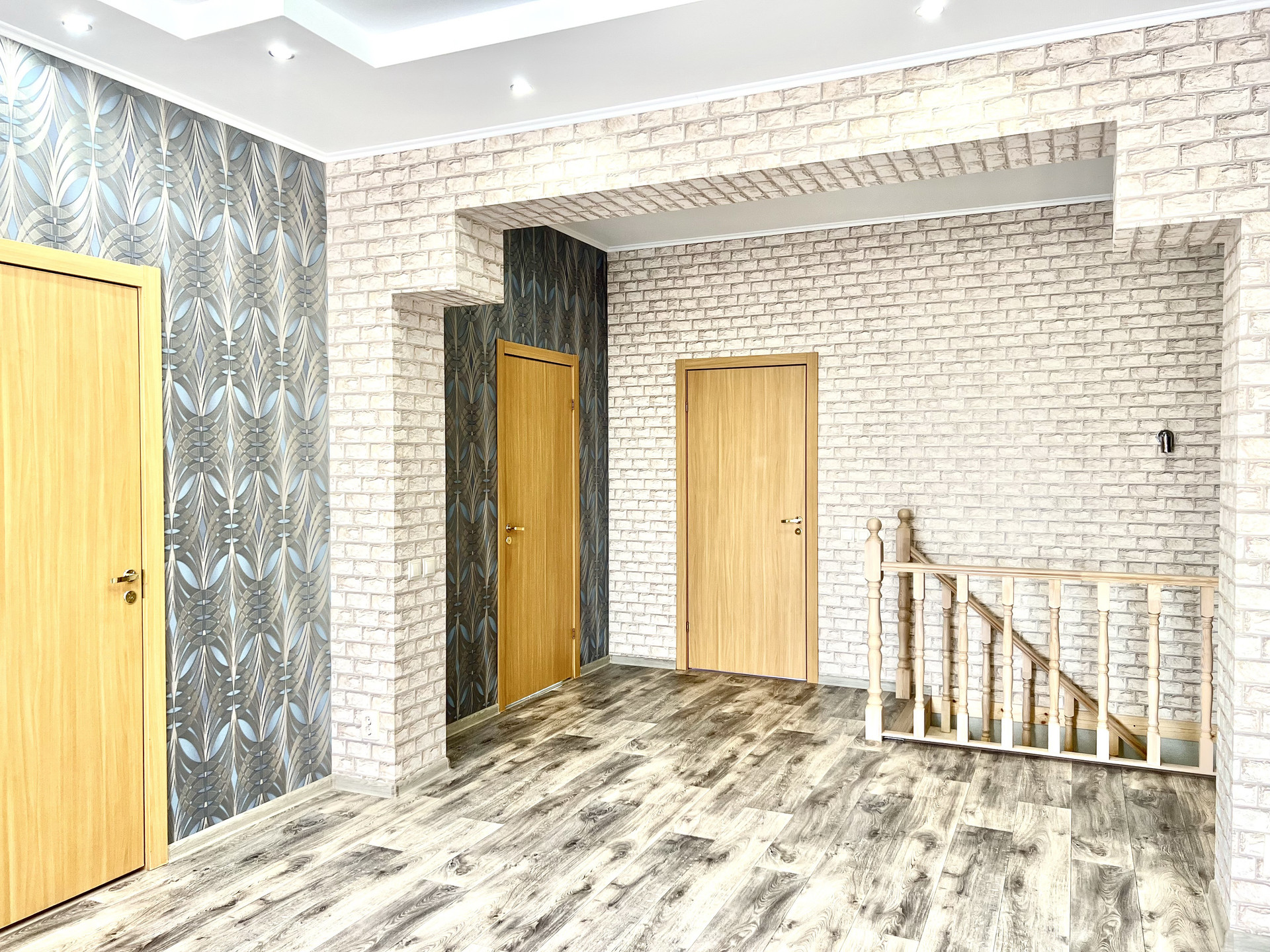 Второй этаж; пол- линолеум, стены- гипсокартон, обои; потолок- гипсокартон, покраска.