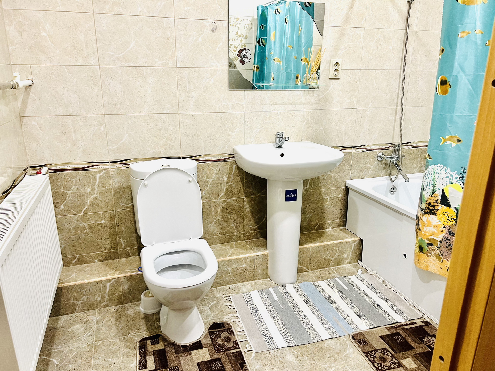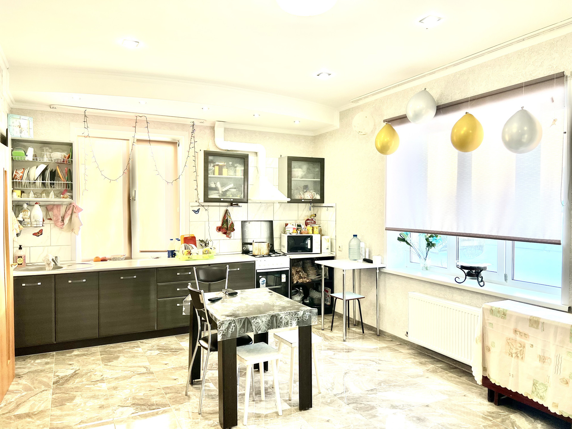 В доме 3 туалета, 4 комнаты, большая кухня-гостиная, два входа в дом с тамбурами.