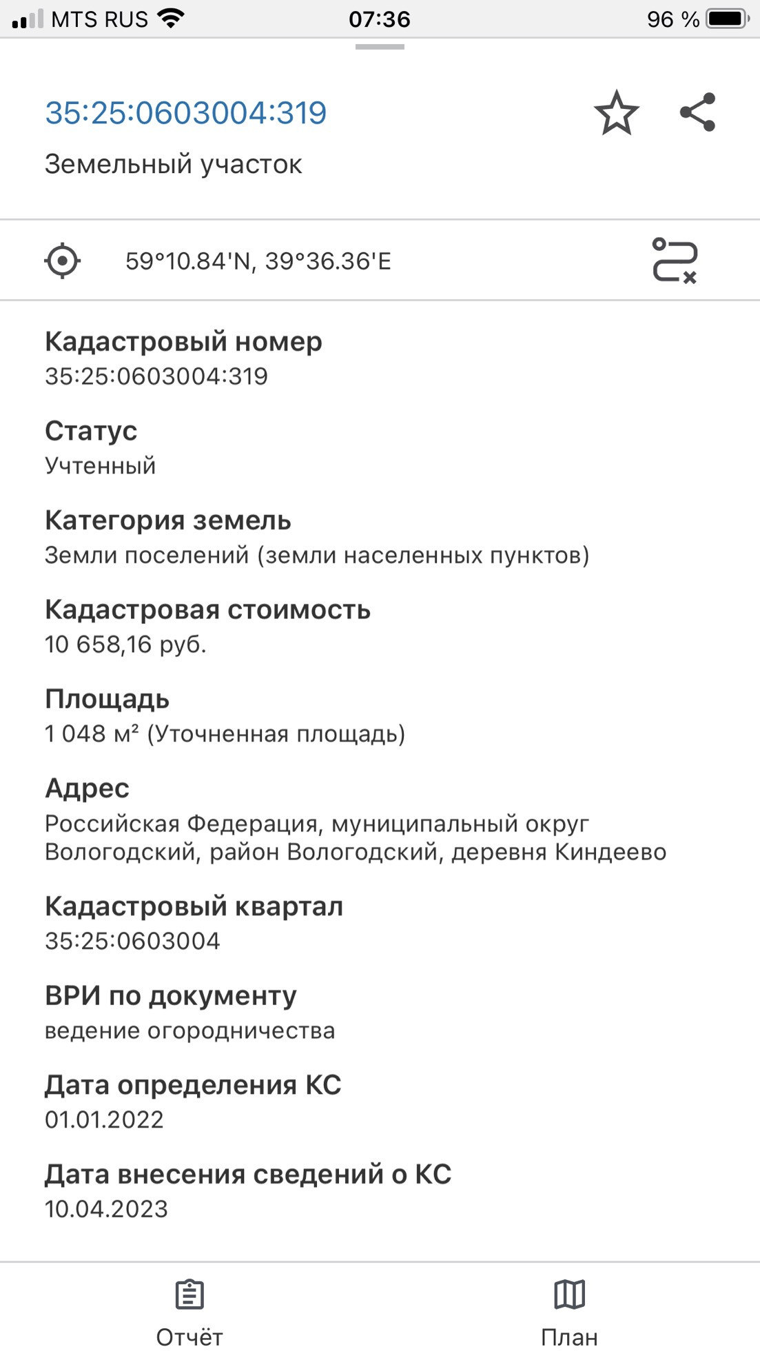 Координаты 59°10.84'N, 39°36.36'E