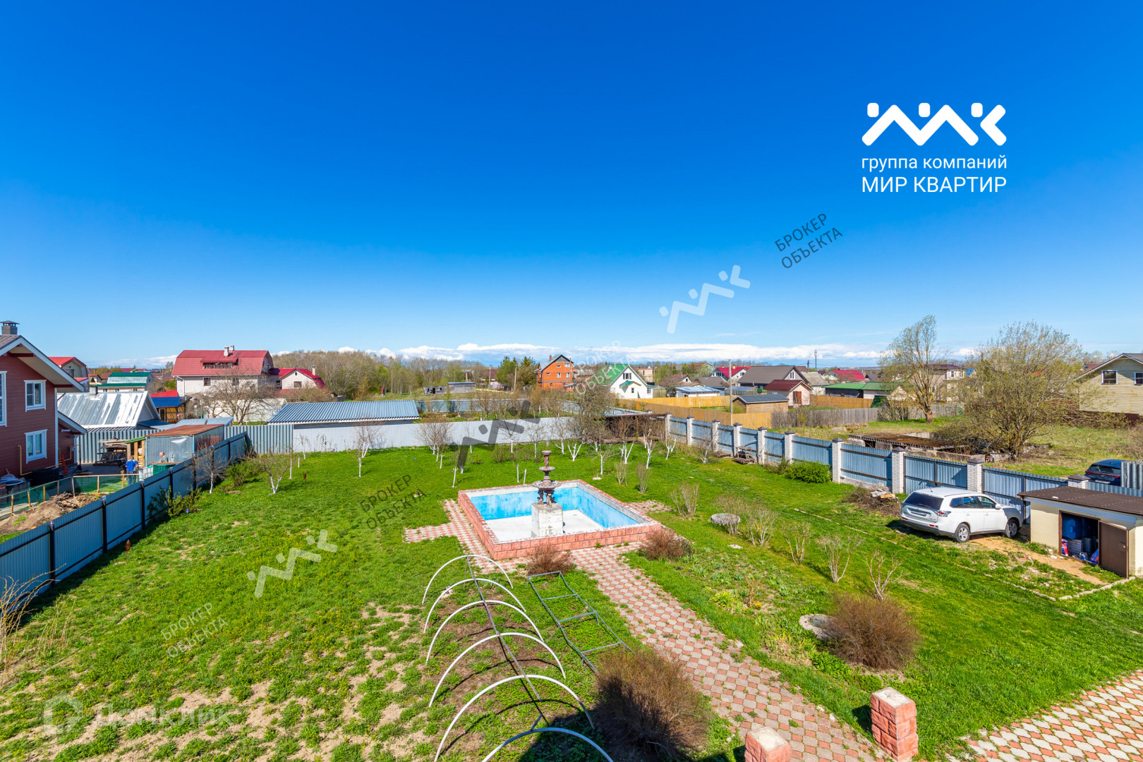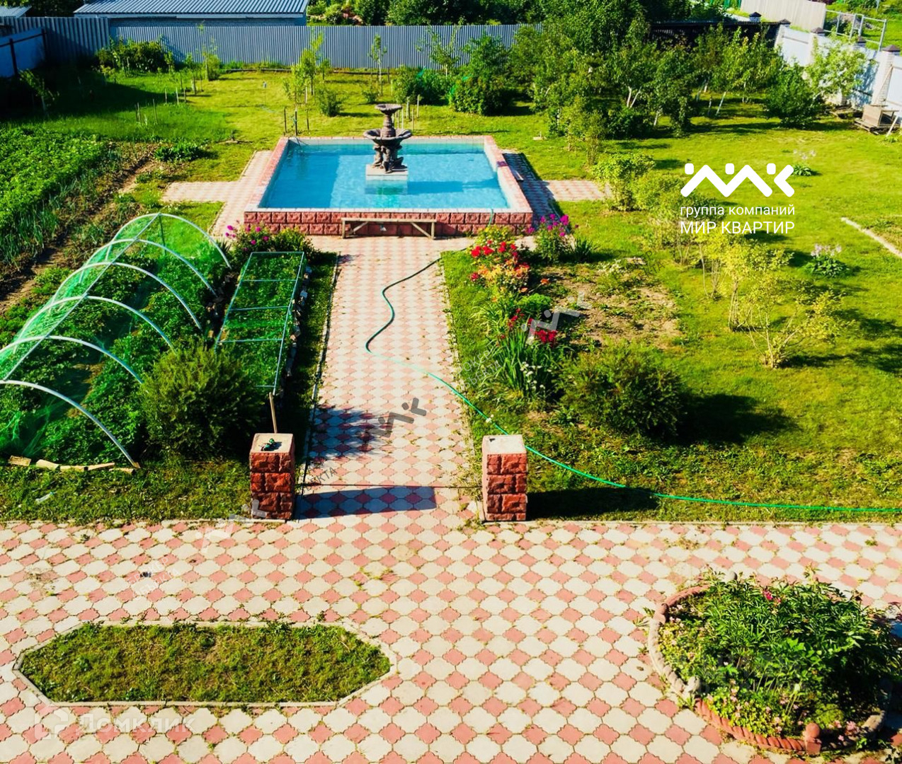 Участок большой, ровный, полностью разработан. На участке оборудовал капитальный бассейн с фонтаном с размерами 6х8 метров и глубиной 1,7 метра. Смонтировала система слива воды.
