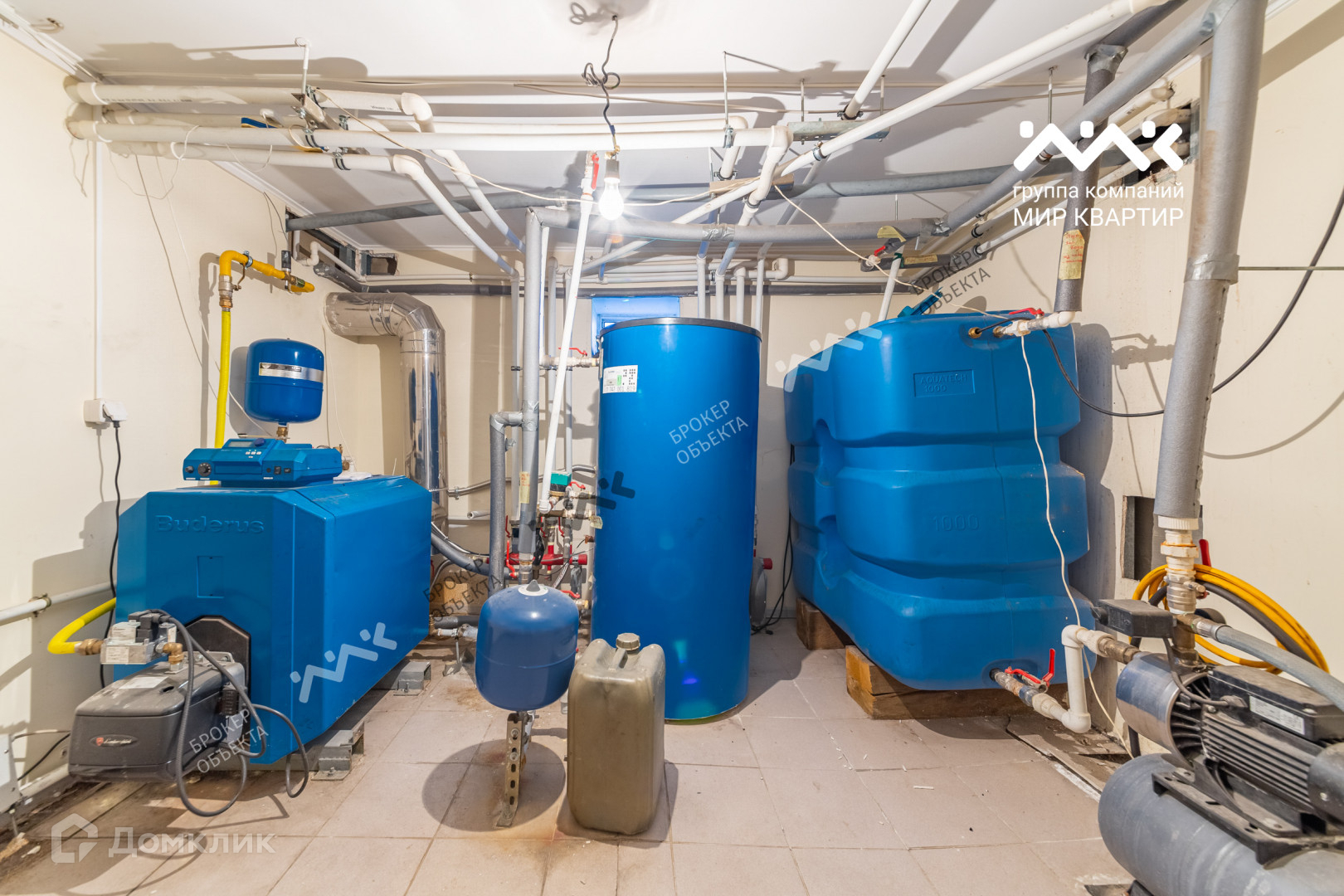 На цокольном этаже, находится полностью оборудованная котельная, в которой установлен газовый котел фирмы Buderus. Коттедж подключен к магистральному газу. Данная модель газового котла позволяет использовать дизельное топливо, для которого снаружи дома, в отдельно оборудованном помещении установлены две емкости на 1,5 тонны. Также на цокольном этаже два больших помещения, которые можно использовать по своему усмотрению, и свой санузел.
