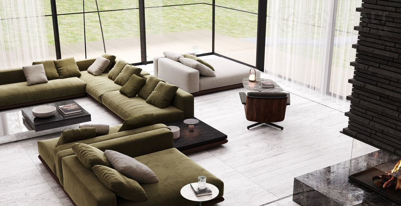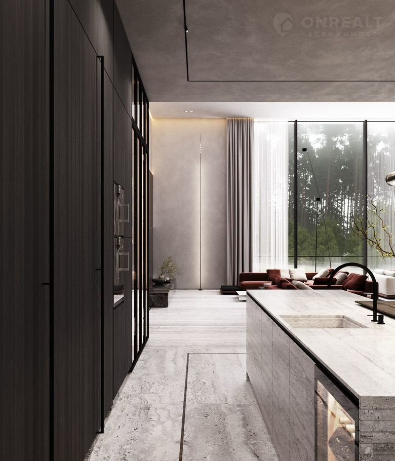 - Гостиная (68 м) плавное переходит в кухонную зону (47 м)