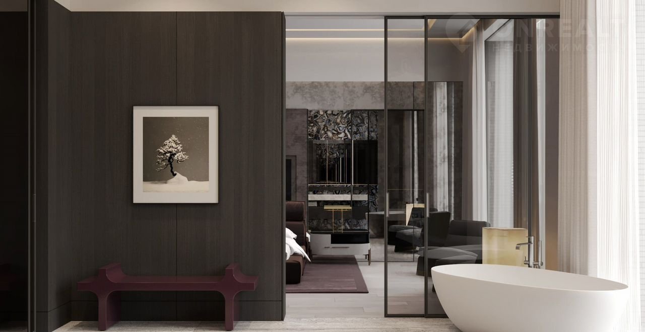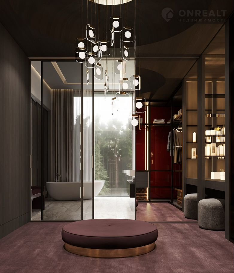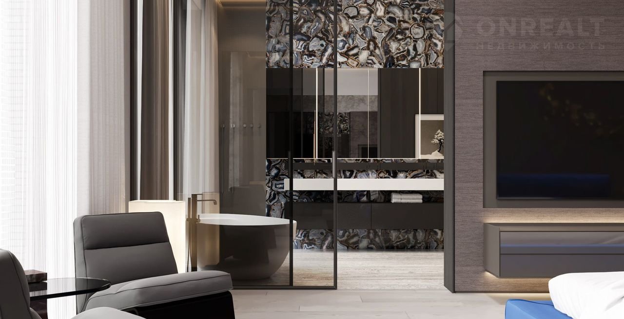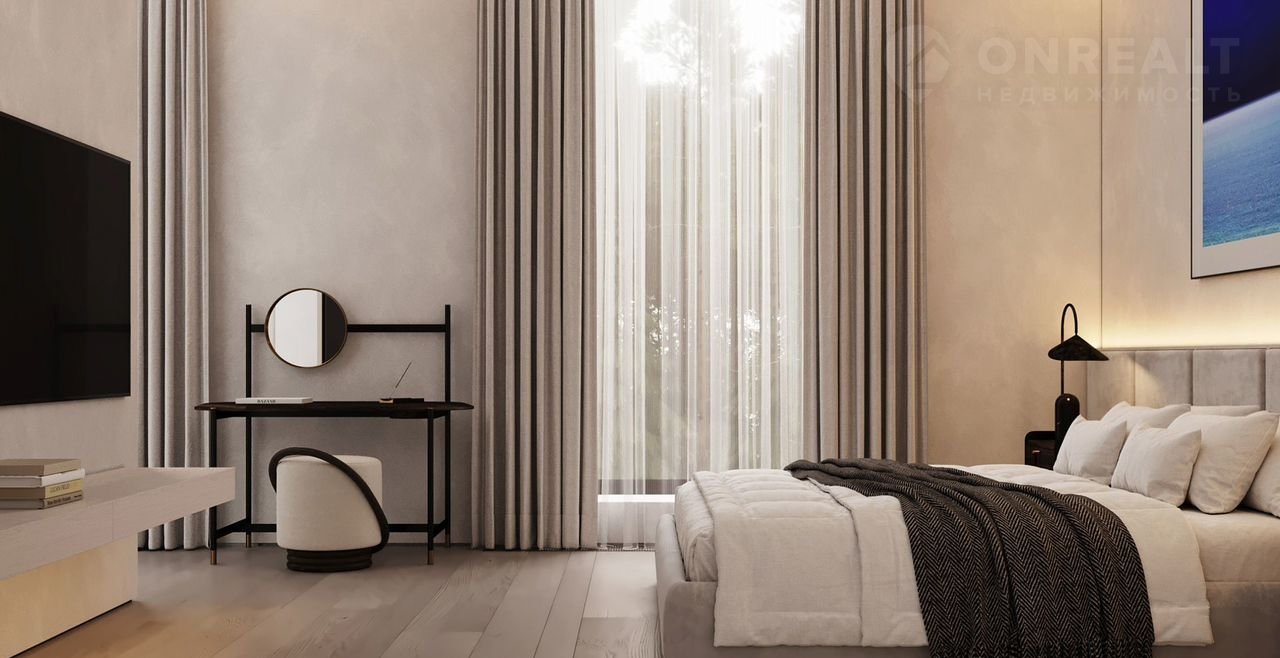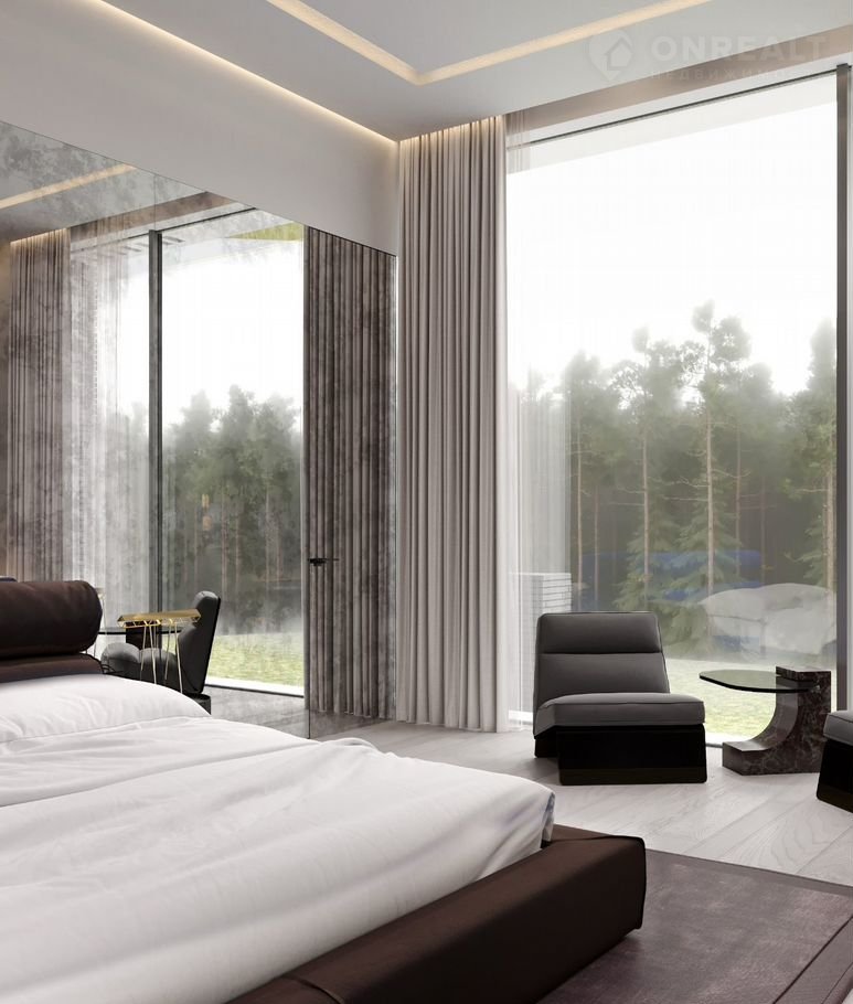 - Мастер-спальня (31 м) с панорамной ванной комнатой (20 м) и функциональной гардеробной (15 м). Из спальни предусмотрен собственный выход на террасу (85 м)