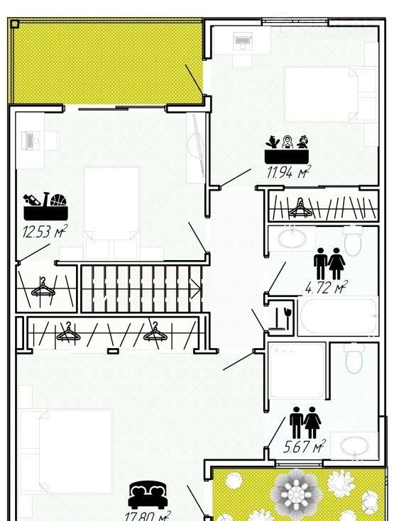 На втором этаже находится спальная зона. Из детских спален есть выход на балкон с видом на зеленый склон. В спальне родителей отдельная ванная комната и зимний сад.