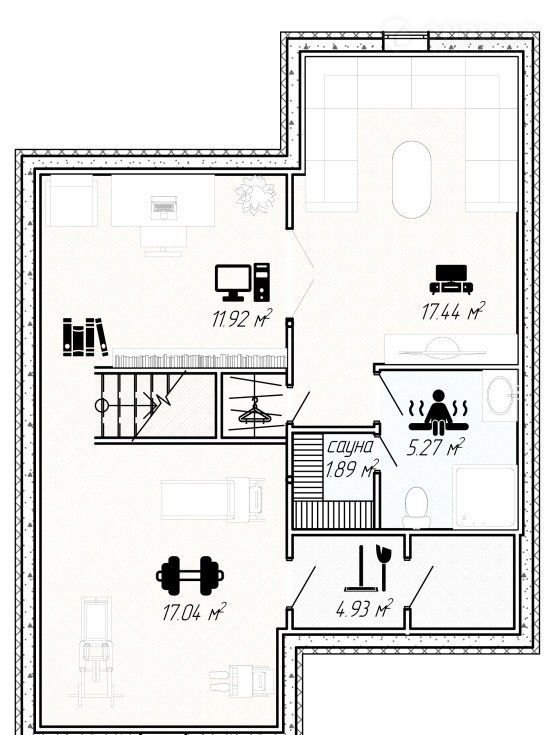 В цоколе находятся ванная с сауной, комната отдыха, тренажерный зал, и дополнительная комната, которая может быть использована как мастерская для хобби, кабинет или игровая.