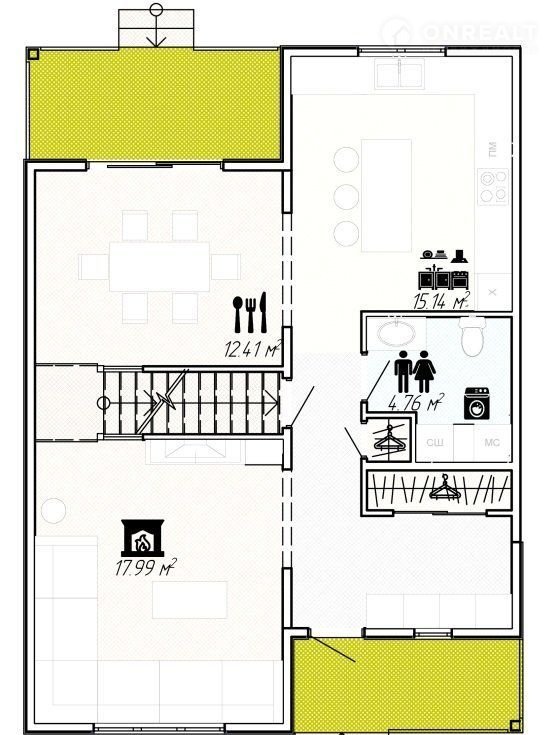 На первом этаже располагаются: просторный холл, гостиная с камином, столовая, соединенная с кухней, из которой есть выход на крытую террасу и задний двор, туалет и постирочная.