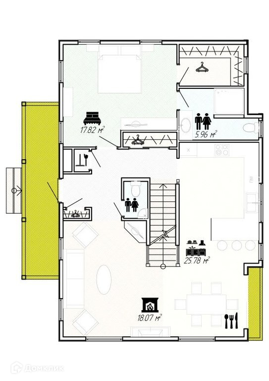 На первом этаже просторная хозяйская половина спальня с отдельной ванной, туалет, кухня, столовая и гостиная с камином.