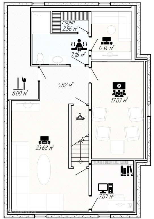 В Кейп-Коде найдется место для всех. На цокольном этаже располагаются спальня, гостиная, сауна с комнатой отдыха и кабинет.