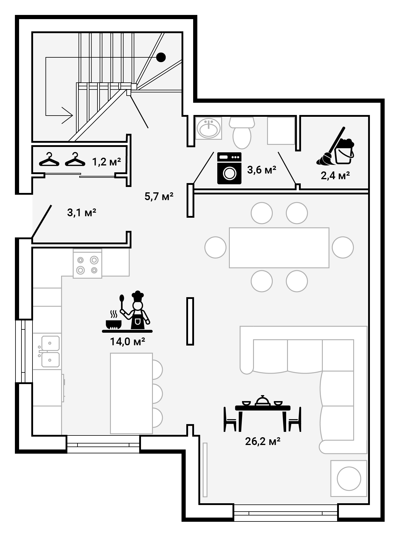 На первом этаже таунхауса располагаются большая гостиная, кухня, туалет, постирочная и кладовая.