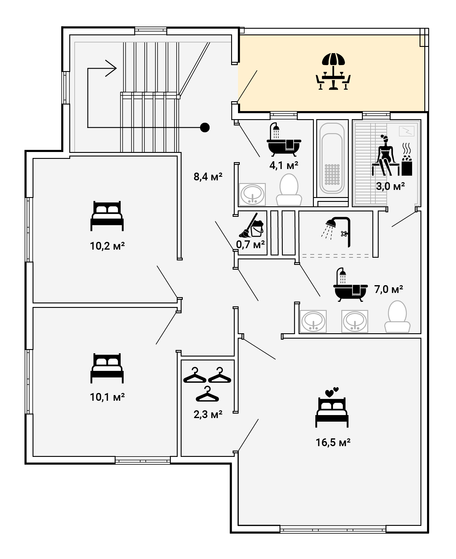 По широкой светлой лестнице вы попадете на второй этаж, где находятся три спальни, детская ванная. Спальня родителей оборудована отдельной ванной комнатой с двумя раковинами для него и неё, встроенным душем, сауной и гардеробной. Из коридора выход на террасу и во двор.