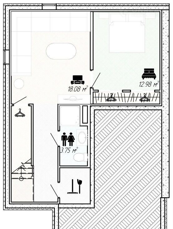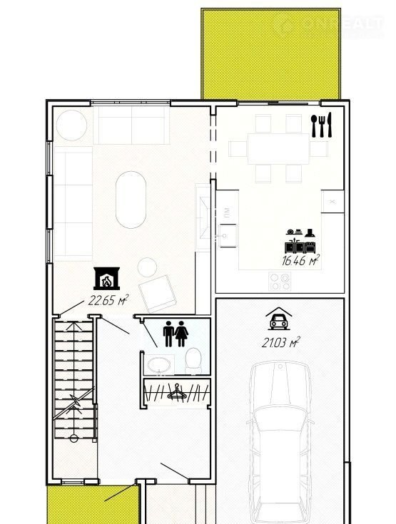 На первом этаже таунхауса располагаются большая светлая гостиная, кухня, совмещенная со столовой, туалет. Вход на второй этаж отделен от гостиной коридором с дверью, который изолирует активную зону от зоны отдыха.