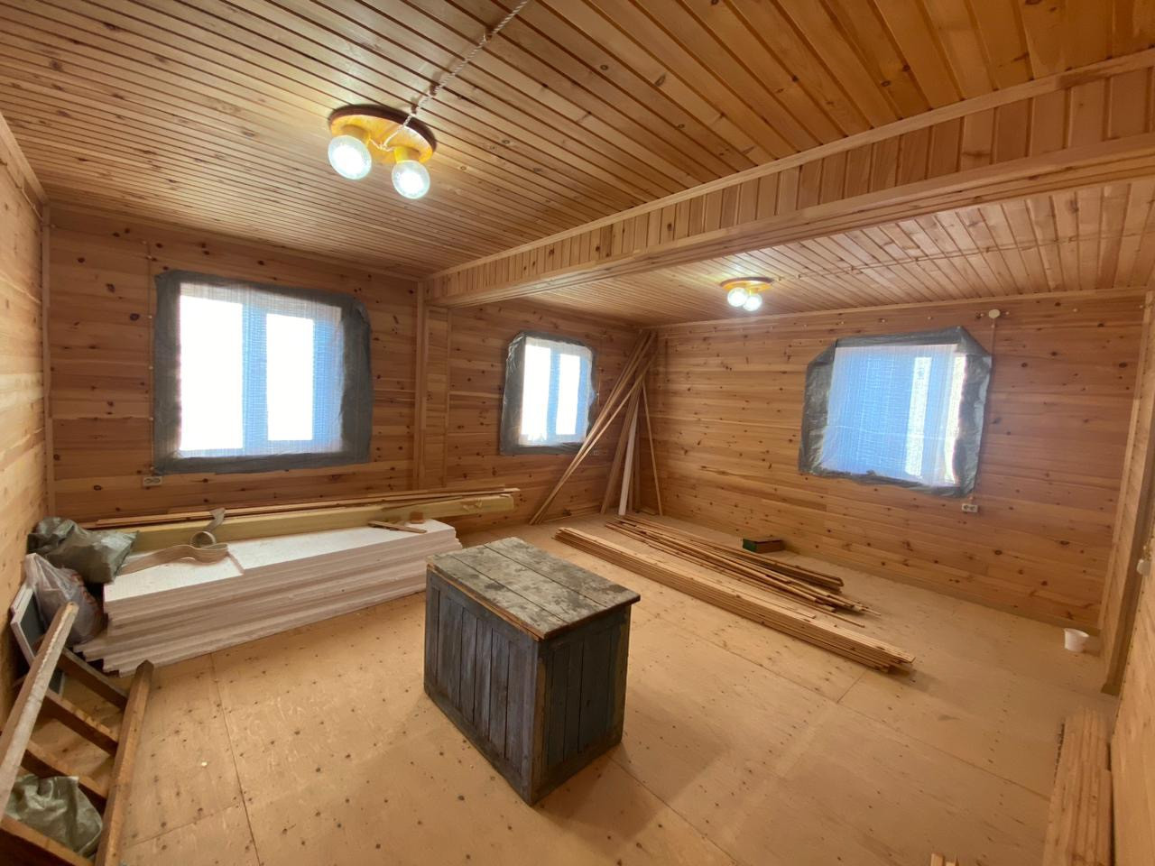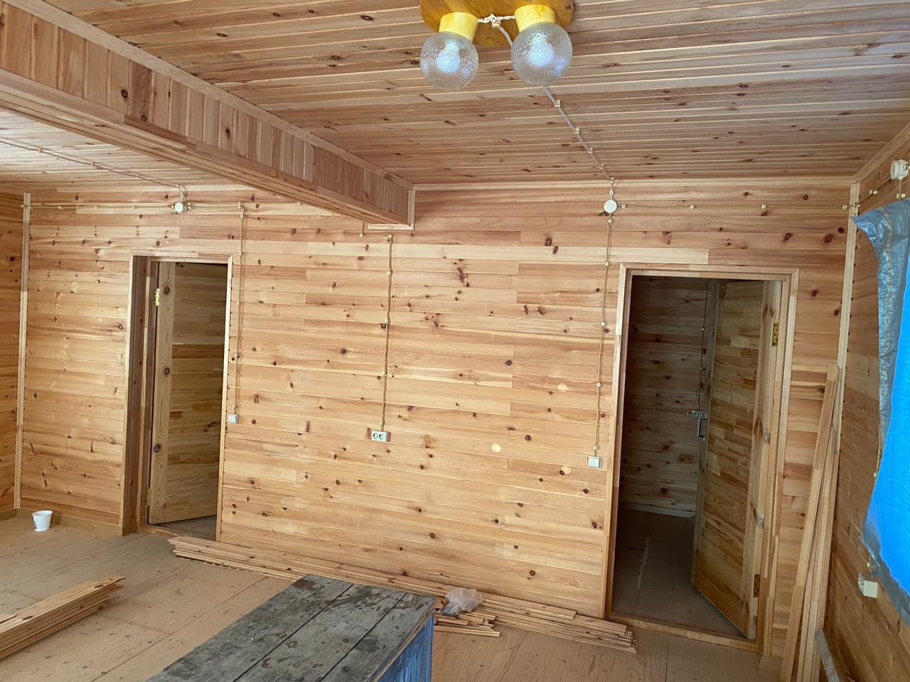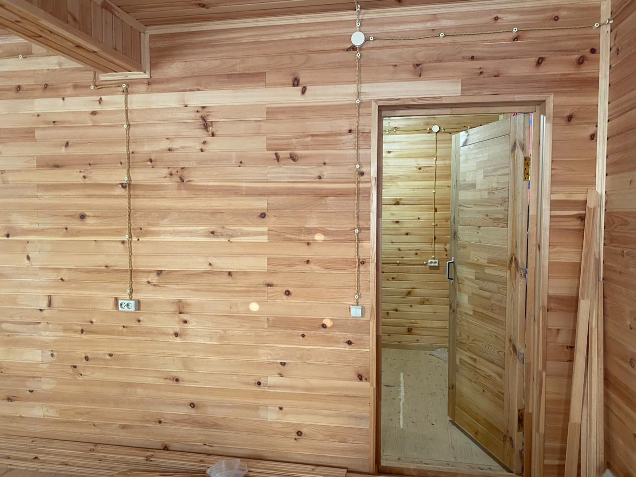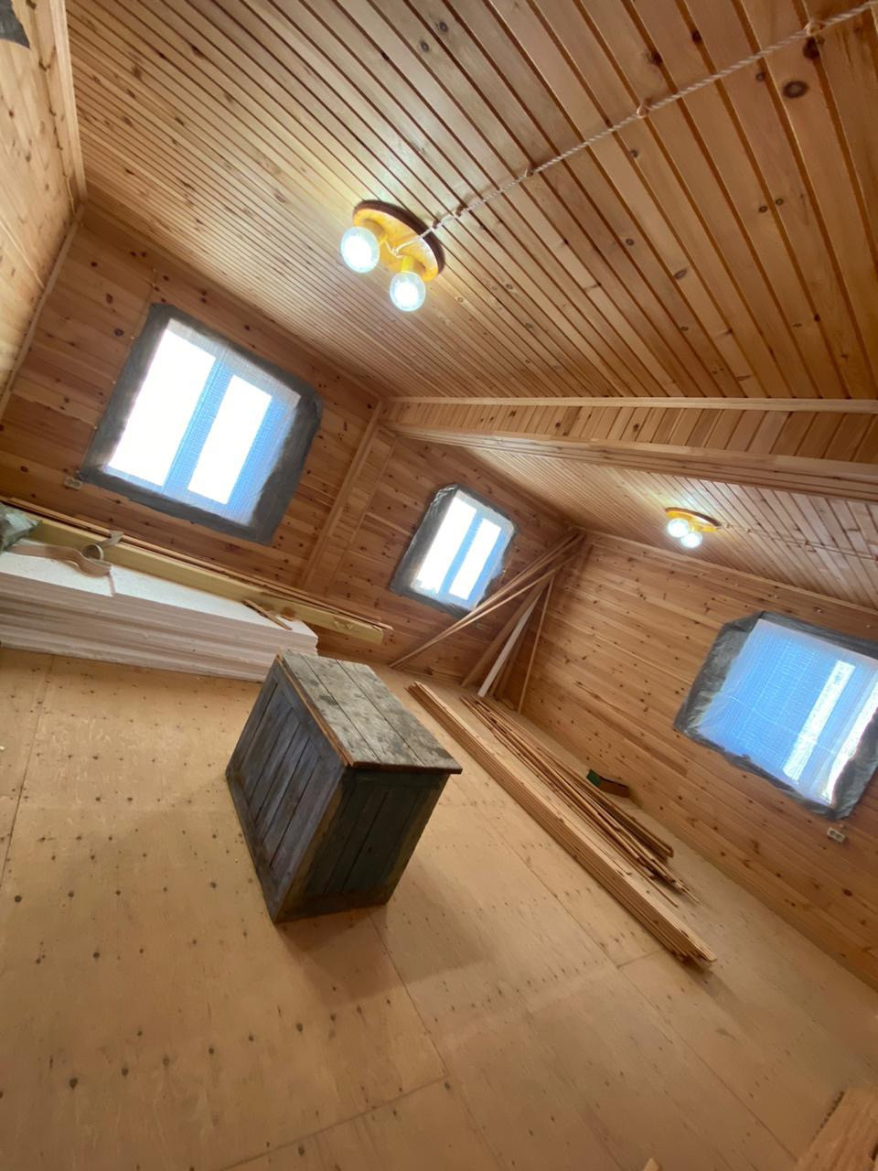 Дом построен из бруса. Стены обиты липовой рейкой. Разведена электрика. Окна ПВХ