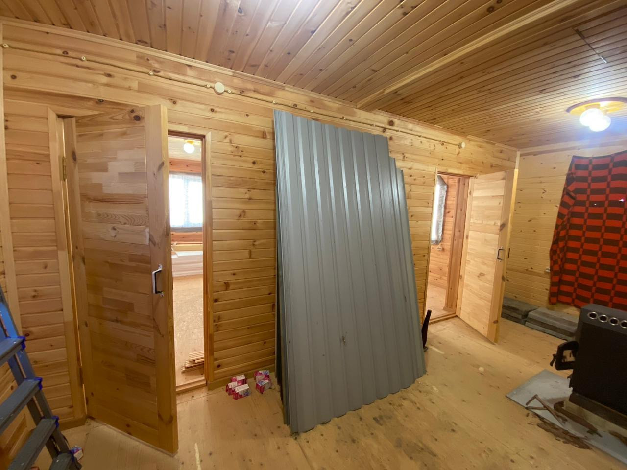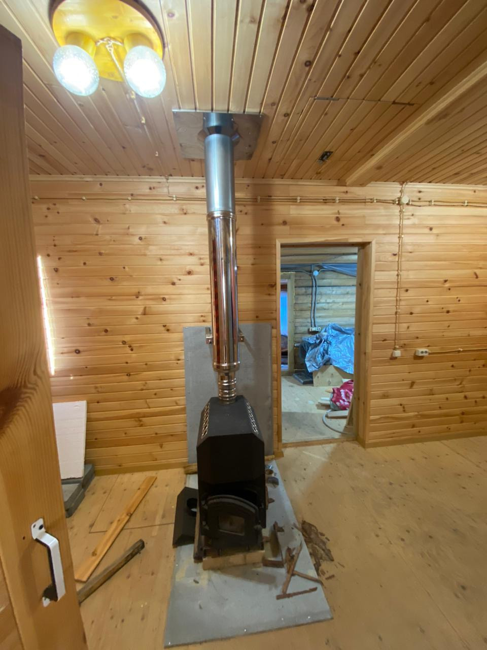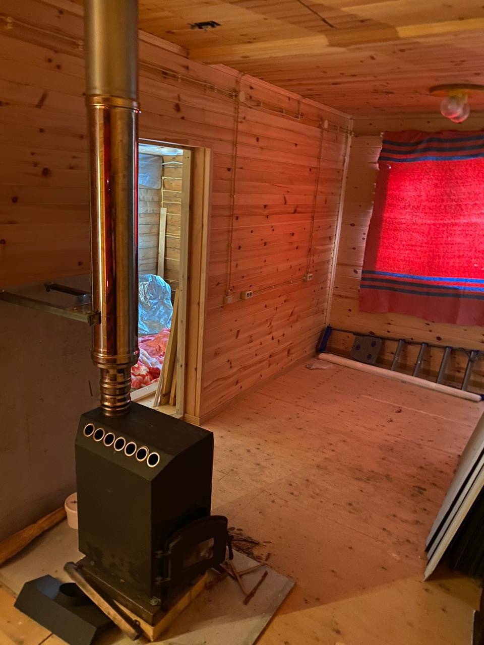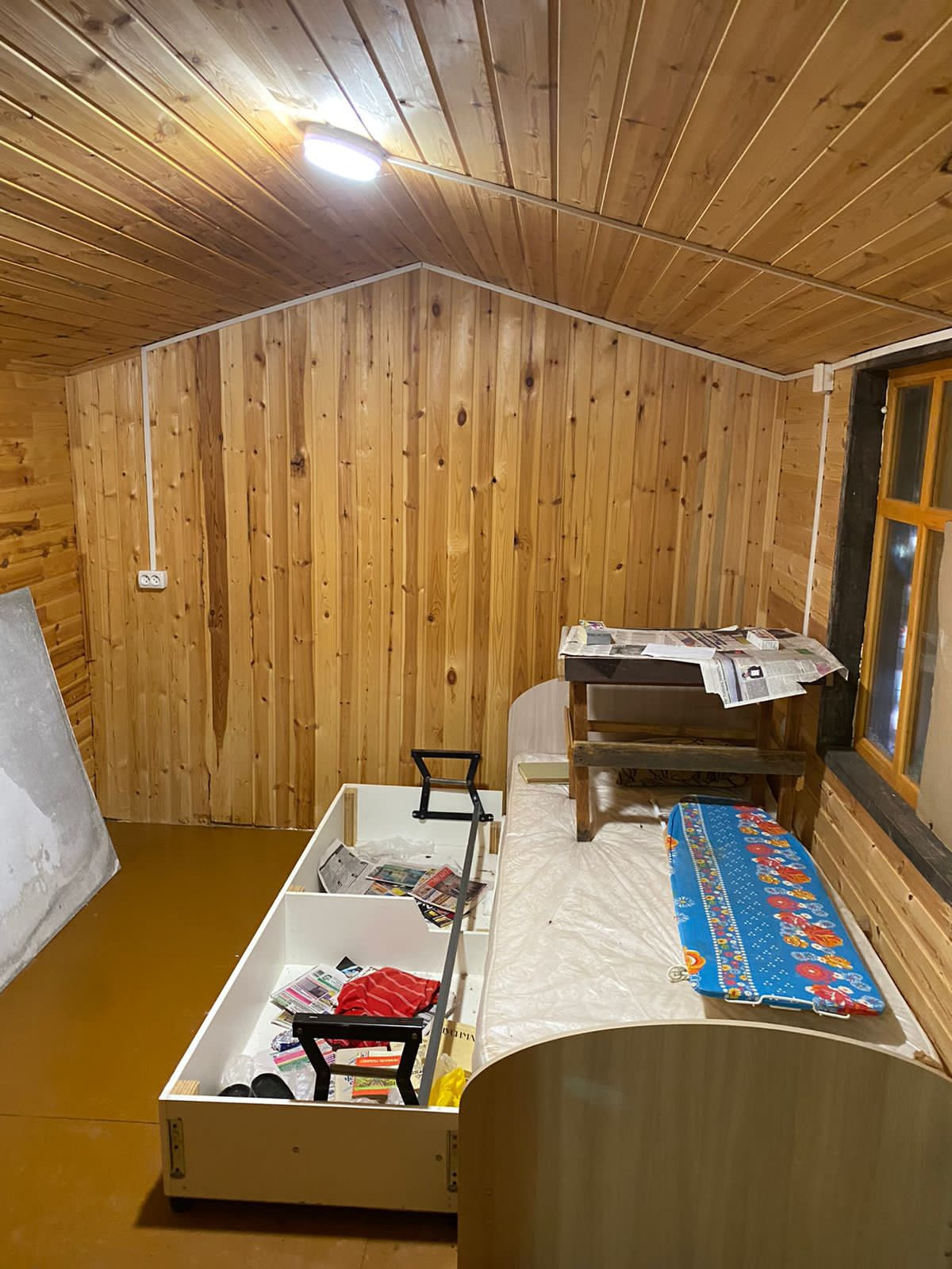 Дом построен из бруса. Стены обиты липовой рейкой. Разведена электрика. Окна ПВХ