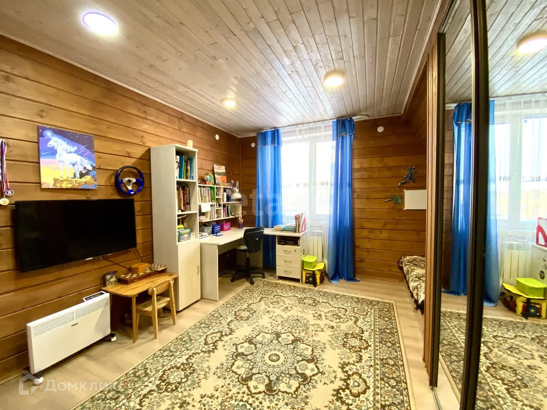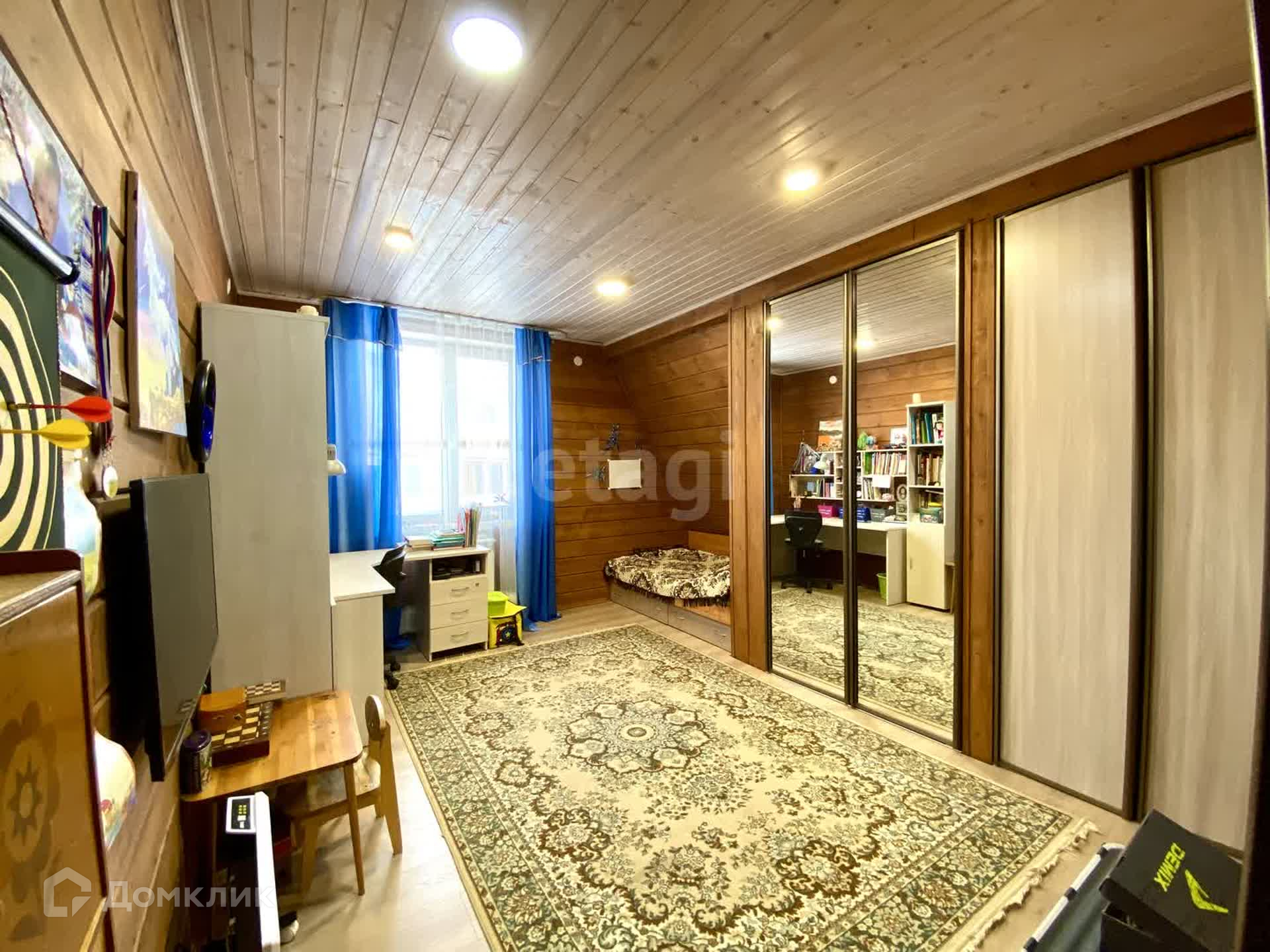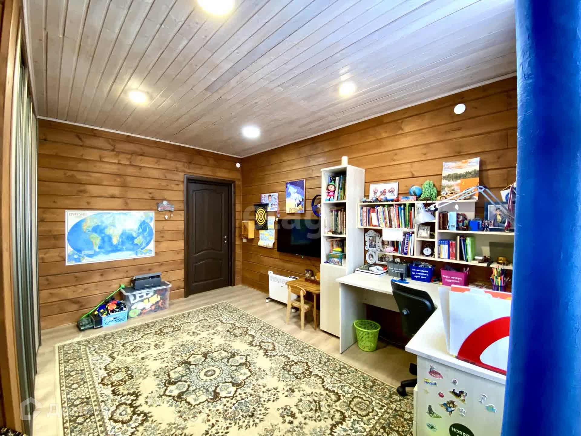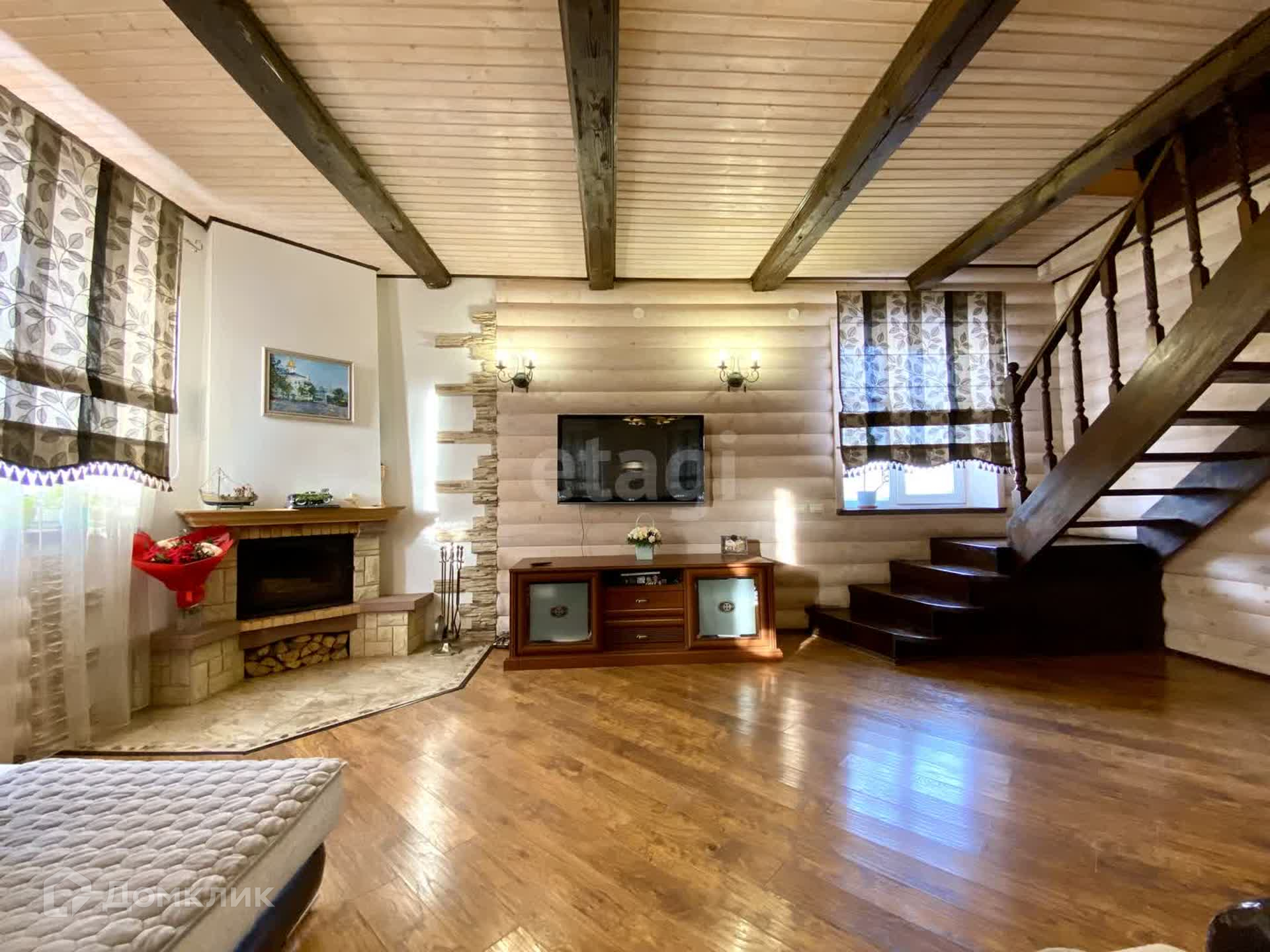 Планировка внутри: 5 жилых комнат, кладовая, 2 сан-узла, гостиная, просторные холл, гардеробная, котельная, бильярдная и спортивная комната, камин.