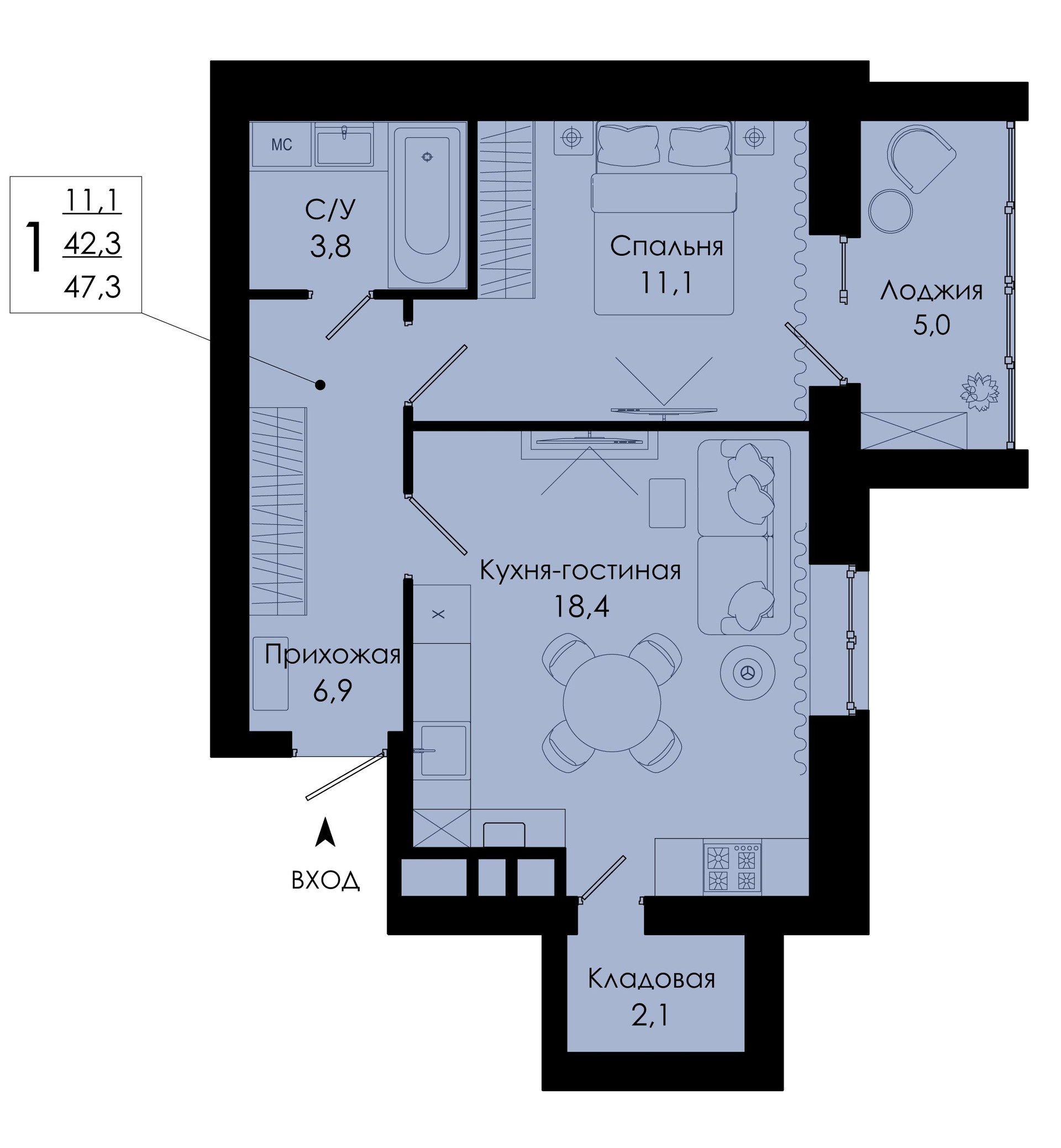 Общая площадь 47.3 м2