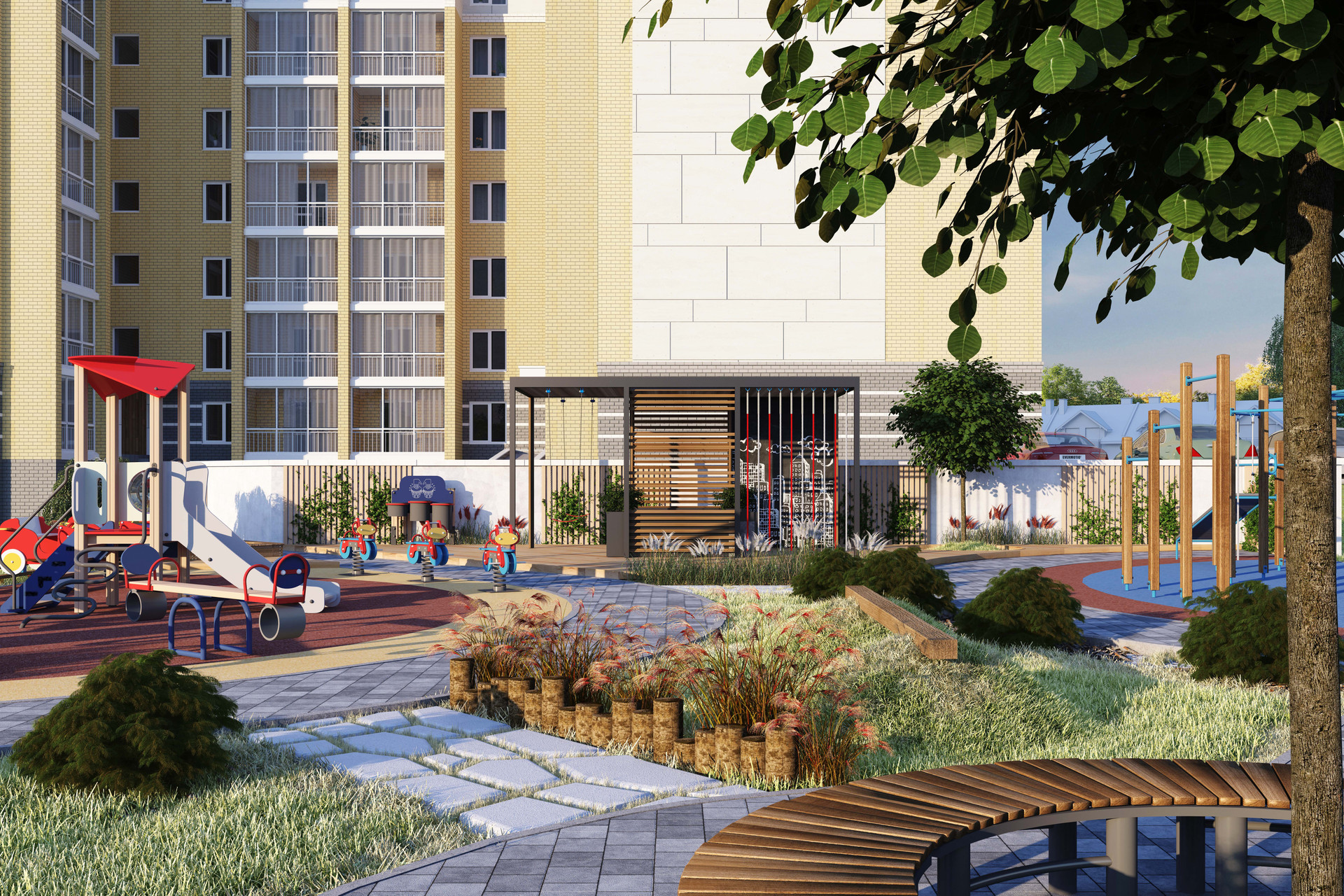 - Огороженная территория ЖК предназначена для семейного отдыха и игр детей. Благоустройство придомовой территории и ландшафтный дизайн продуманы как составляющие элементы комфортной среды проживания.
