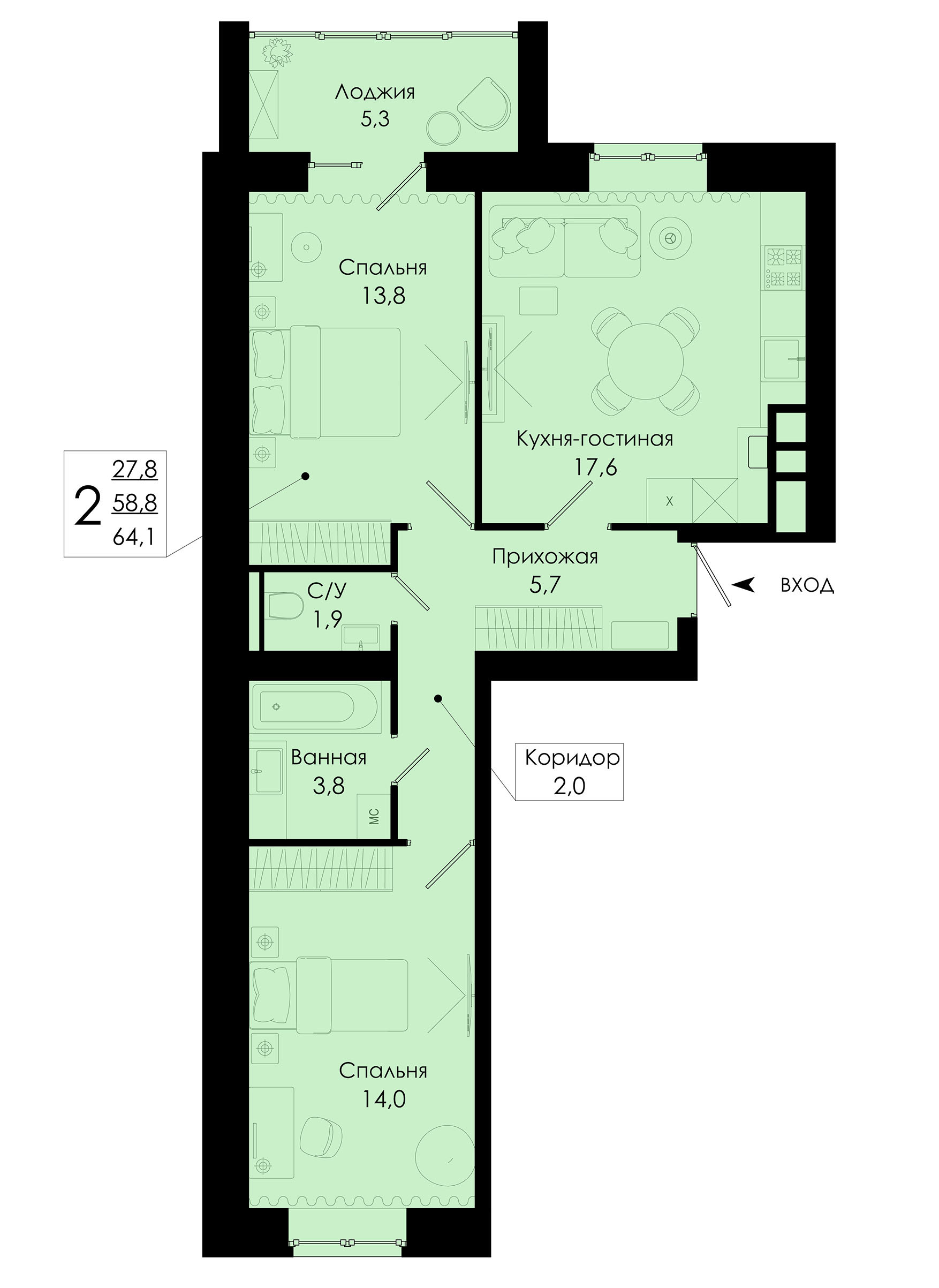 Общая площадь 64.1 м2