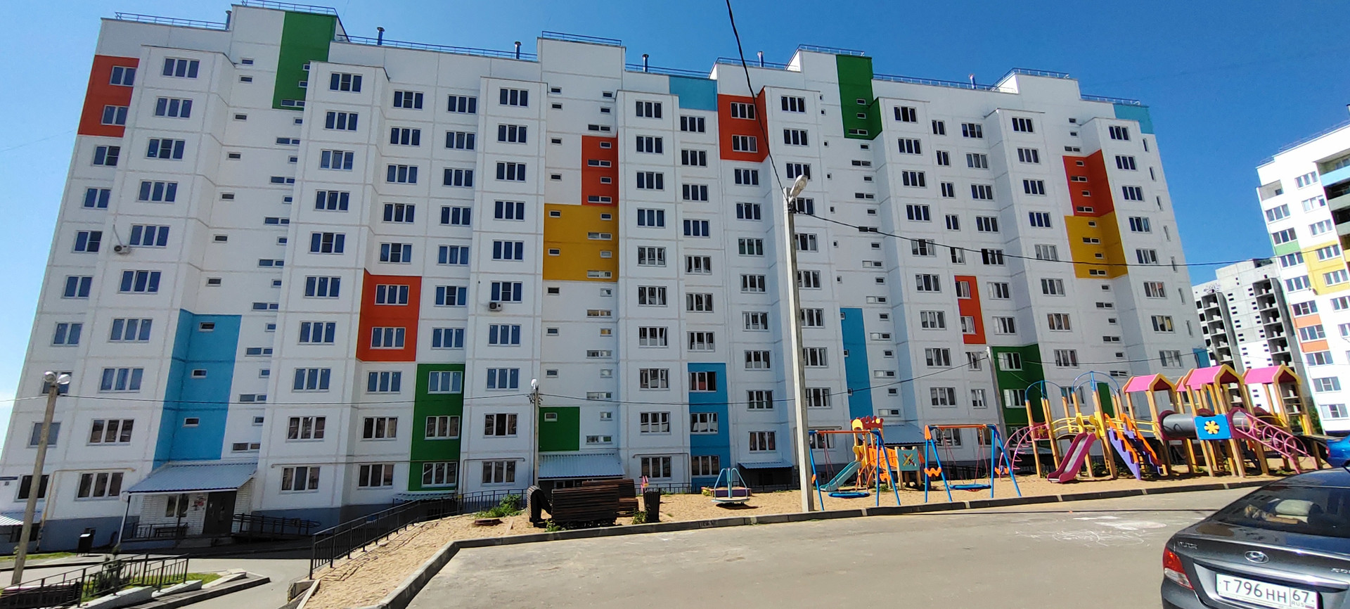 Дом сдан, придомовая территория обустроена, есть детские площадки, парковка.