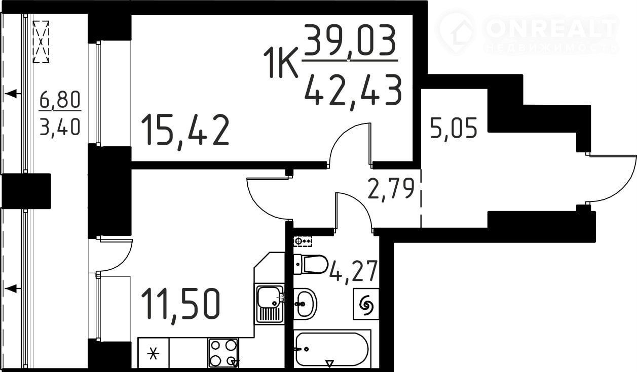 Общая площадь 42.4 м2