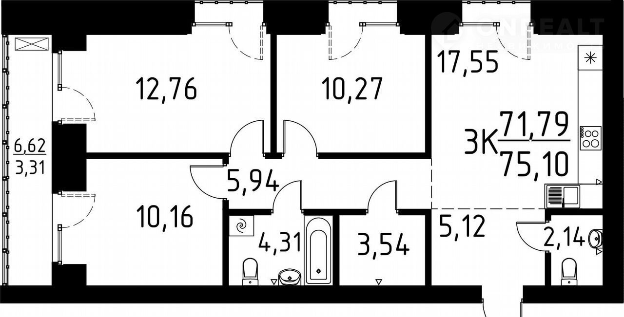 Общая площадь 75.1 м2