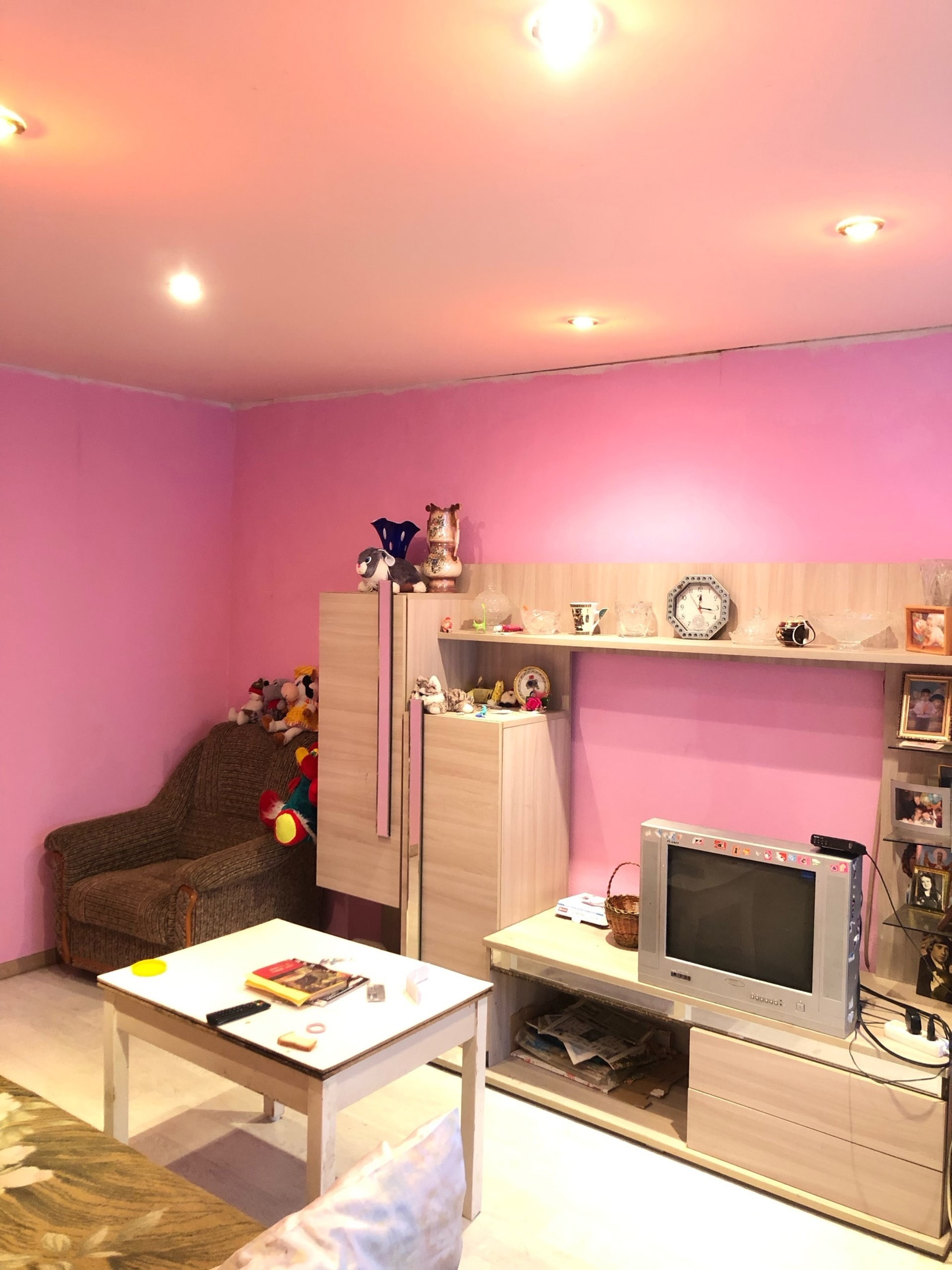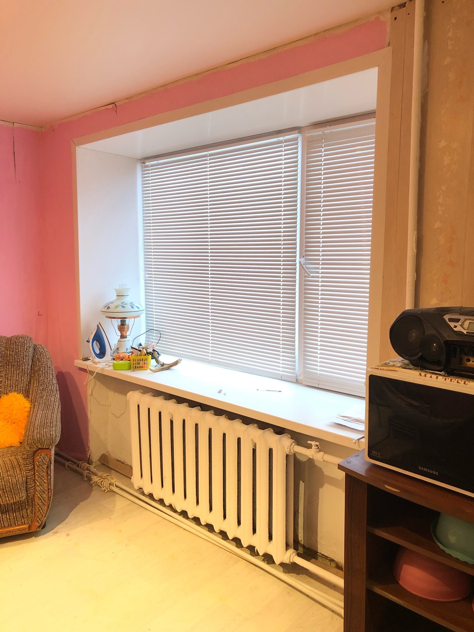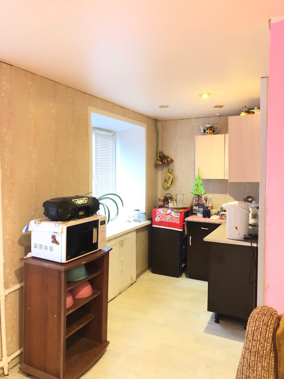 В квартире начат ремонт. В комнате и на кухне установлены стеклопакеты, сделан натяжной потолок.