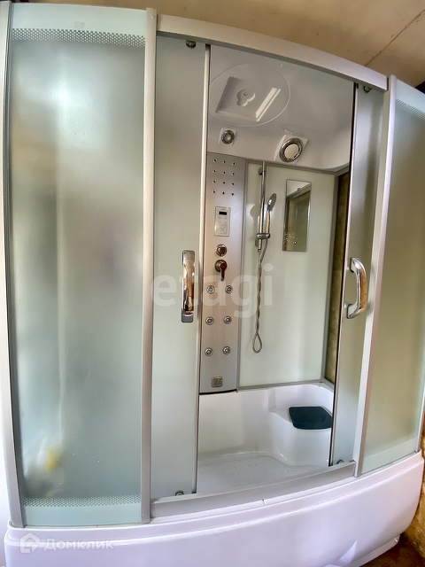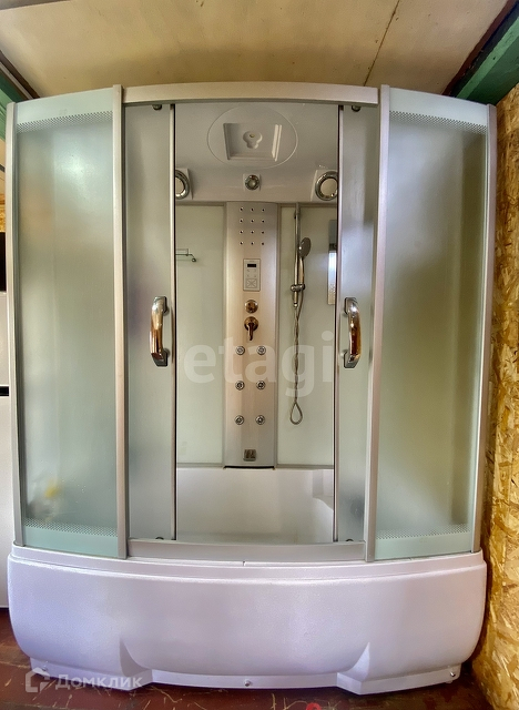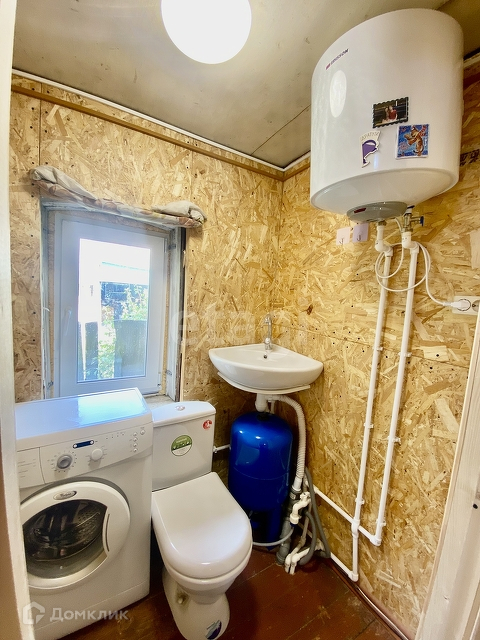 большая душевая кабина-ванна, туалет, 2 раковины, водонагревательный бак, есть место для подключения стиральной машинки.