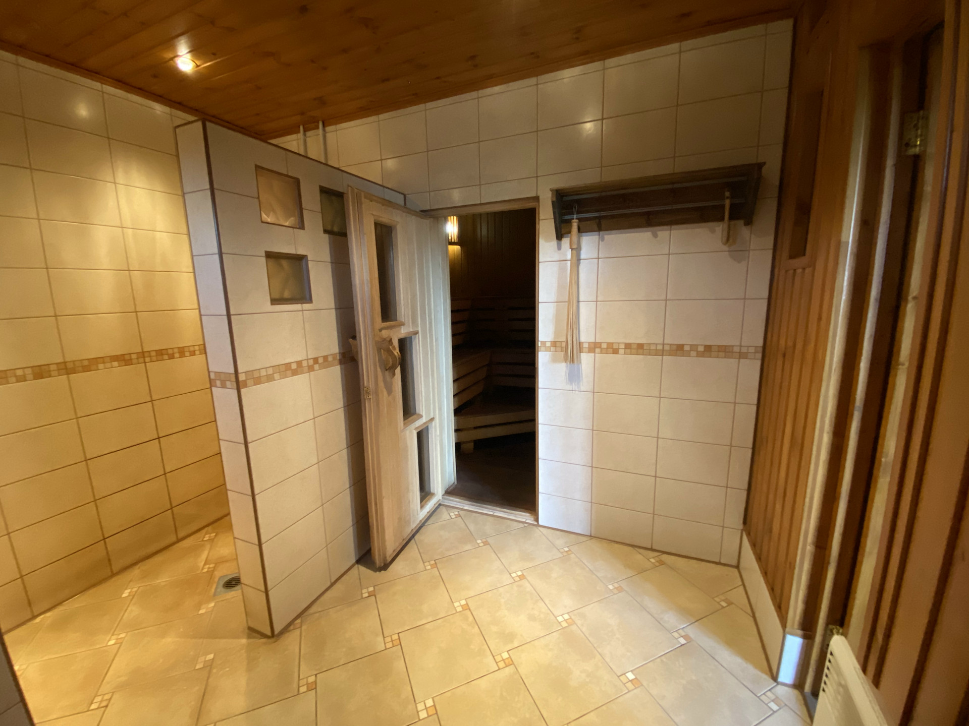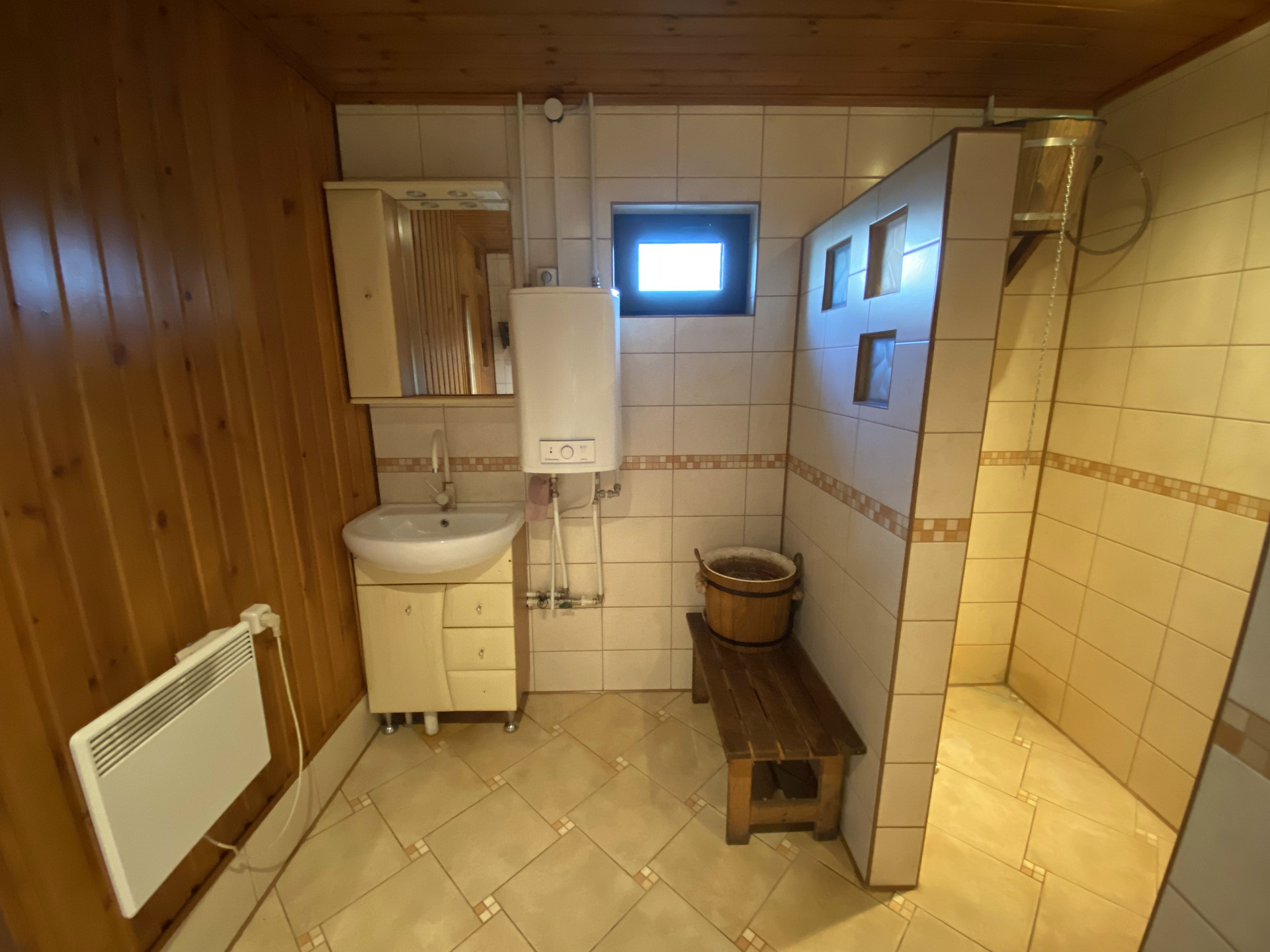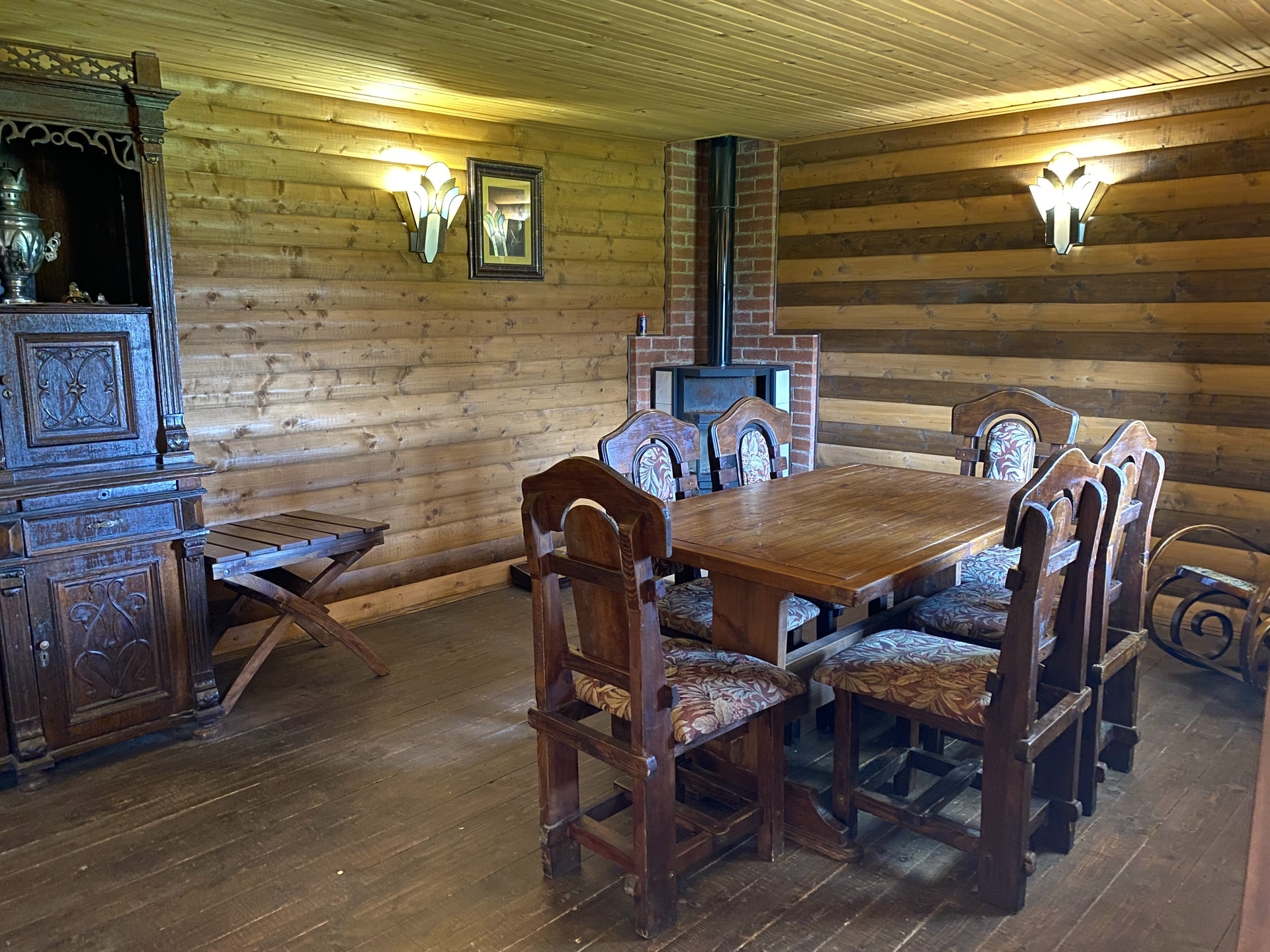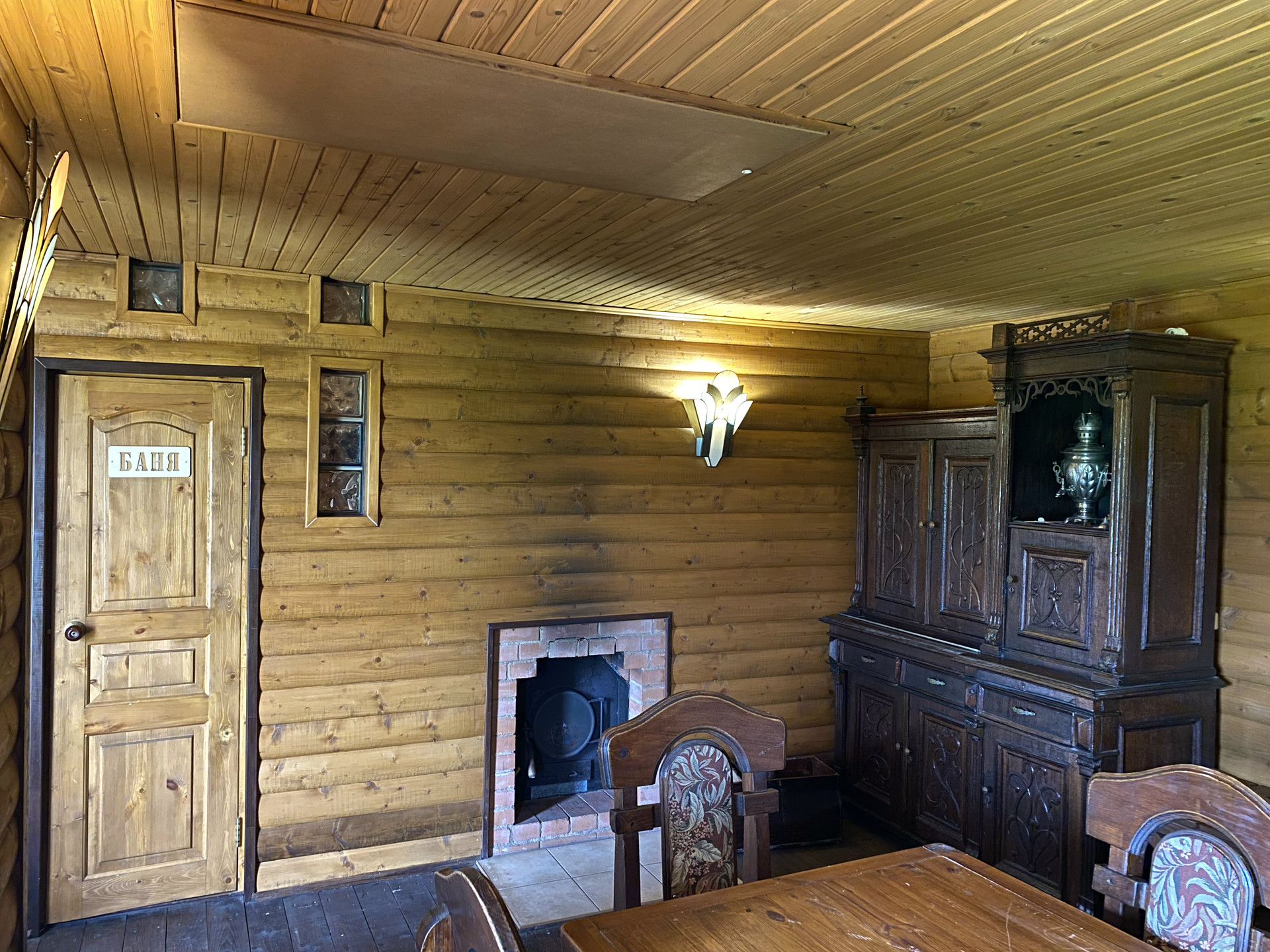 Баня на дровах 44.6 кв.м. , просторная парная, большой предбанник с камином и мебелью из натурального дерева, душевая.