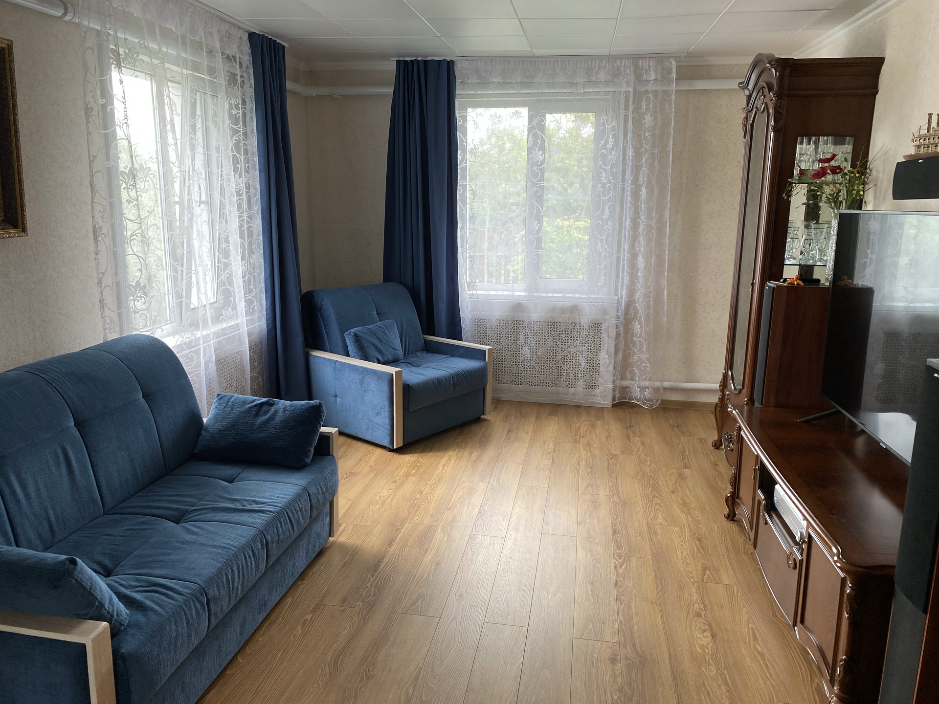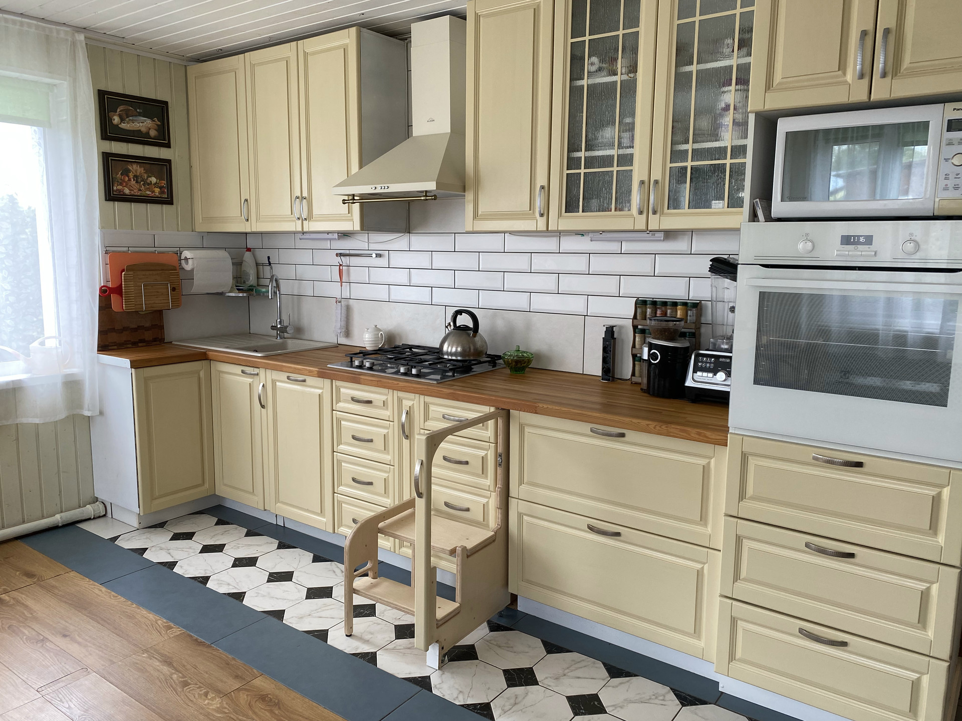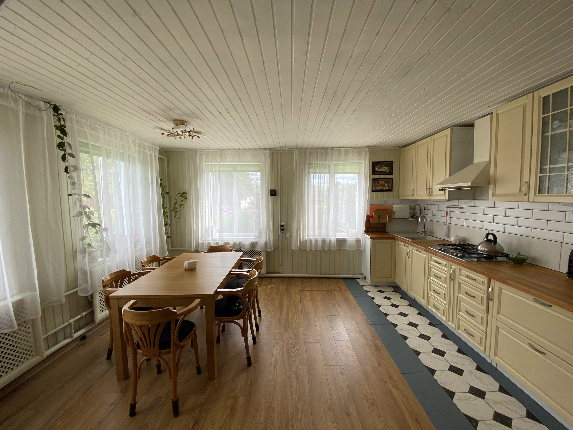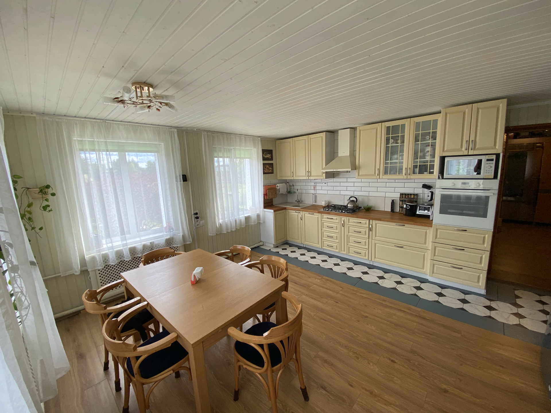 - большая светлая кухня-столовая 22 кв.м со свежим ремонтом и новым кухонным гарнитуром с техникой, есть микроволновка, посудомоечная машина, электрический духовой шкаф, холодильник. Так же выход в гараж и на 2 этаж
