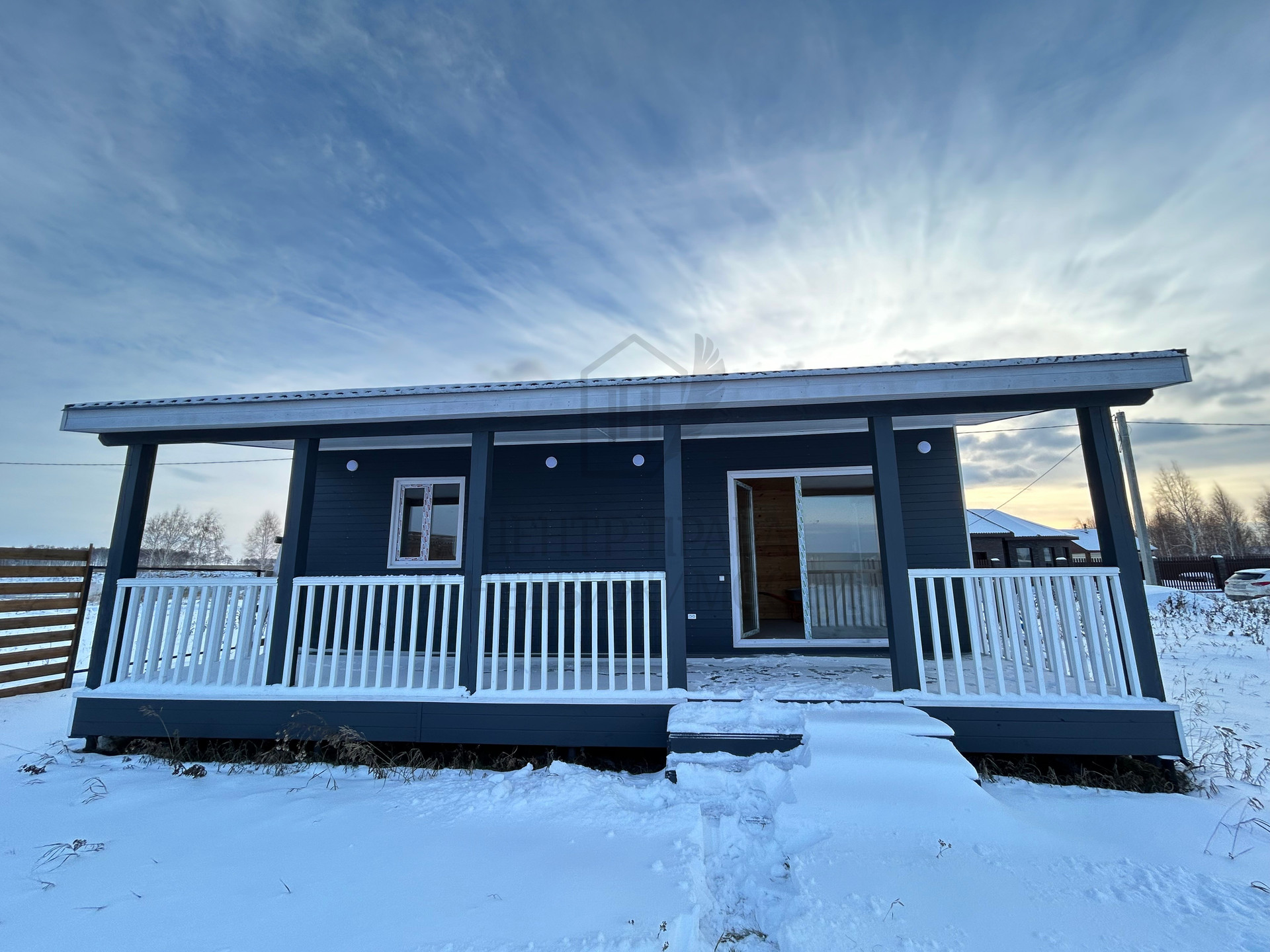 В доме три комнаты: кухня-гостиная (18,1 кв.м.), две спальни (по 9 кв.м. каждая), совмещенный санузел (6,1 кв.м.), большая терраса под навесом с электроосвещением (22,5 кв.м.).
