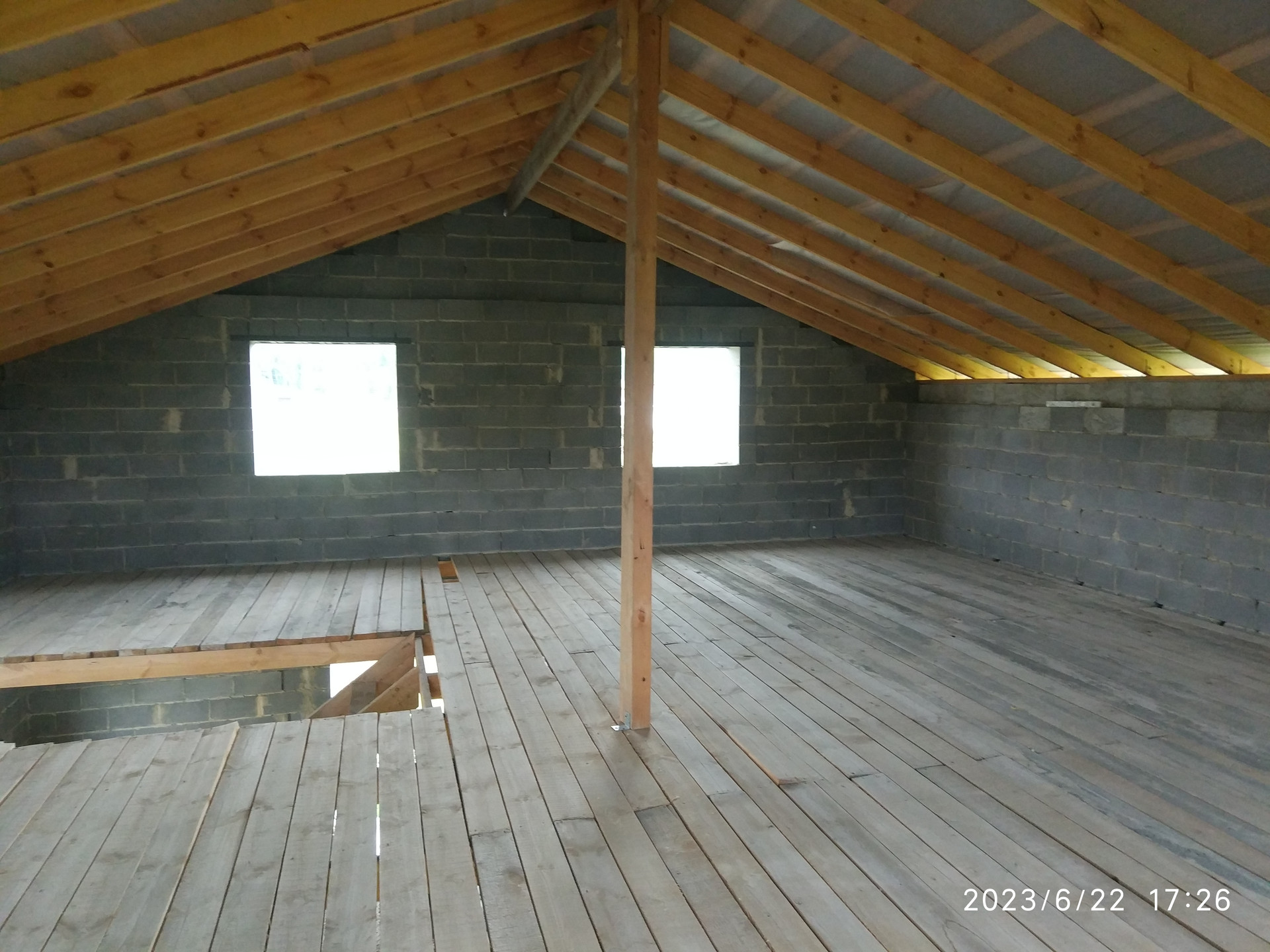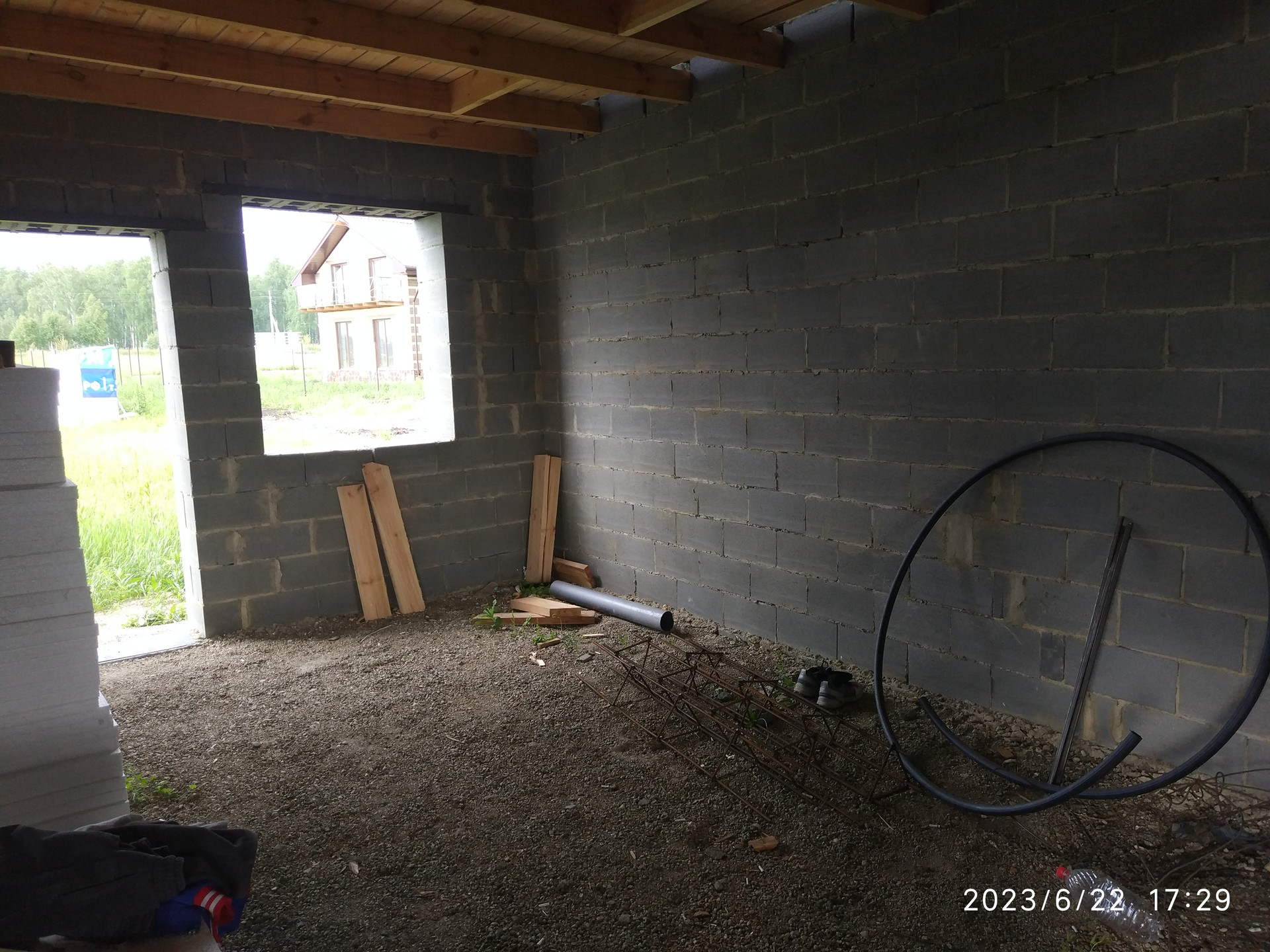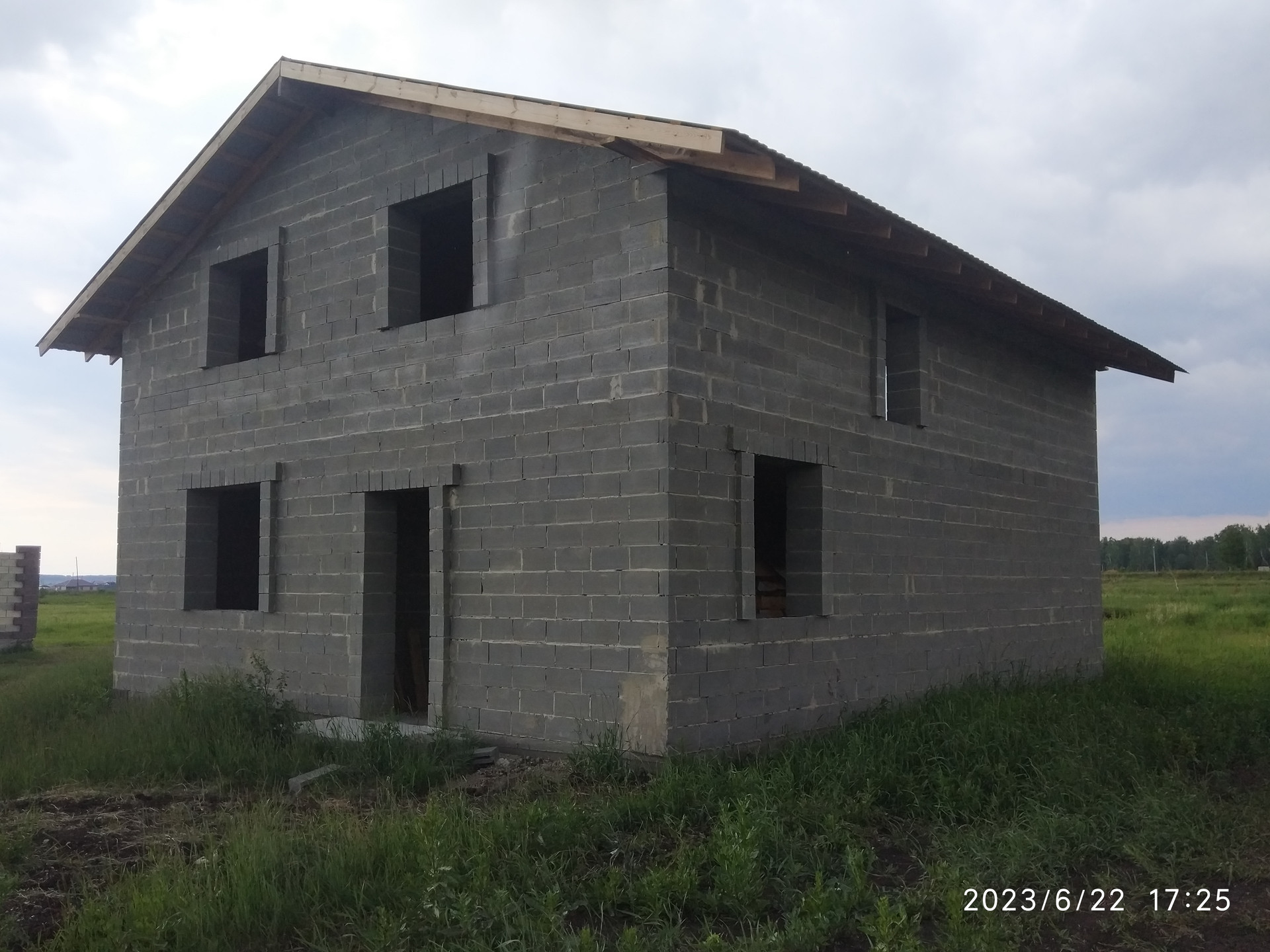 Дом построен на свайно-ленточном фундаменте(22 сваи по 2,5 метра), сделана внутренняя отсыпка, материал стен теплоблок ( трёхслойная стена, очень энергоэфективный) никакого утепления не требуется, на втором этаже пола с доски, дом возведён под крышу.