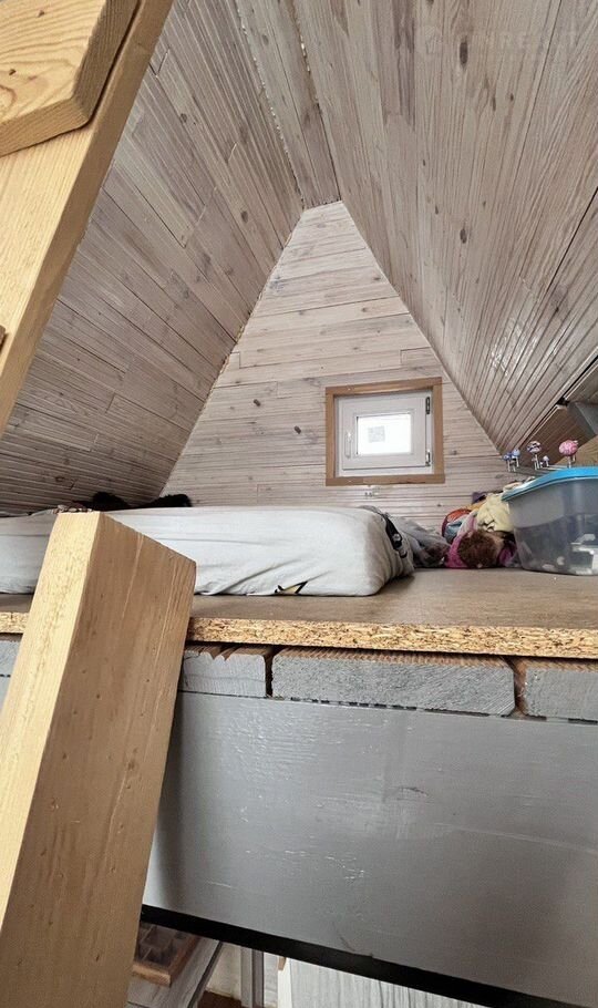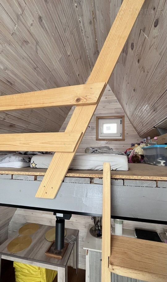 Первый этаж кухня-гостинная, на втором этаже детская, лестница из сосны